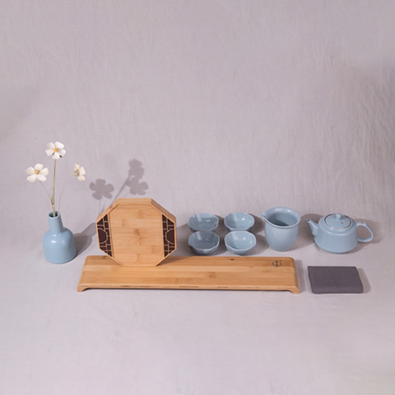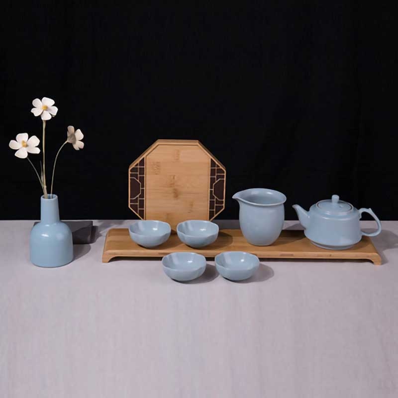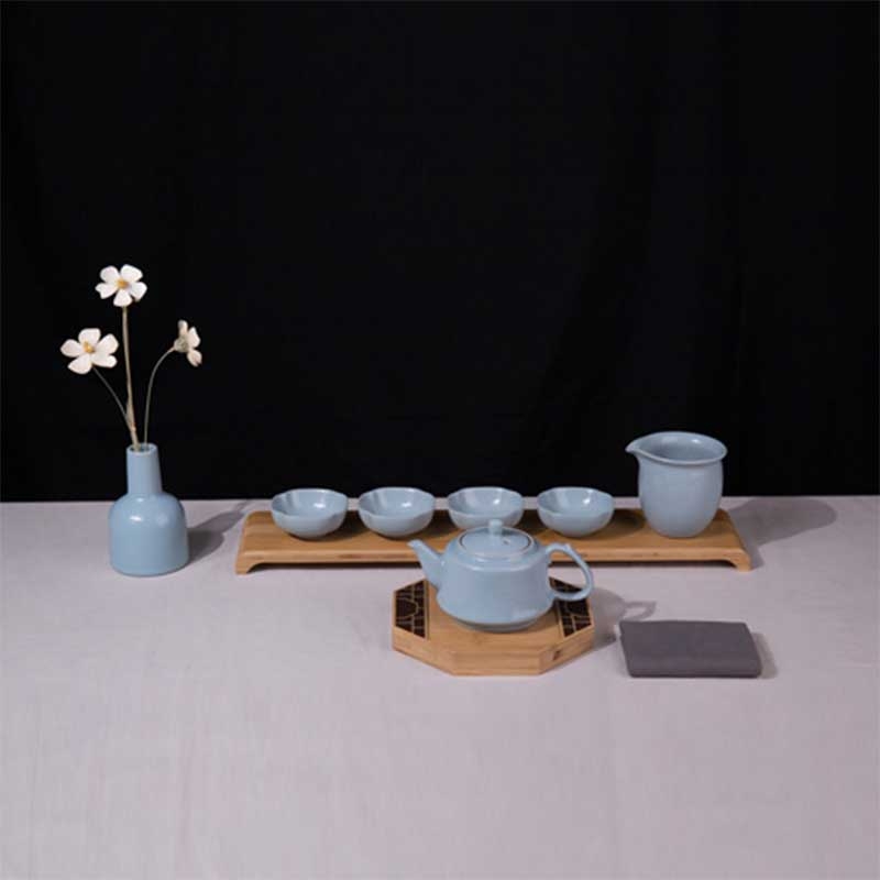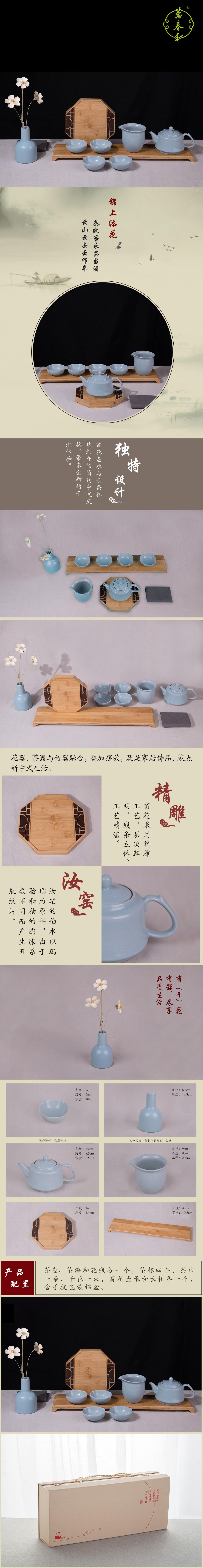 窗花壶承与长条杯垫结合的简约中式风格,带来全新的干;花器、茶器与竹器融合,叠加摆放,可做家居饰品。;窗花上精雕工艺层次鲜明、线条立体、工艺精湛。;汝窑釉水以玛瑙为原料,由于胎和釉的膨胀系数不同而产