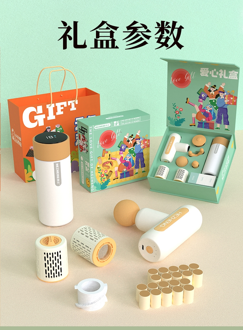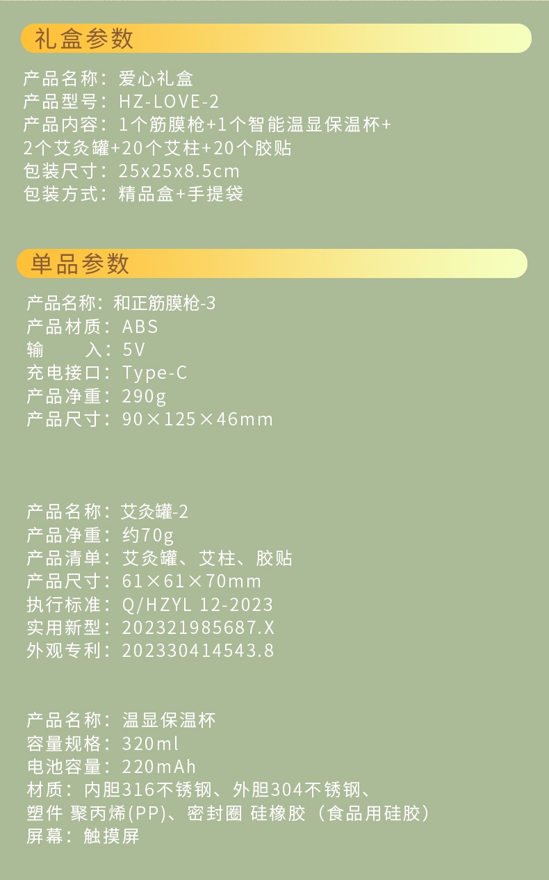 配置:1个筋膜枪+1个智能温显保温杯+2个艾灸罐+20个艾柱+20个胶贴