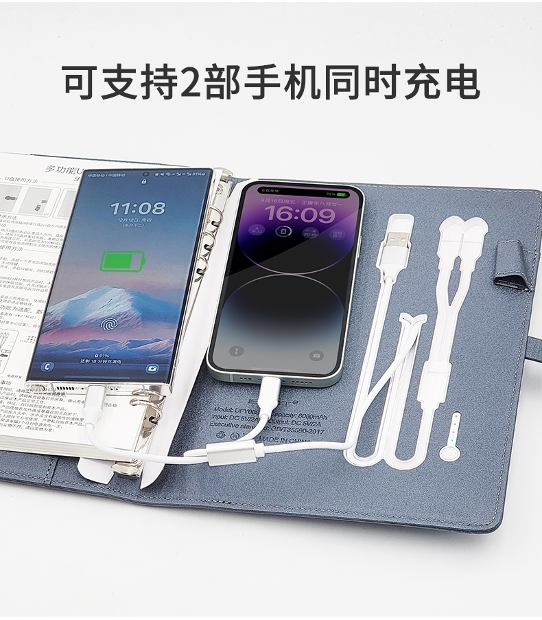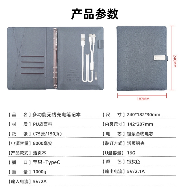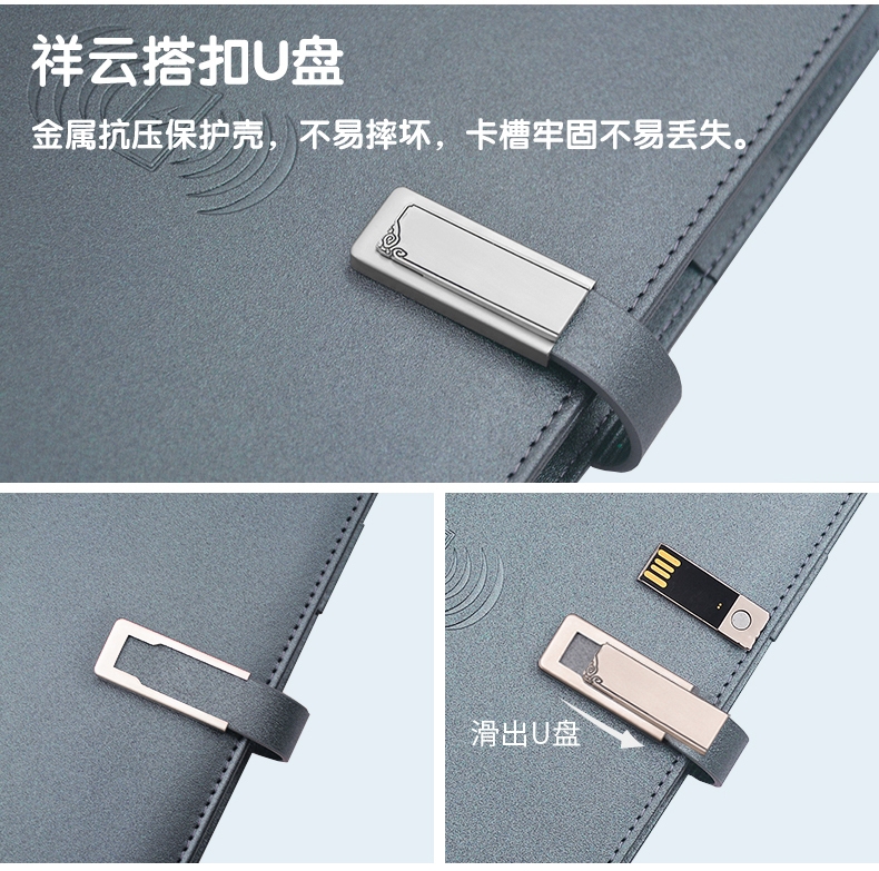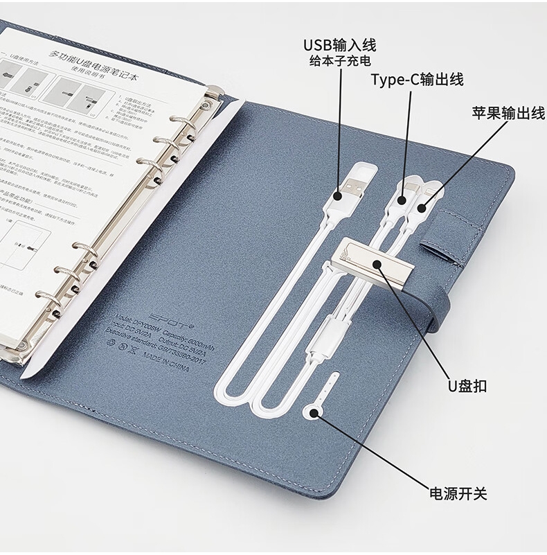 创意便携式U盘,足容量原装高速芯片;A5活页笔记本、多功能卡位;内置电源,自带三种输出接头;支持定制logo