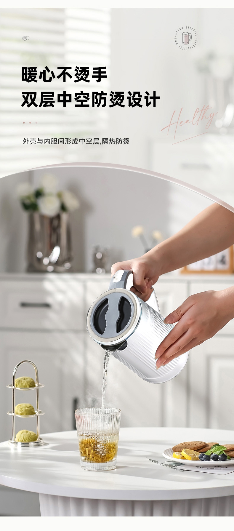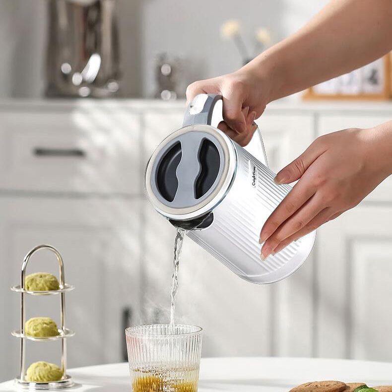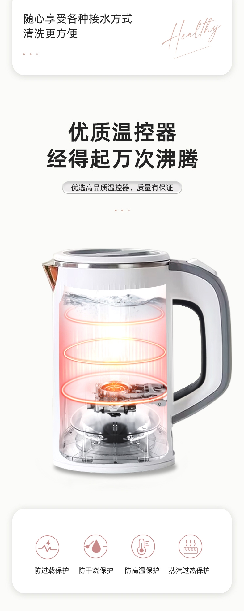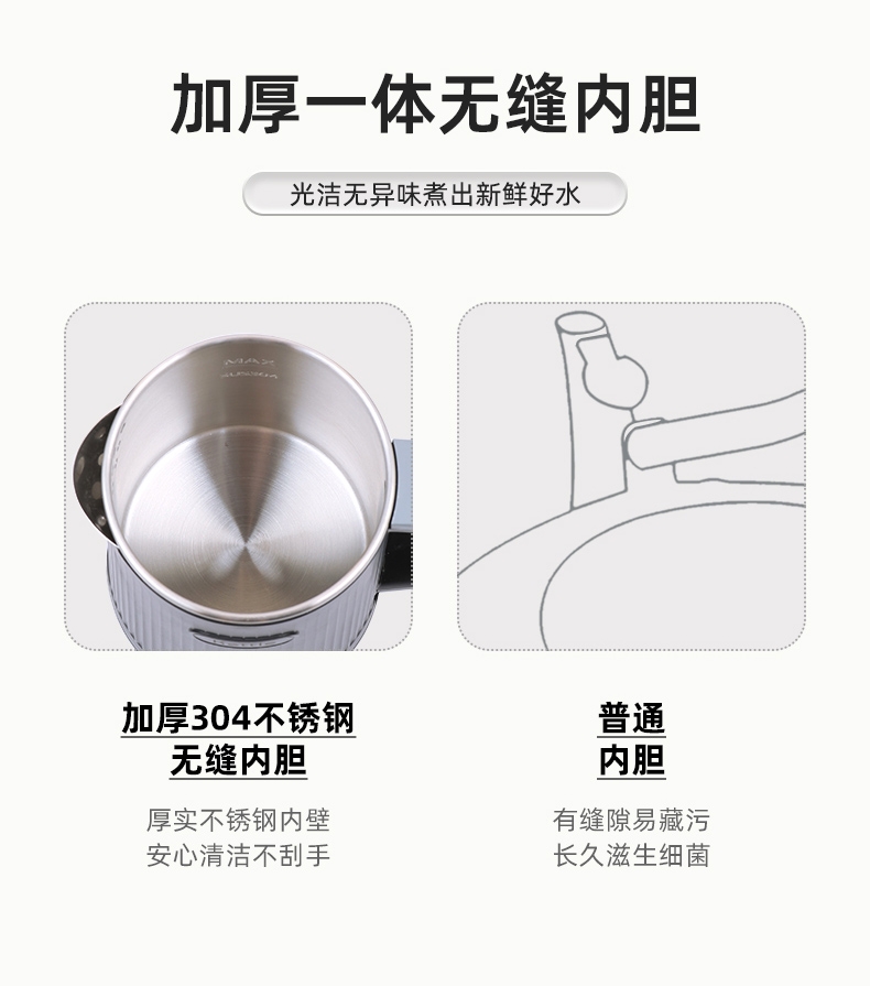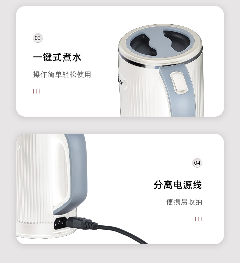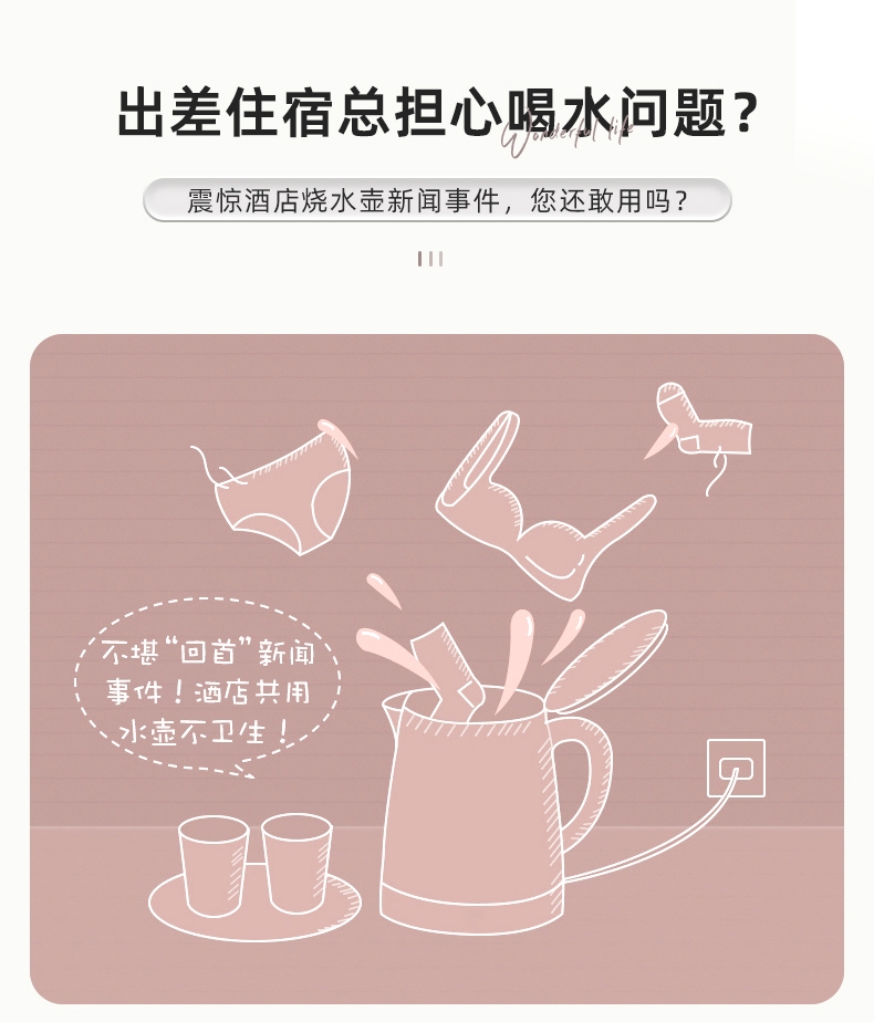 轻装出行,旅途也有舒心热饮;拔盖设计,轻松接水易清洁; 优质温控器,经得起万次沸腾
