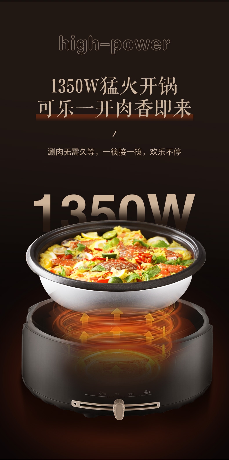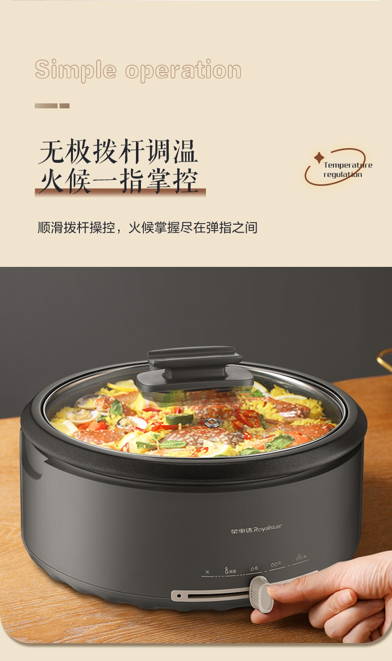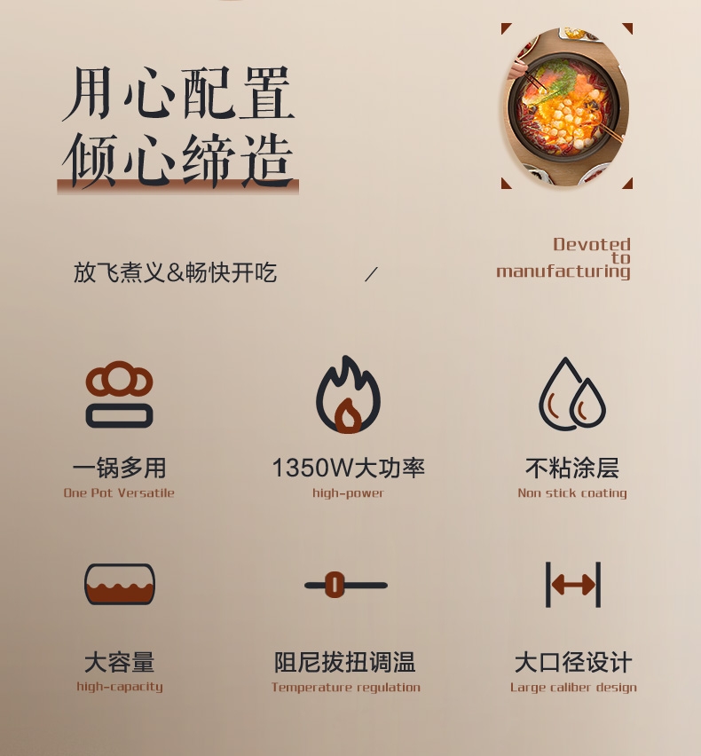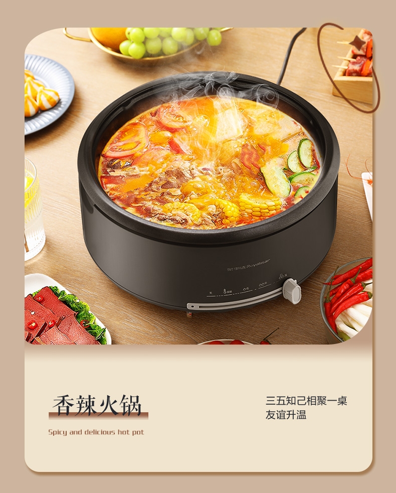 电热火锅功能:蒸,炒,炸,煎,煮,炖,焖,火锅,煮面,煲汤