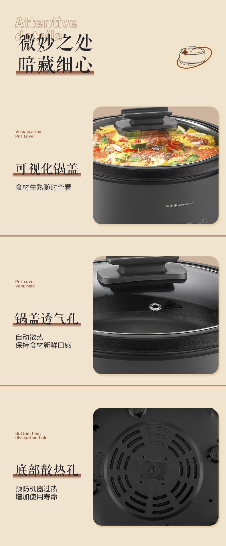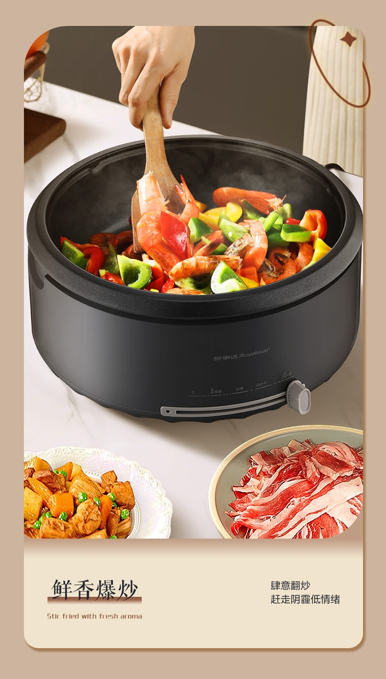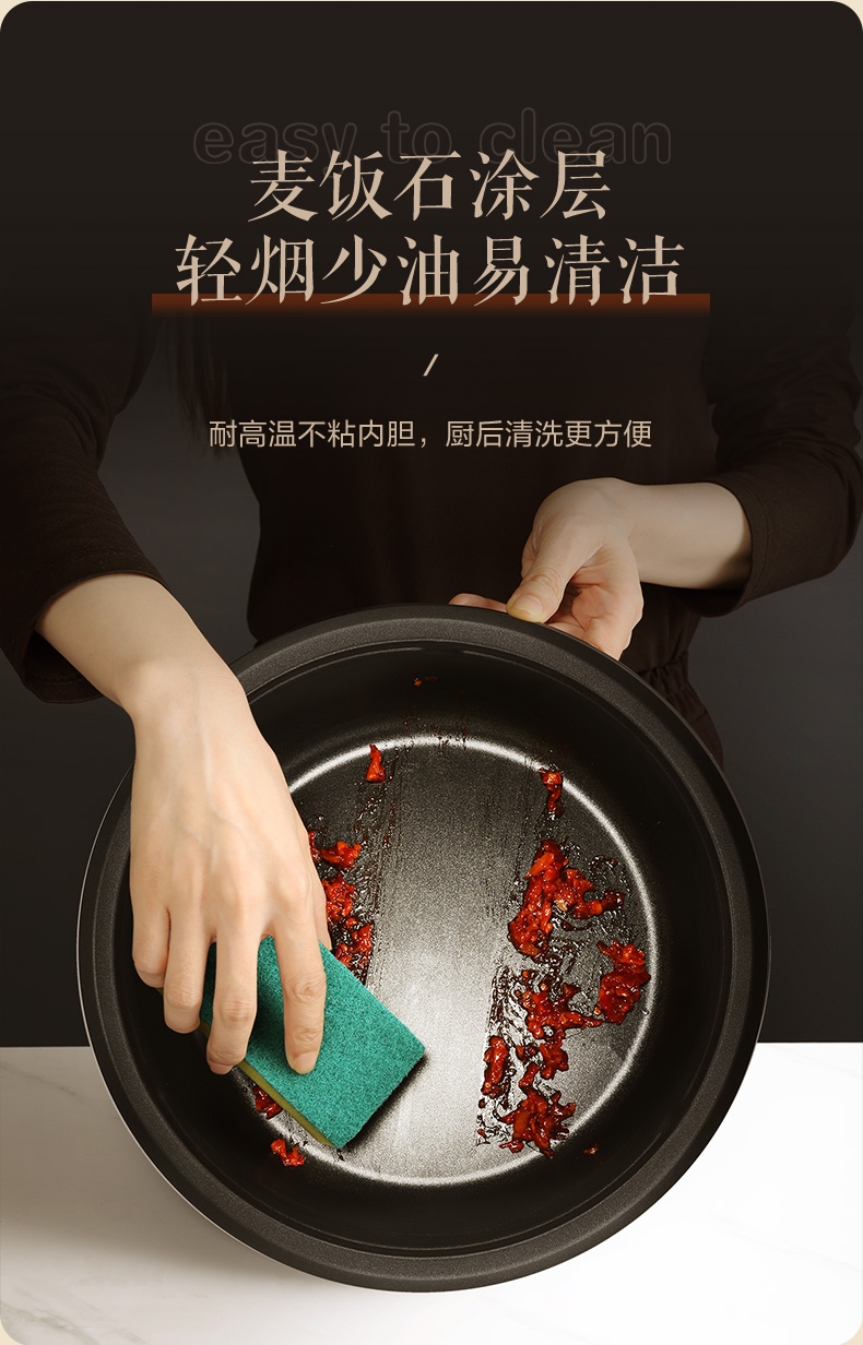 双层分体设计,便捷清洗;4.0L家庭式容量,27cm大口径自由翻炒不糊底; 1360W环形快速加热,速热更均匀,无需久等;一机多用,蒸、煮、涮、煎、火锅,蒸煮煎功能合一;锅底不粘设计,轻油少烟