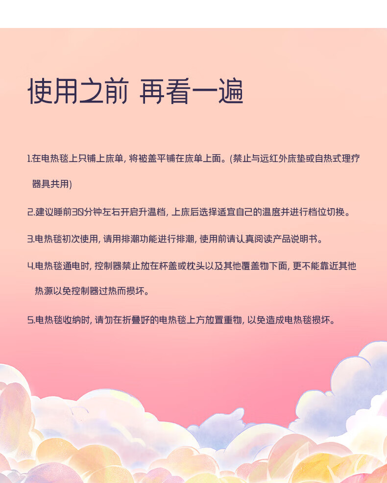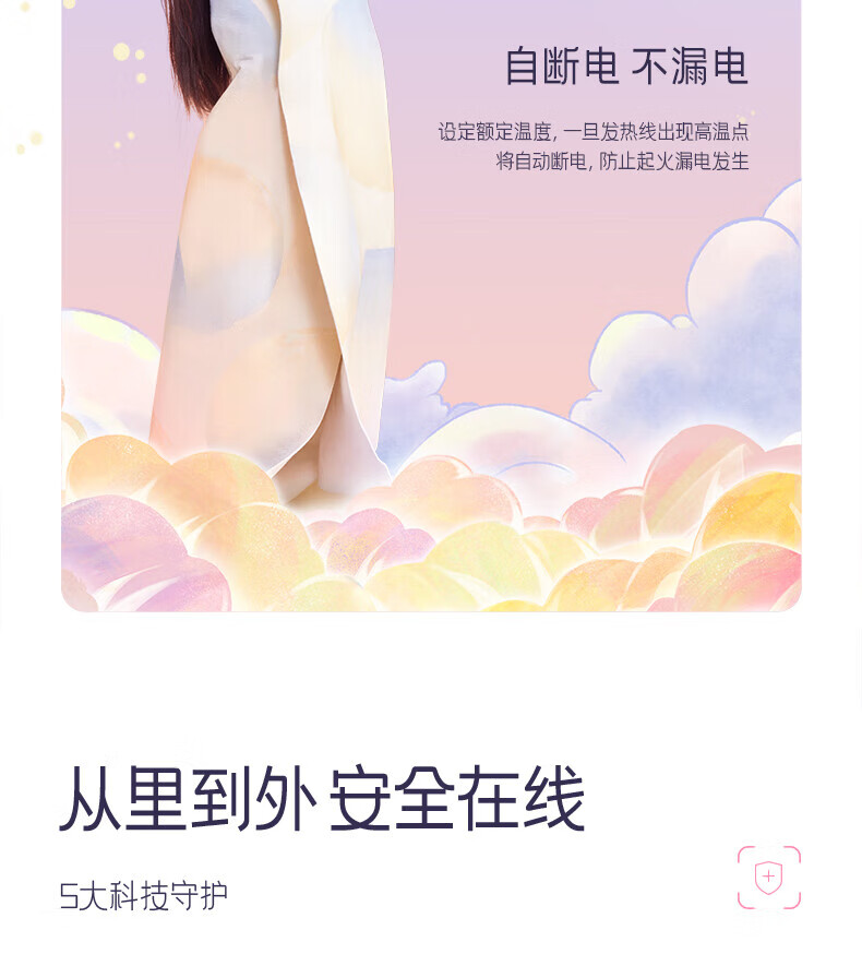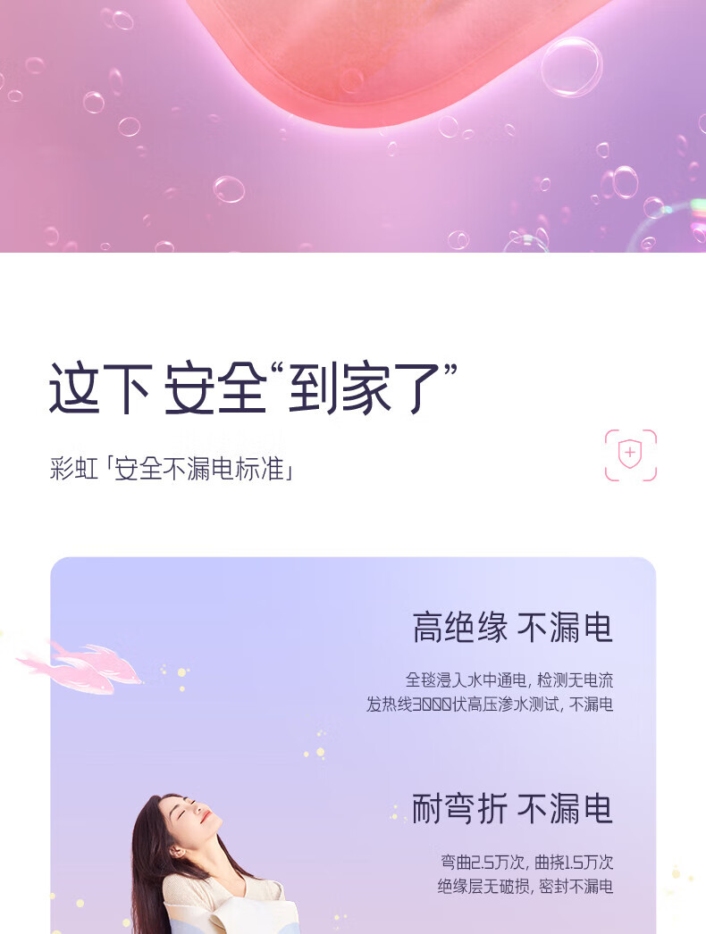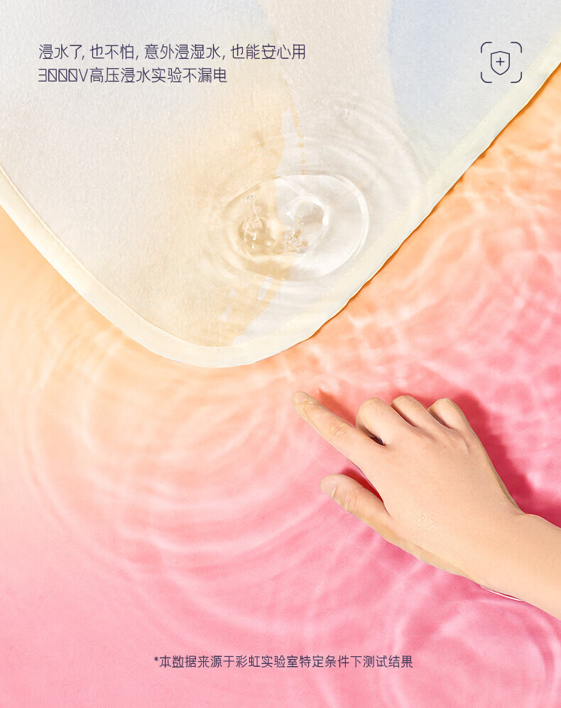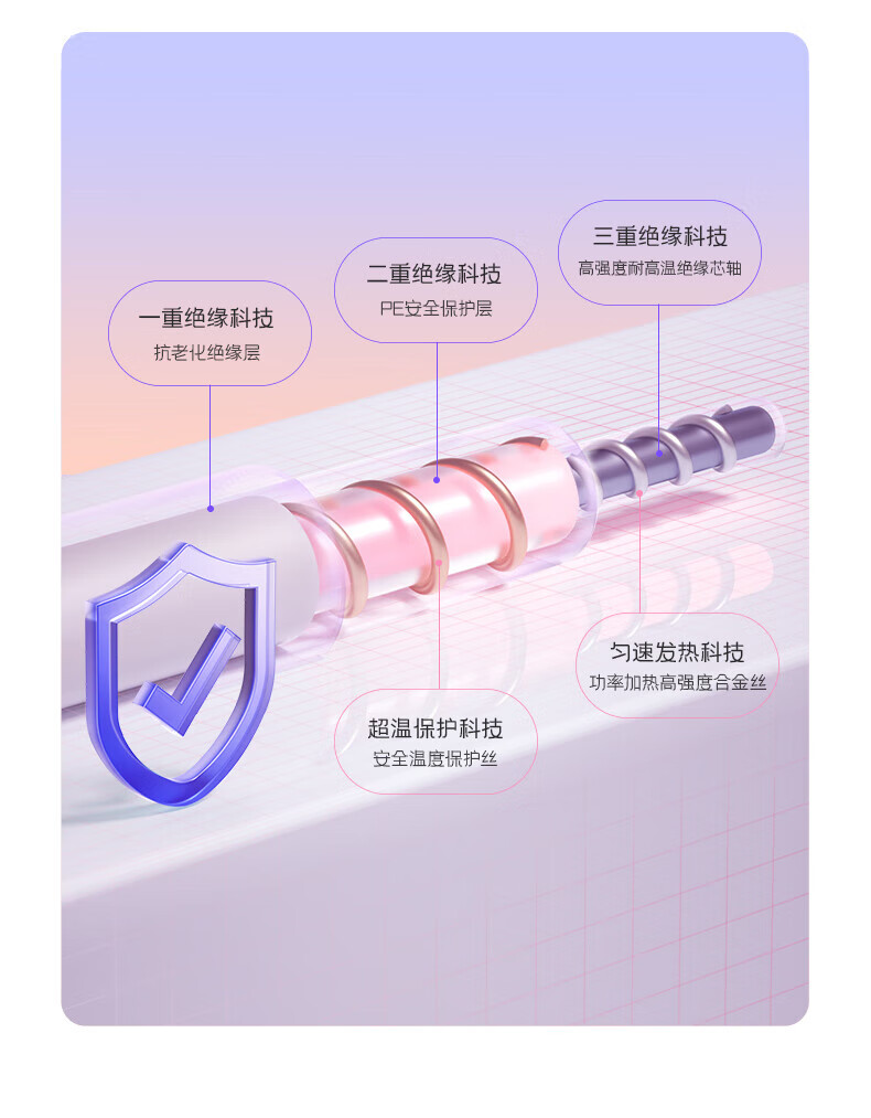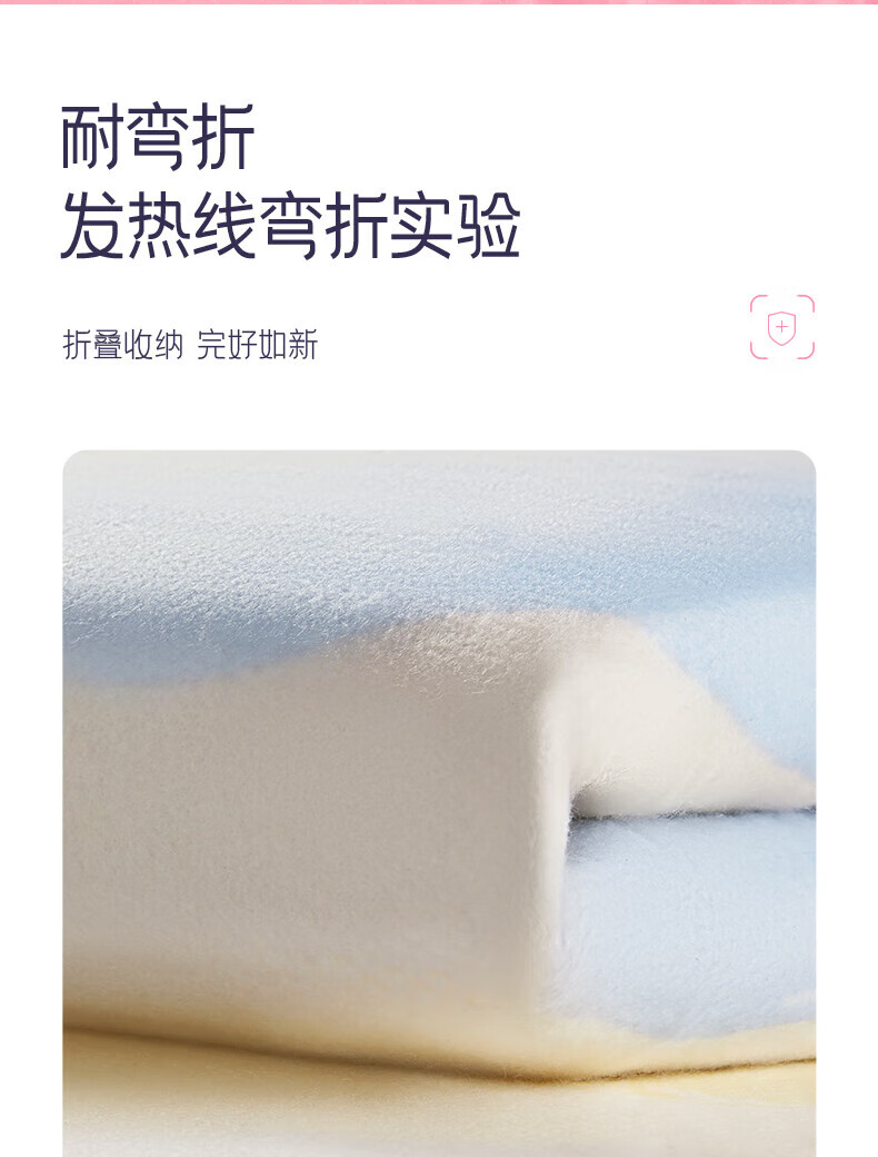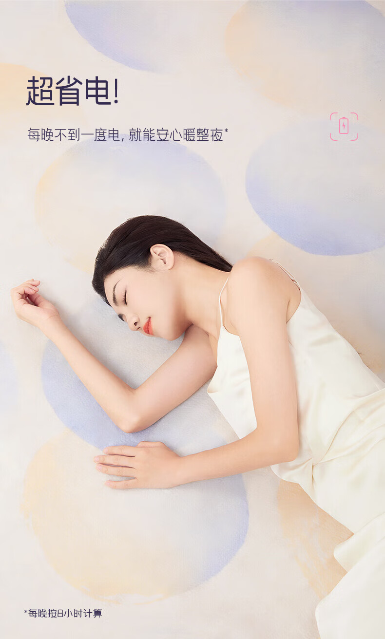 全线路安全保护调温电热毯,遇水遇尿不漏电;双层螺旋杆发热,实现高温断电保护;低能耗,每晚不到一度电