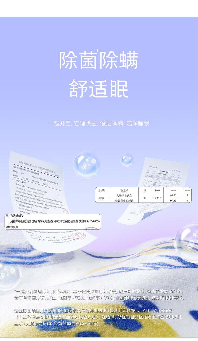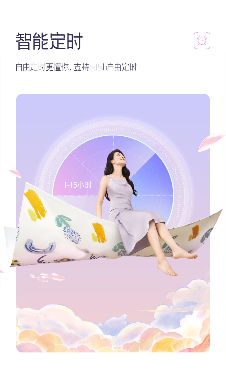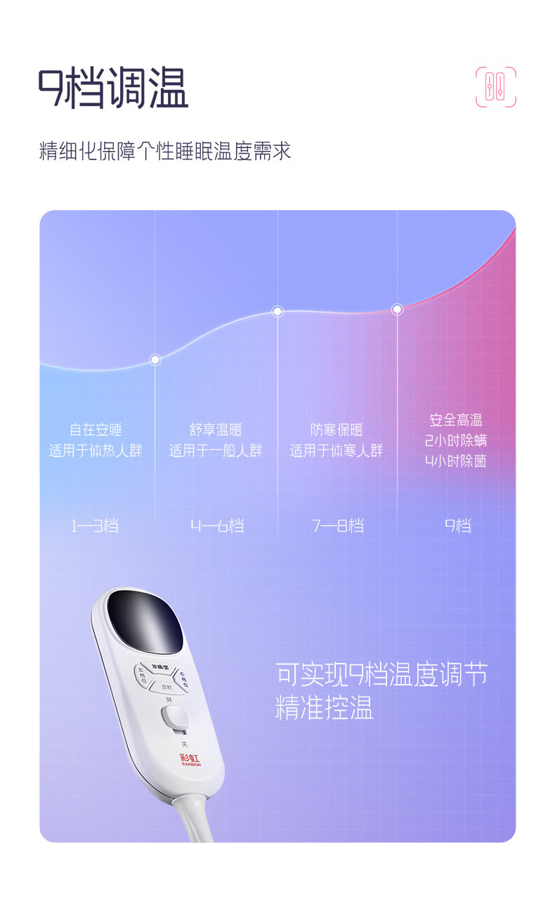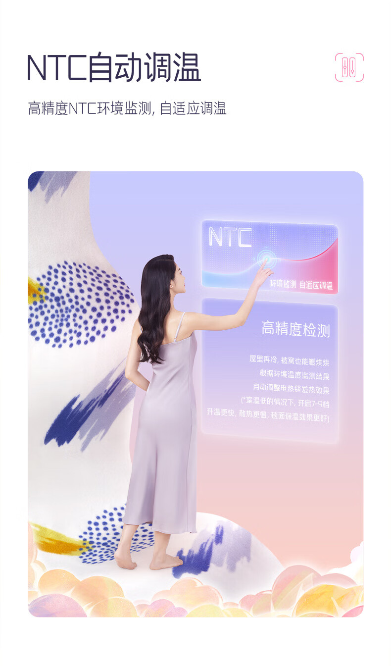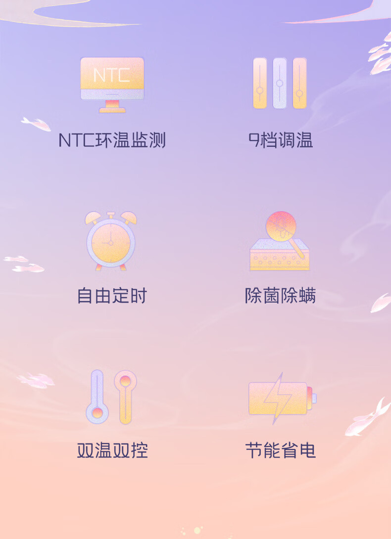 NTC环温监测,自适应调温;9档调温,随心调节;一键除菌除螨,健康安心