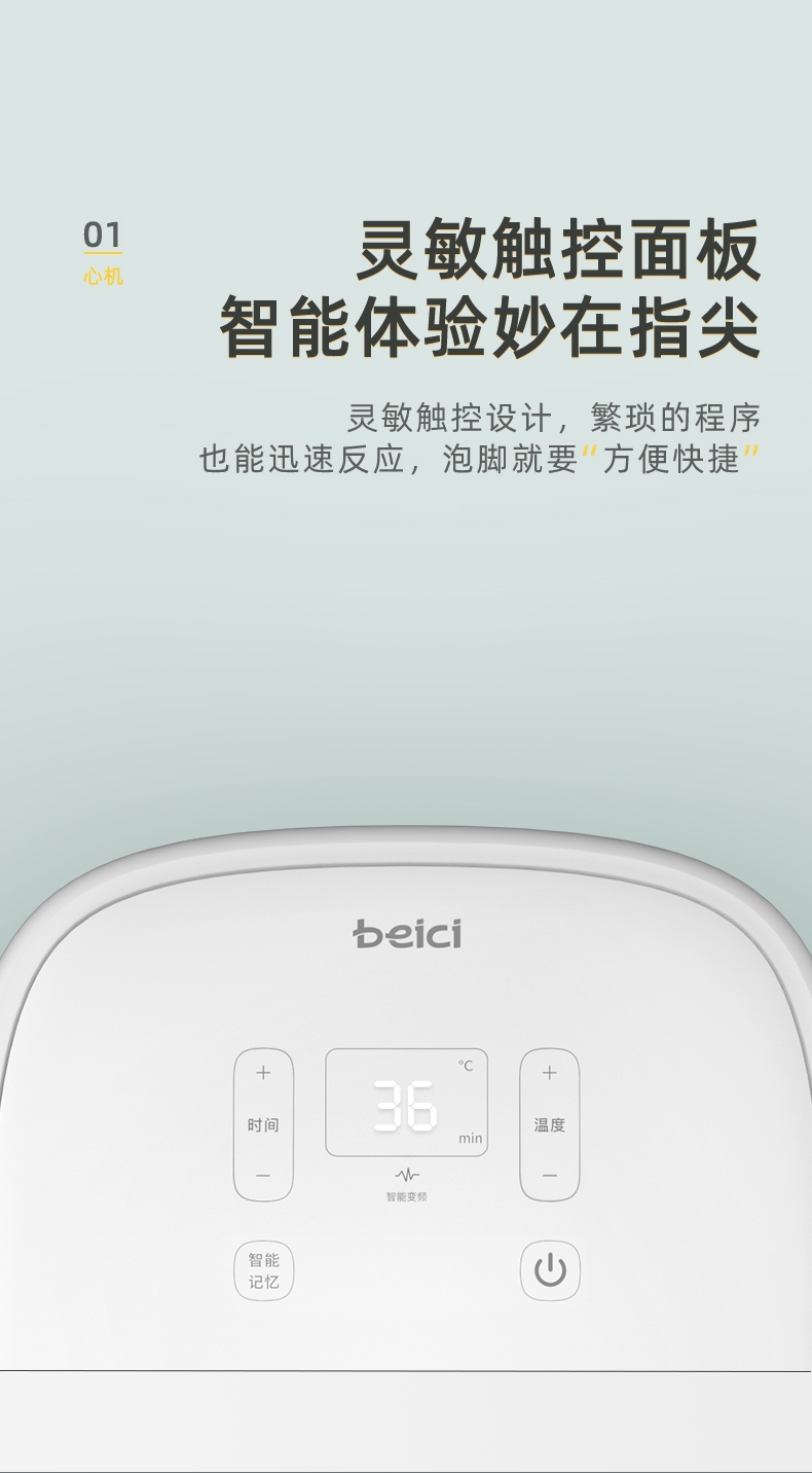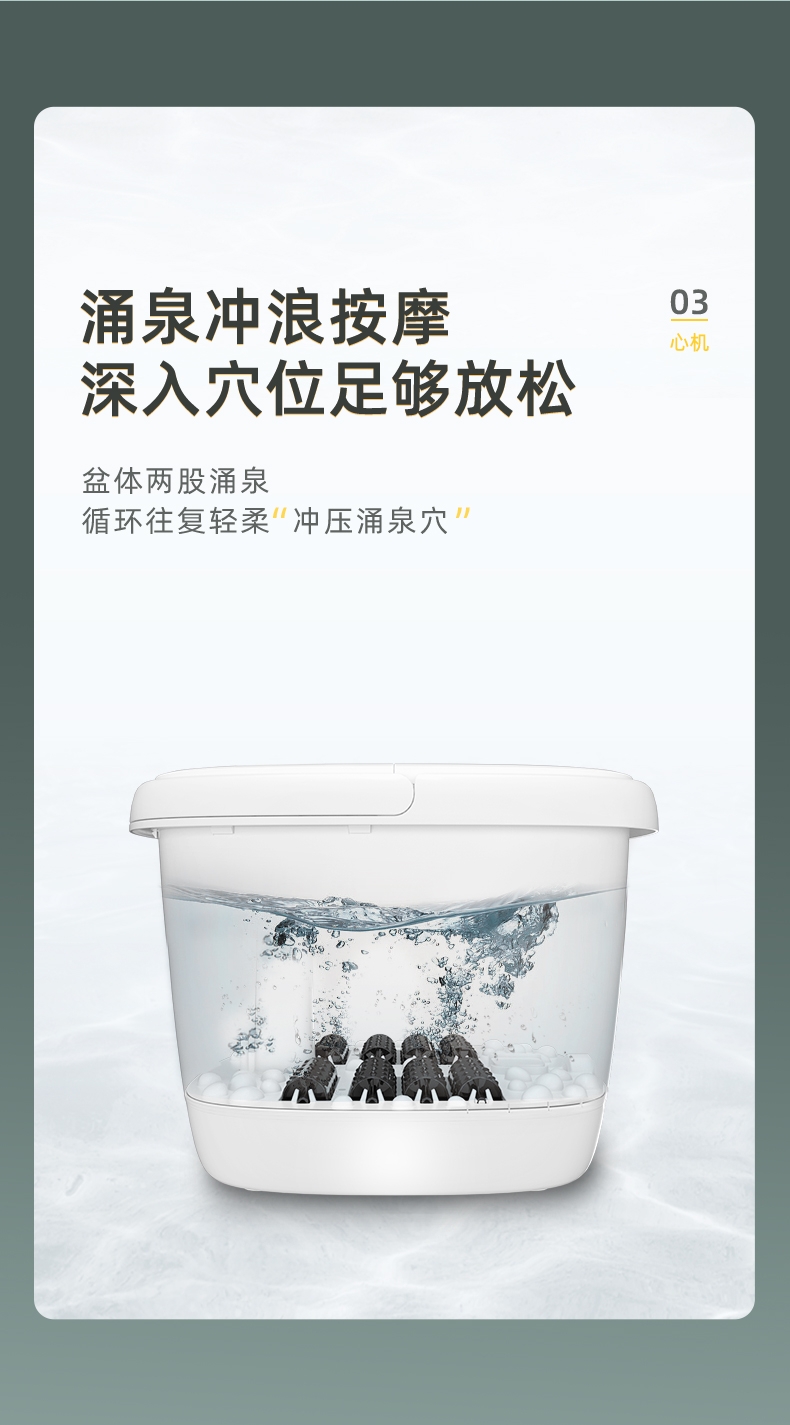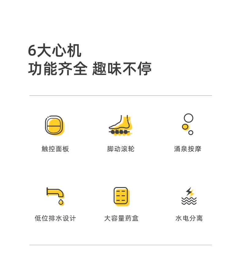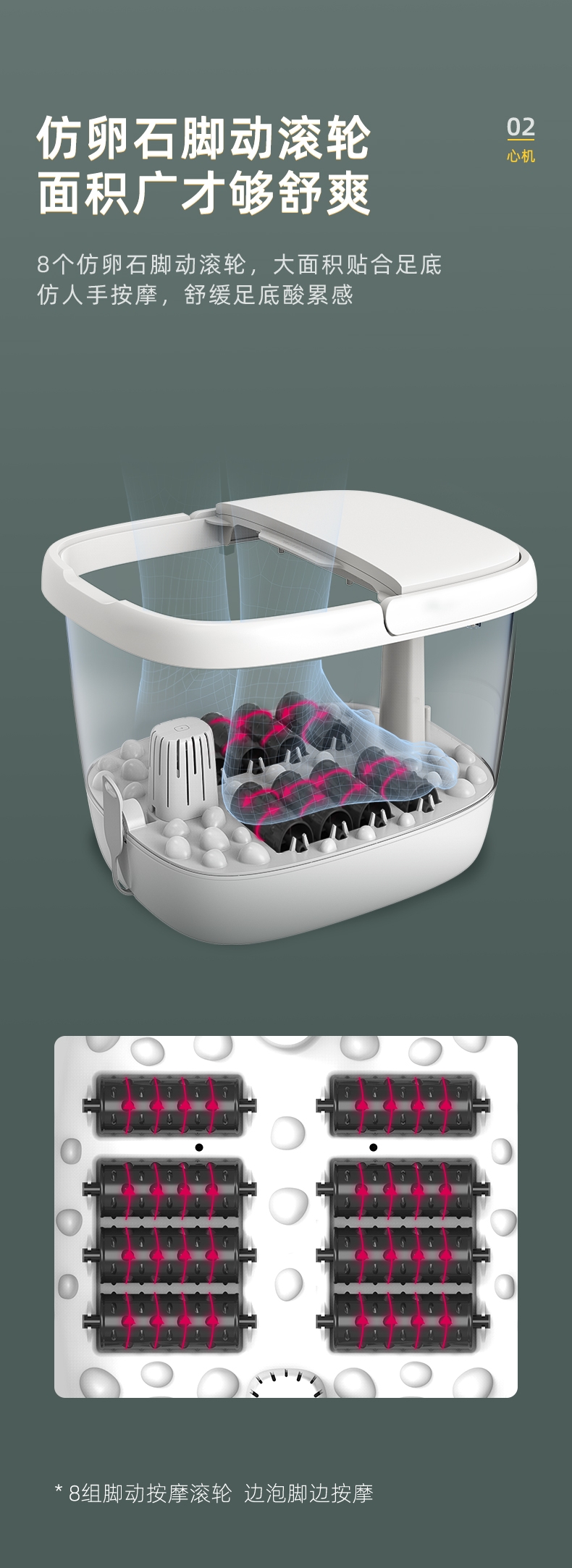 智能触控面板,盆内深16.5cm;8个非电动滚轮、4*2组自助滚轮按摩;智能记忆、涌泉冲浪