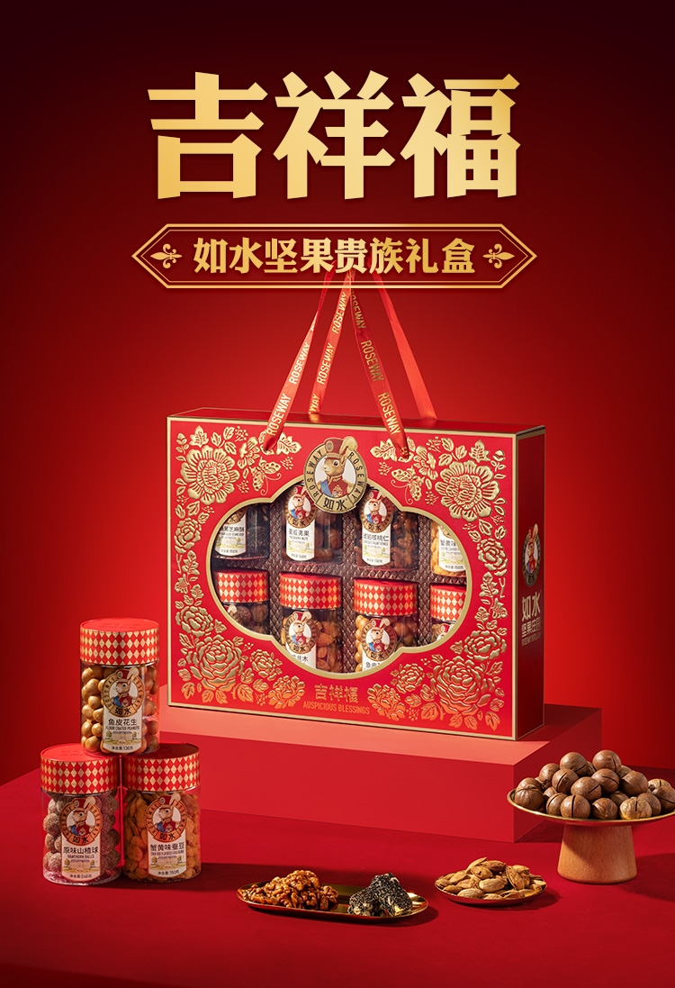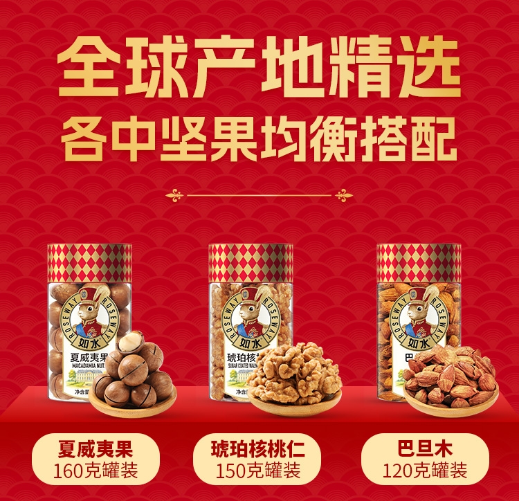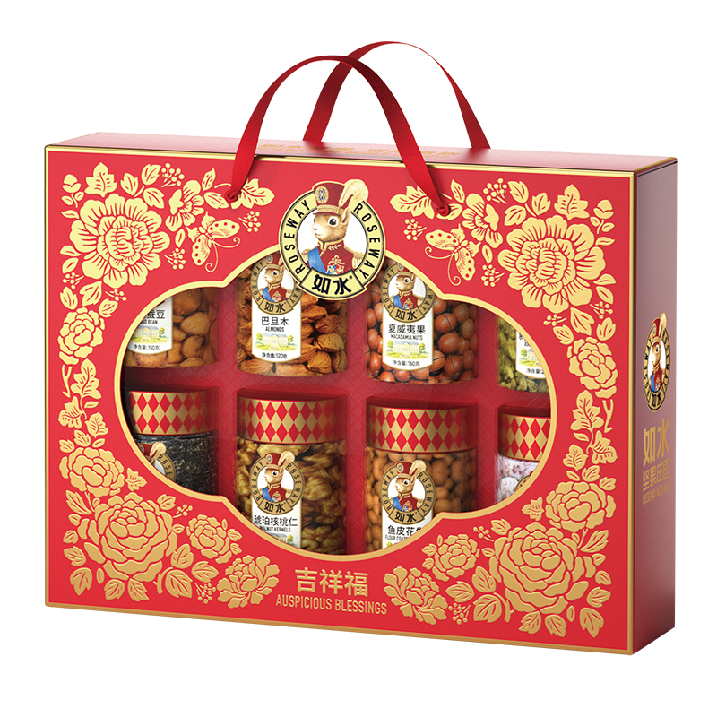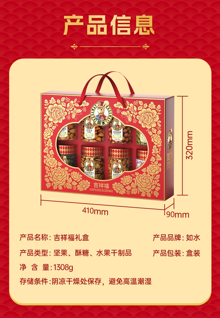 如水坚果全球原产地直采,只挑选高等级高品质原材料.;5种坚果炒货+2种蜜饯 果干+1种坚果酥糖;“海棠花”+“如意”形 开窗设计,融入东方传统采用