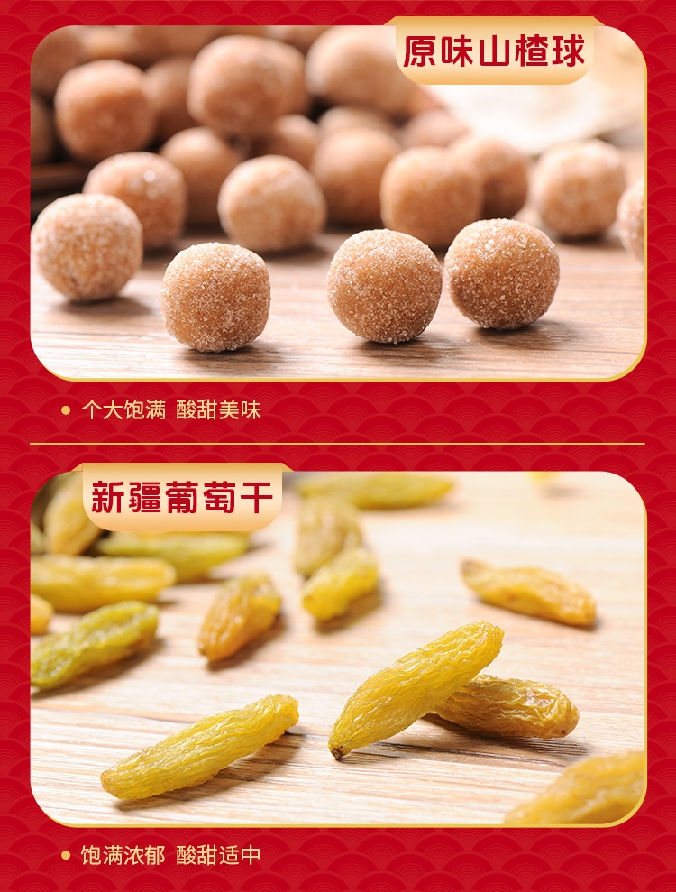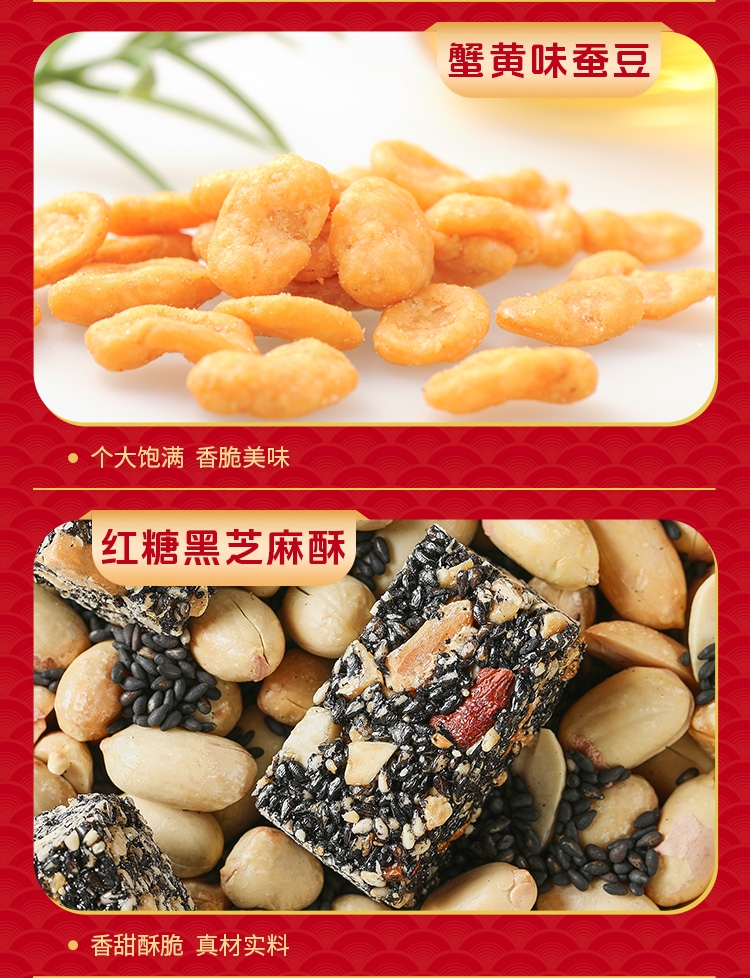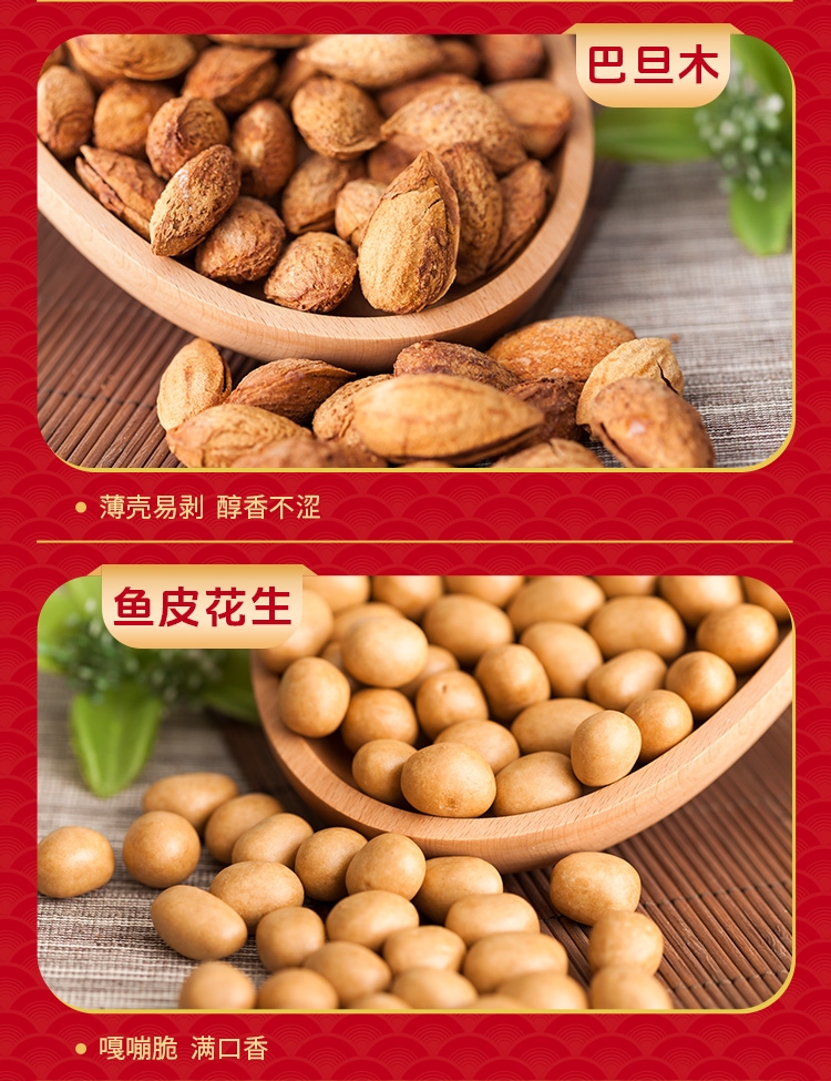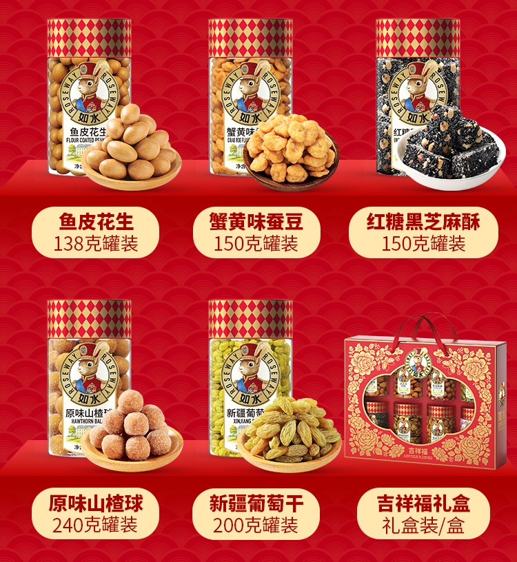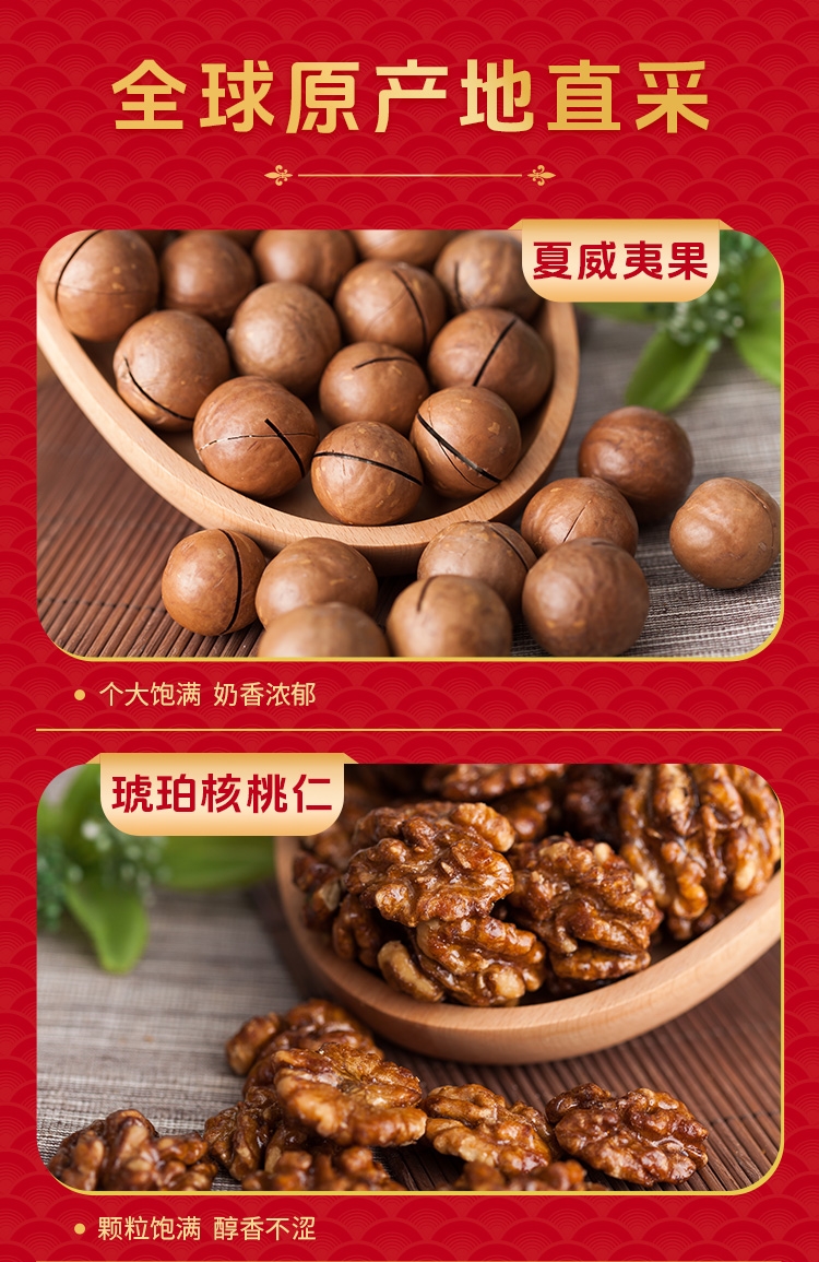 如水坚果全球原产地直采,只挑选高等级高品质原材料.;5种坚果炒货+2种蜜饯 果干+1种坚果酥糖;“海棠花”+“如意”形 开窗设计,融入东方传统采用