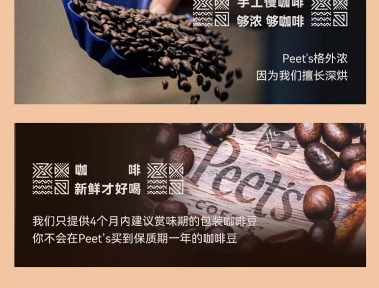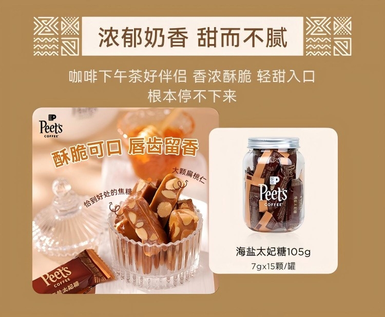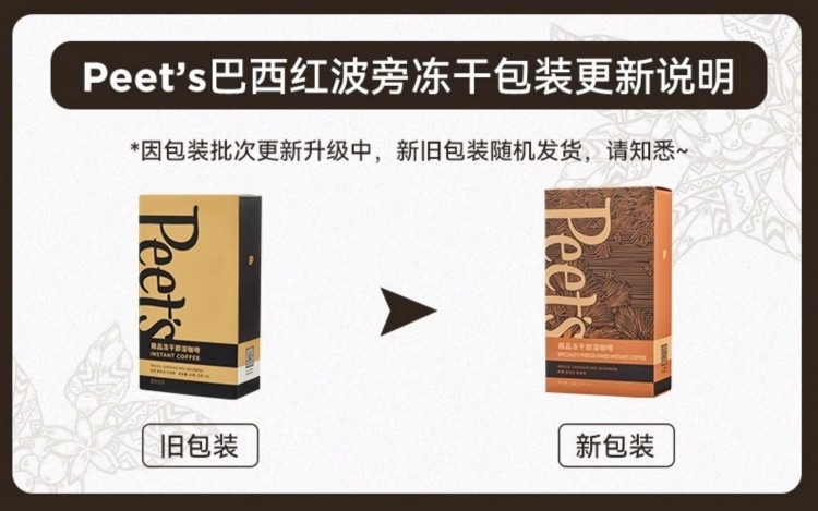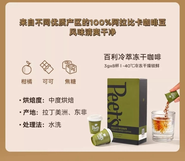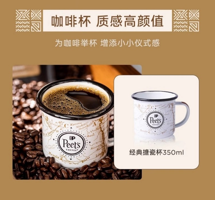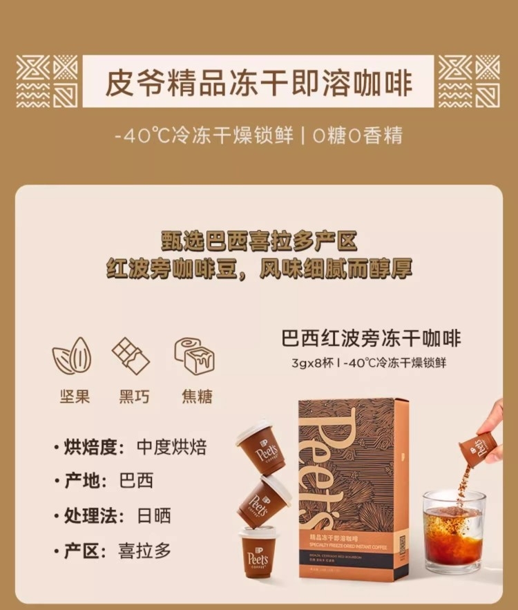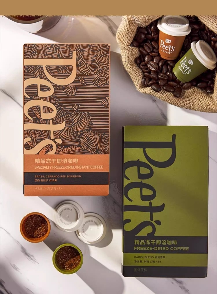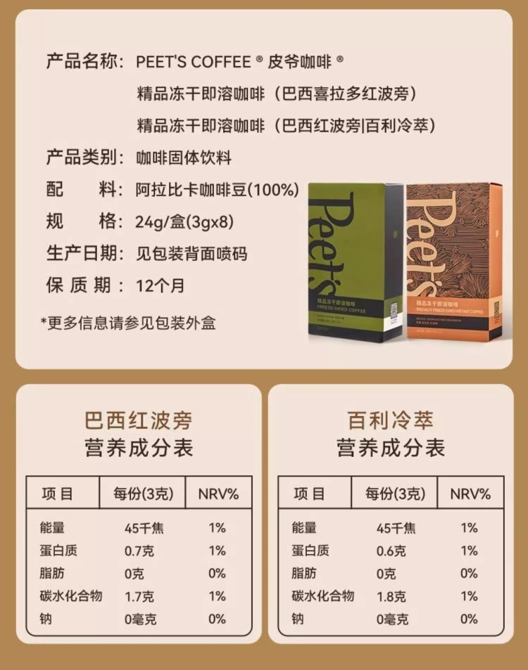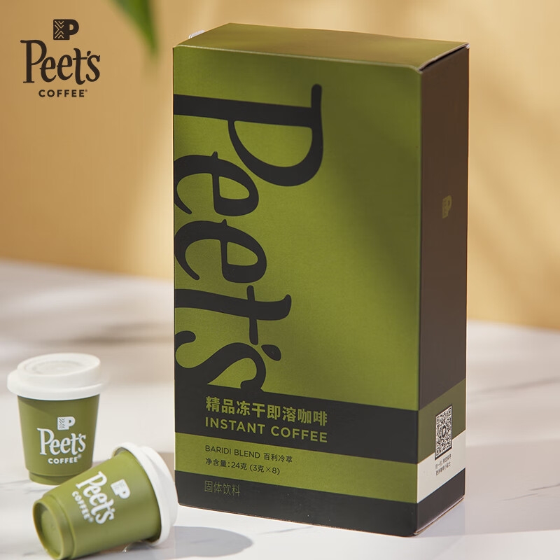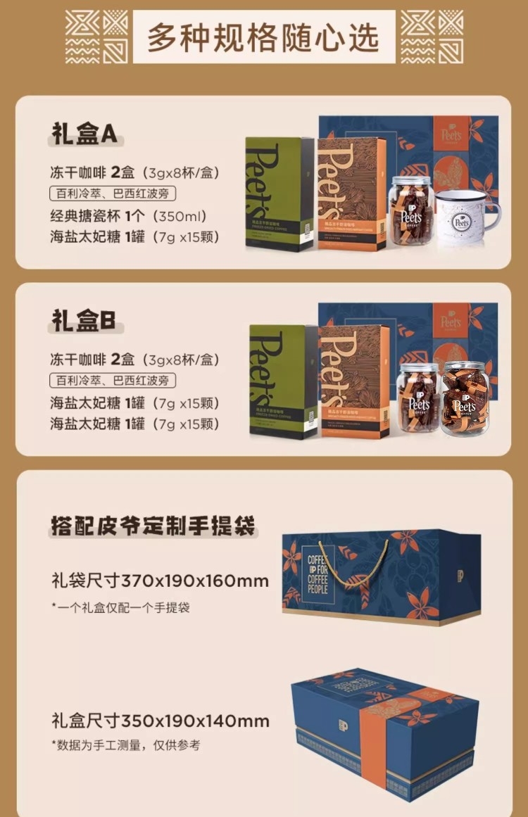 配置清单:Peets Coffee 百利冷萃冻干咖啡(3gx8杯/盒)* 1 Peets Coffee 巴西红波旁冻干咖啡(3gx8杯/盒)*1 Peets Coffee 海盐太妃糖(7克*15粒/罐)*2 Peets Coffee 定制礼盒+手拎袋(蓝/白随机)*1