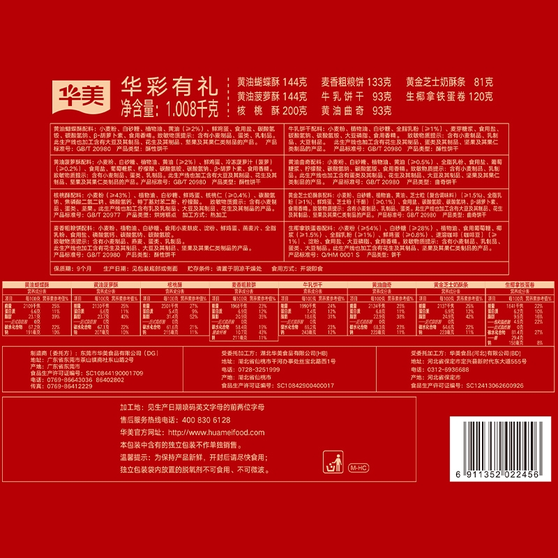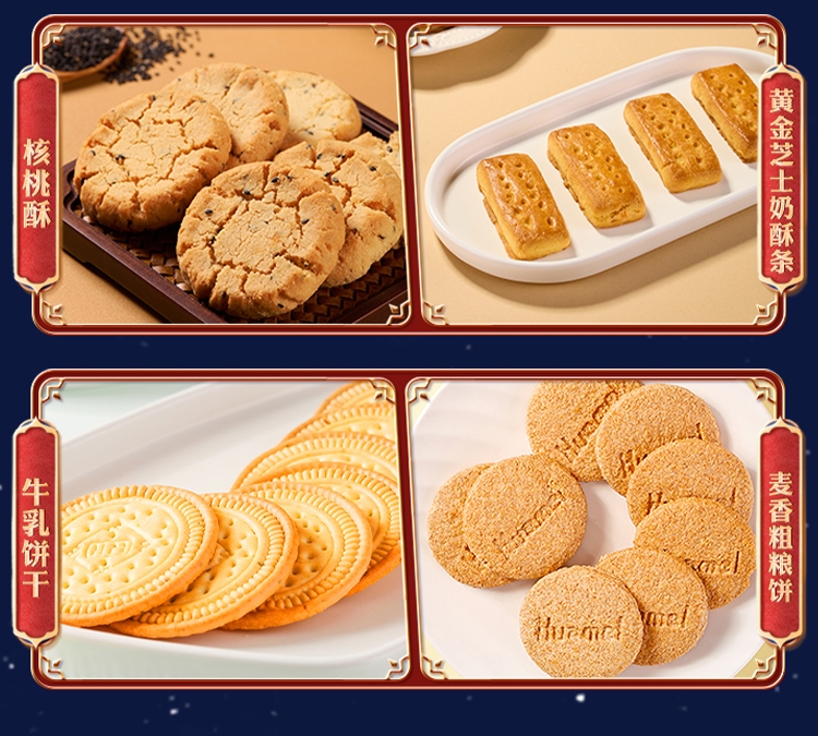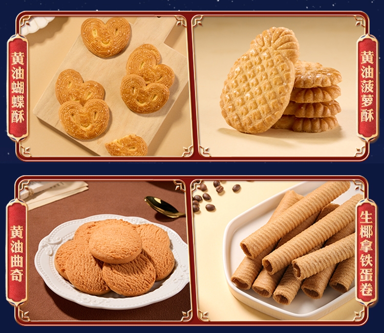 配置清单:黄油菠萝酥144G、核桃酥200G 牛乳饼干93G、生椰拿铁蛋卷120G 黄油曲奇93G、黄金芝士奶酥条81G 黄油蝴蝶酥144G、麦香粗粮饼133G