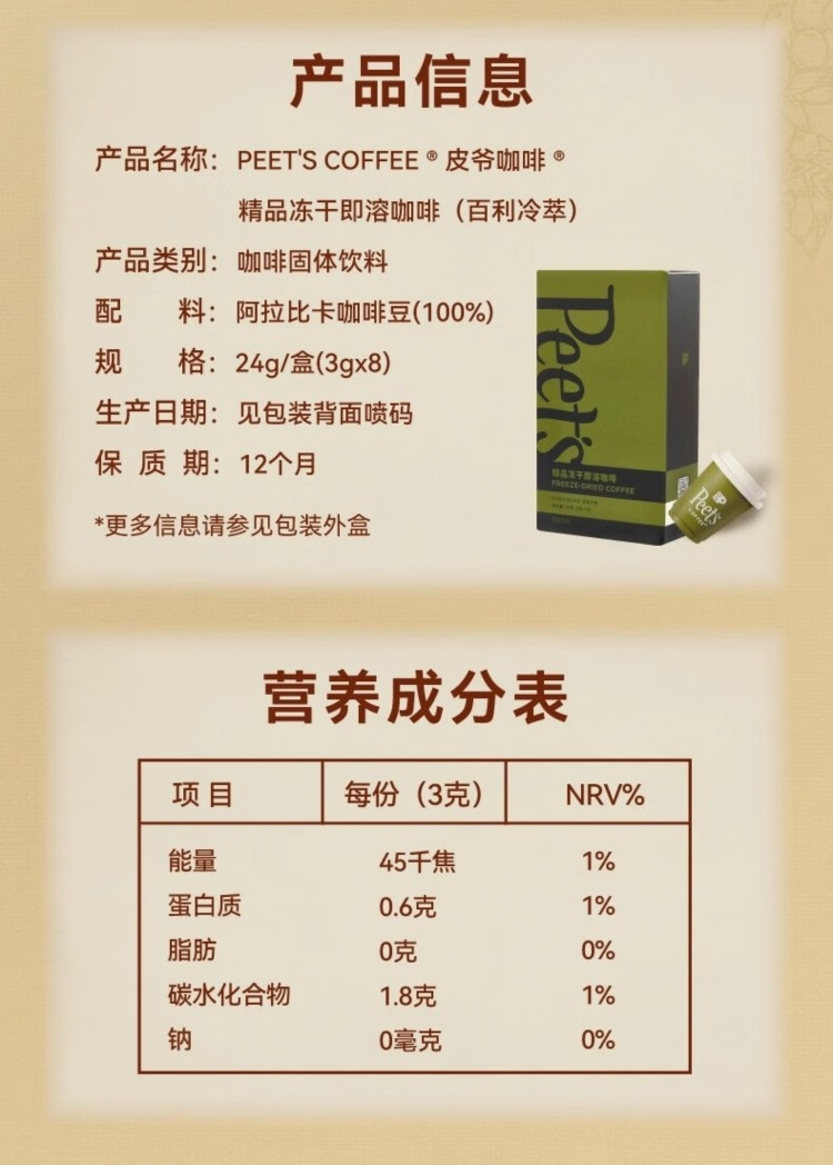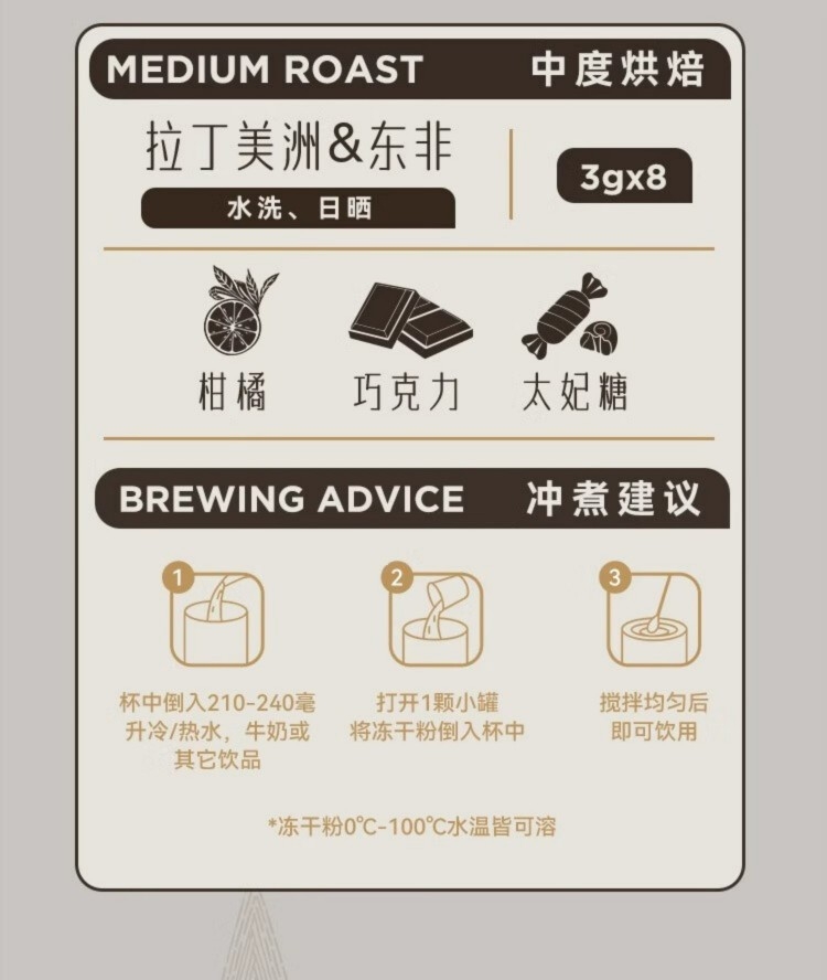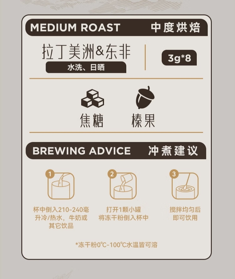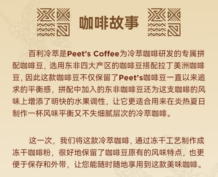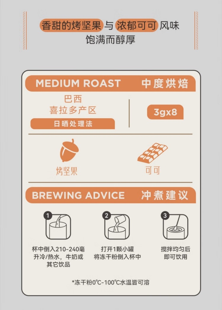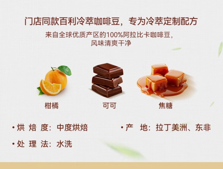 香甜的烤坚果与浓郁可可风味,饱满而醇厚;门店同款百利冷萃咖啡豆,专为冷萃定制配方;柑橘与浓醇巧克力风味,太妃糖般甘甜余味;浓郁的焦糖甜感与榛果风味,交织融合 呈现丰富而平衡
