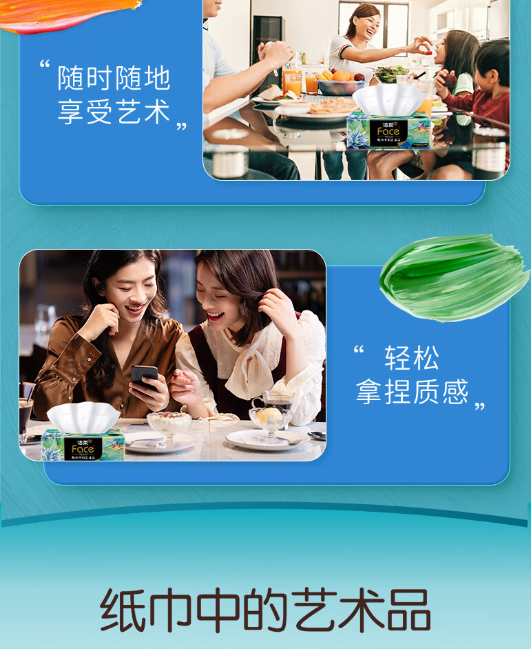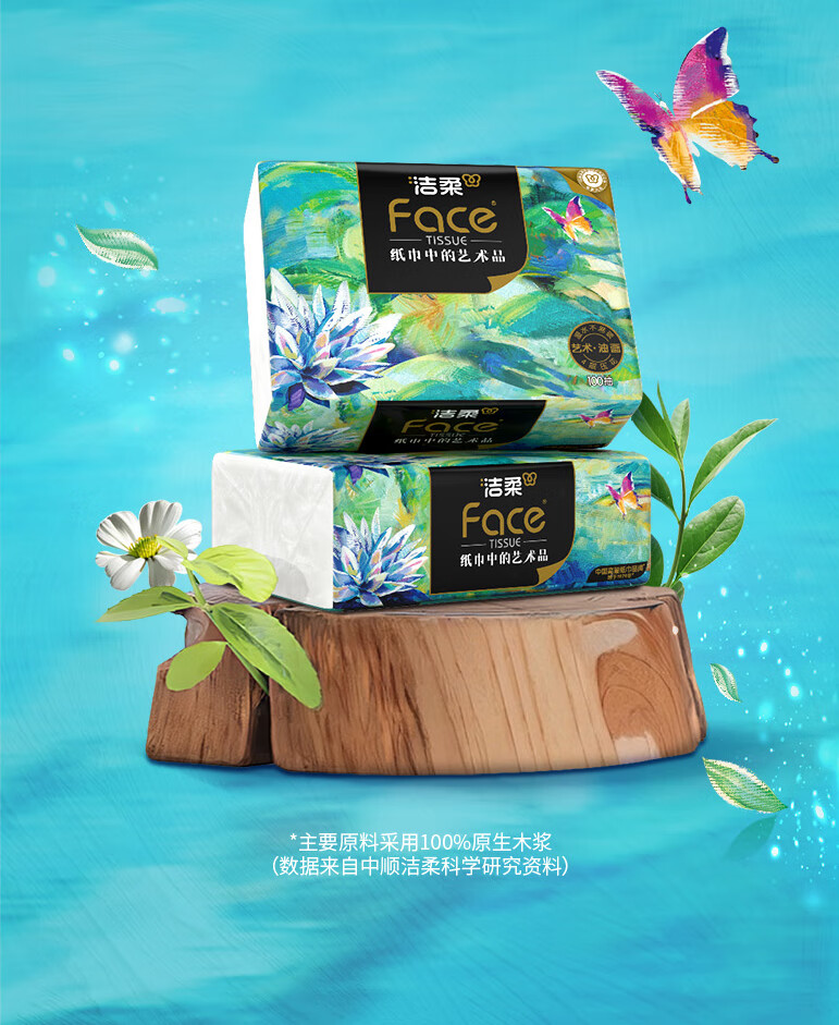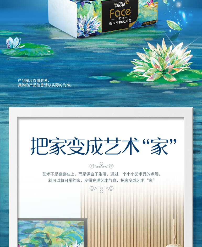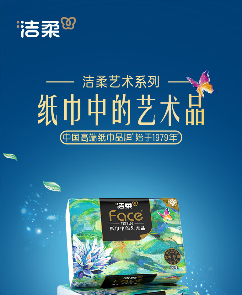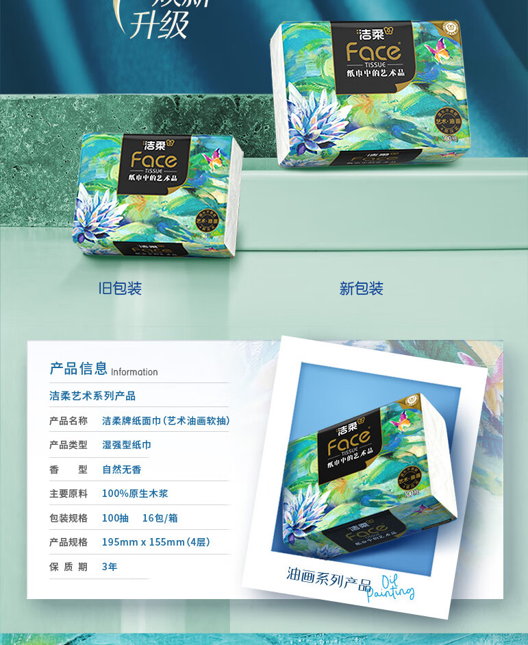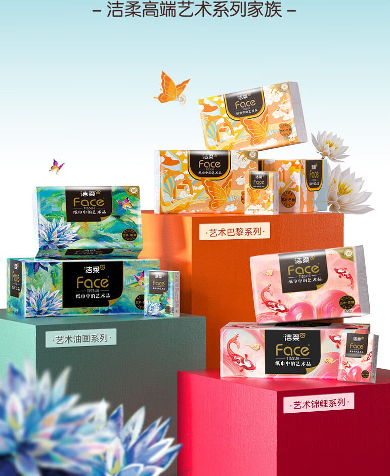 洁柔油画系列,纸巾中的艺术品;柔软舒适亲肤细腻,呵护每一对肌肤;精致压花工艺触感柔软舒适;质感居家搭配,精致生活尽显品味;就让每一张洁柔,为你记录旅游中的点点滴商