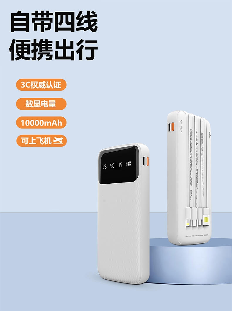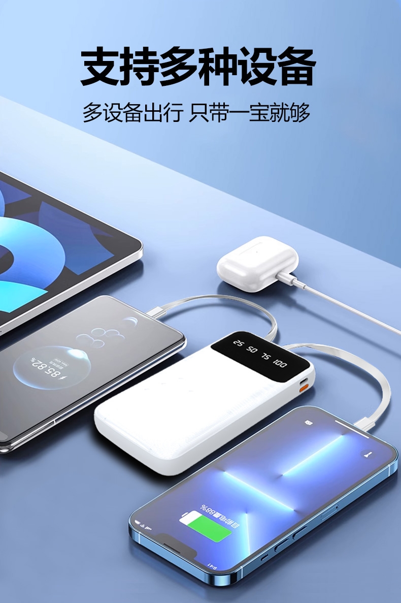 功能:多U口输出,双向快充,自带数据线,无线充电