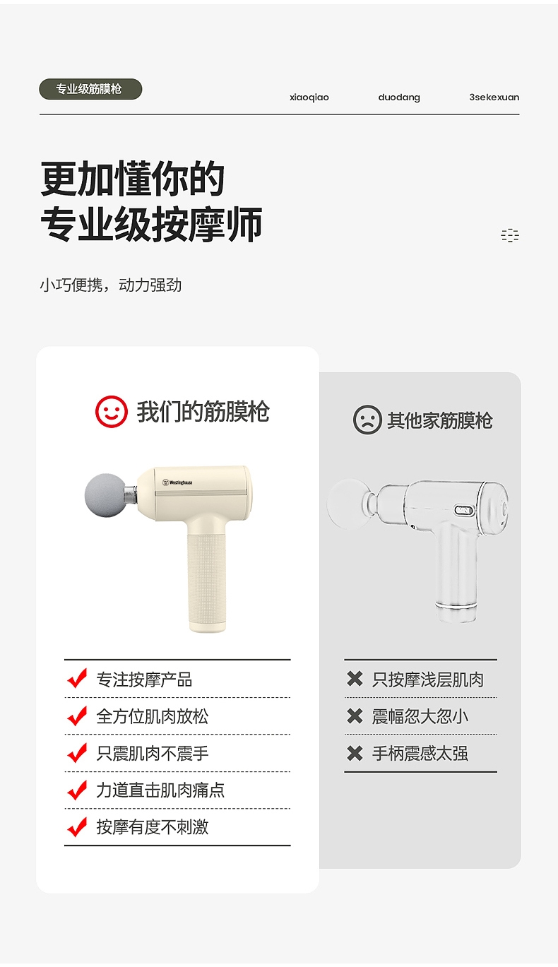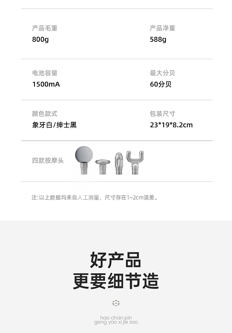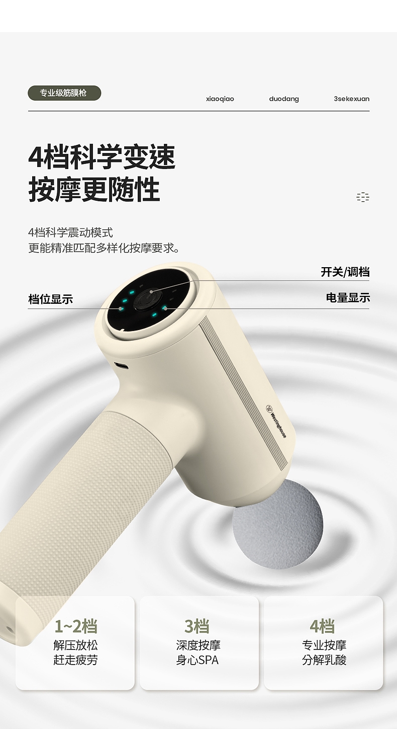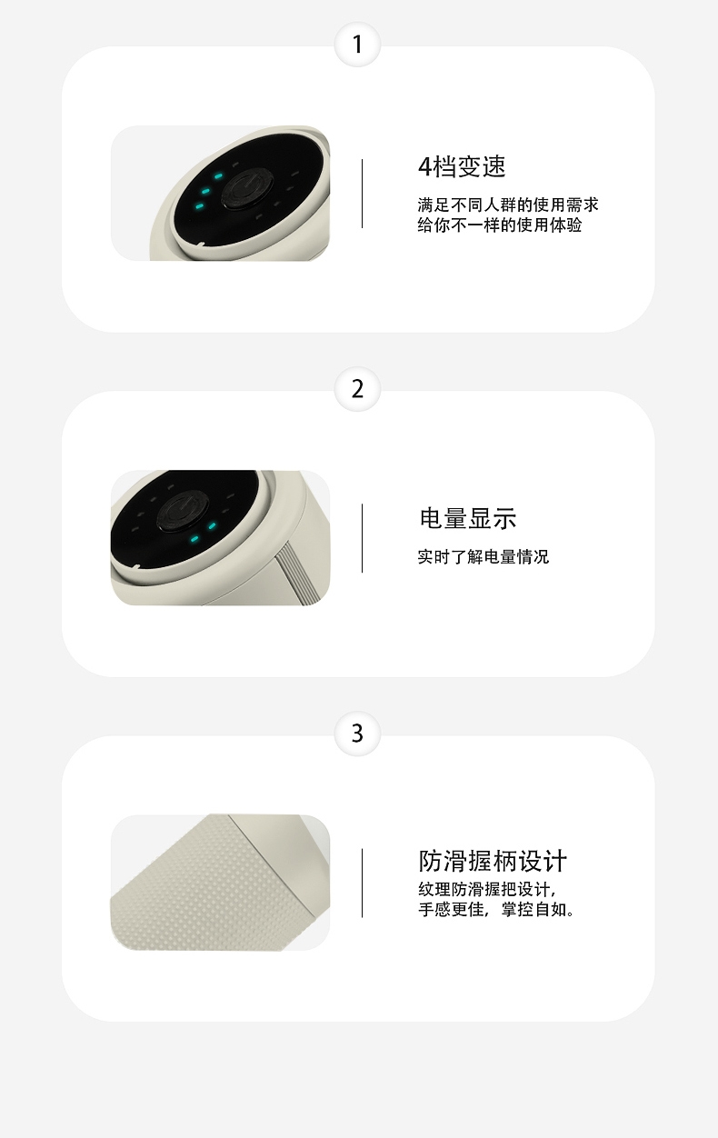 动力强劲,深层按摩精享安心放松;4档科学变速,4款按摩头,精准匹配多样化按摩需求;1500mAh电池升级高性能锂电池,持续提供动力;充电方式:Type-c充电