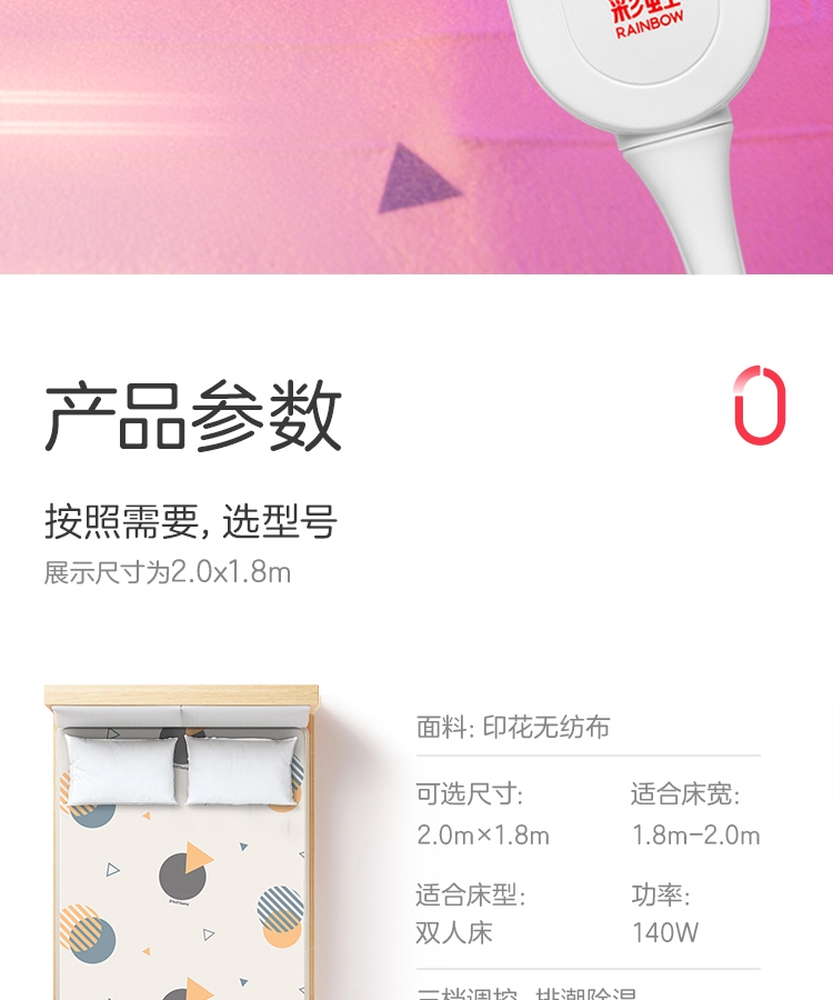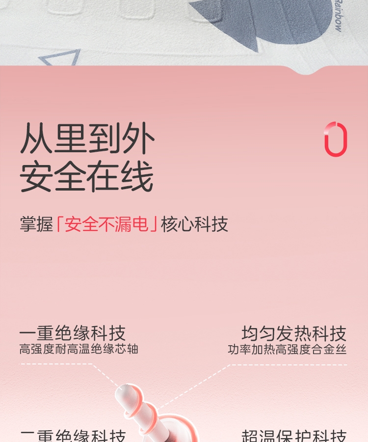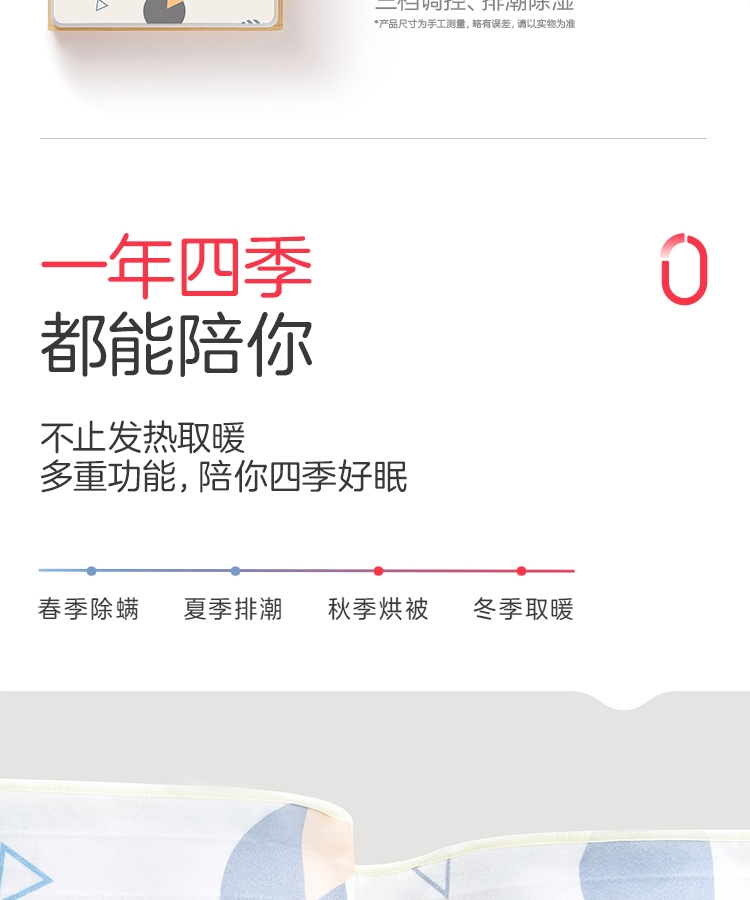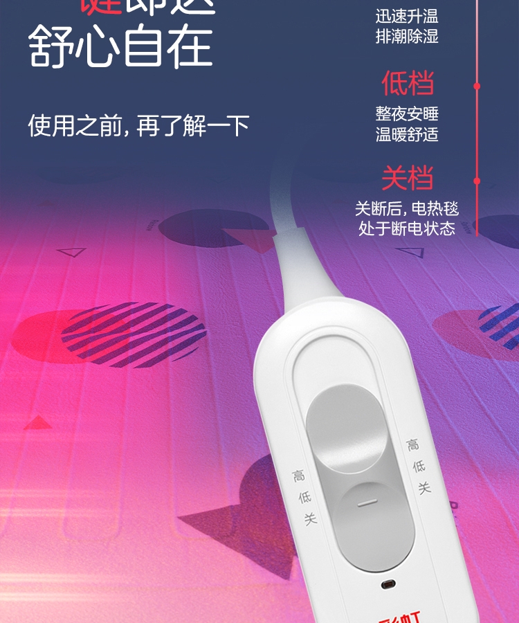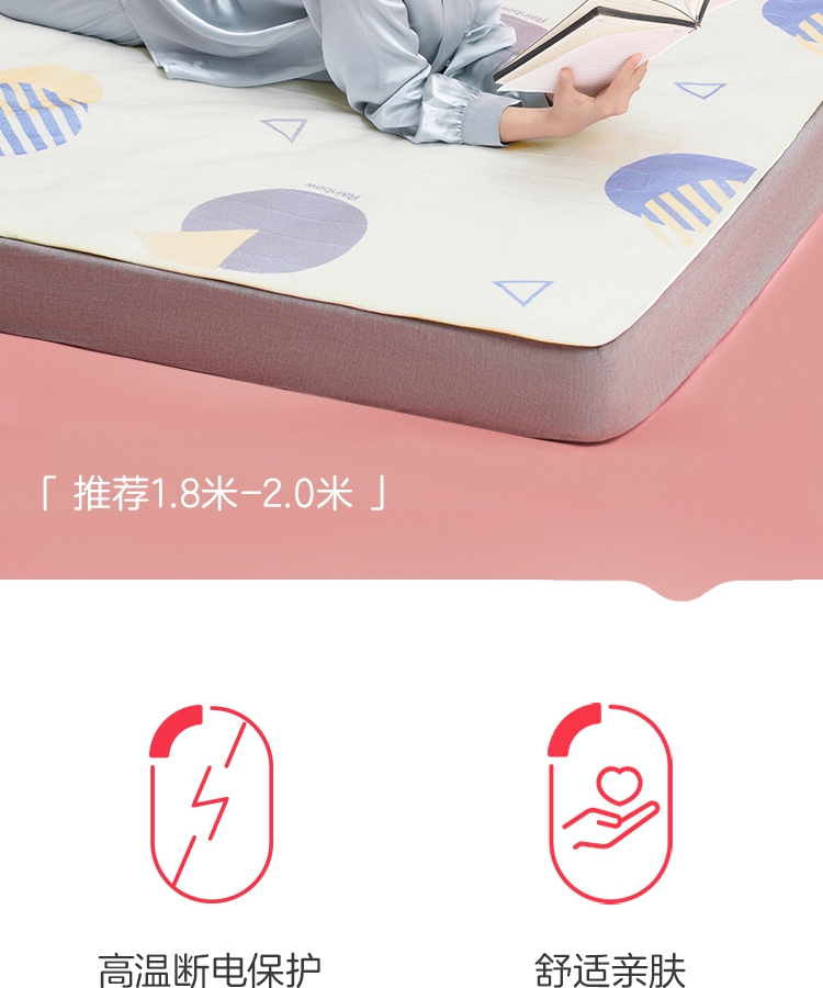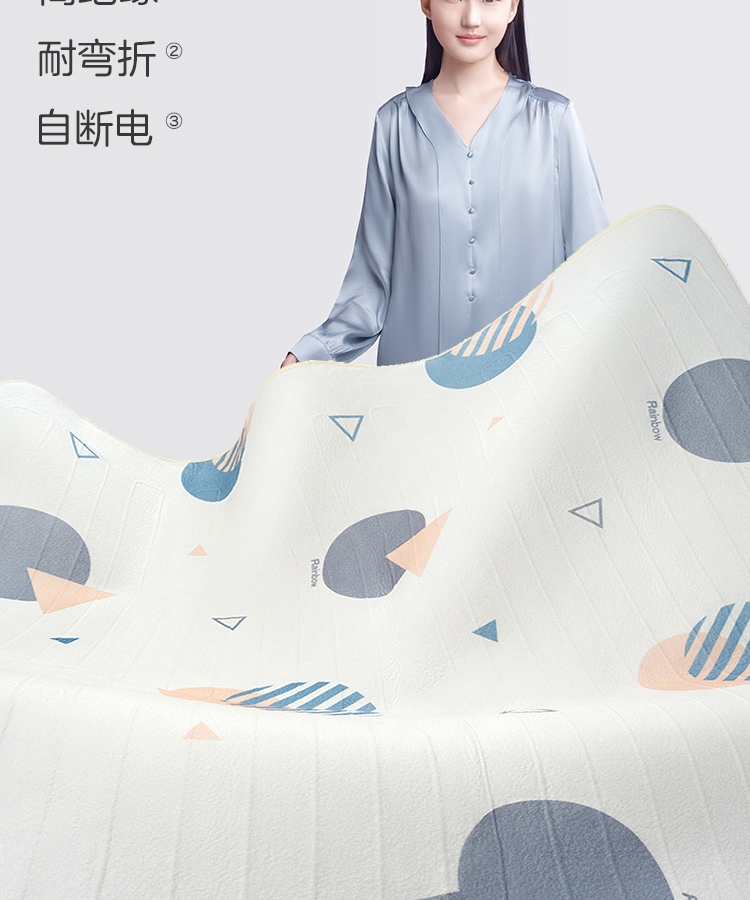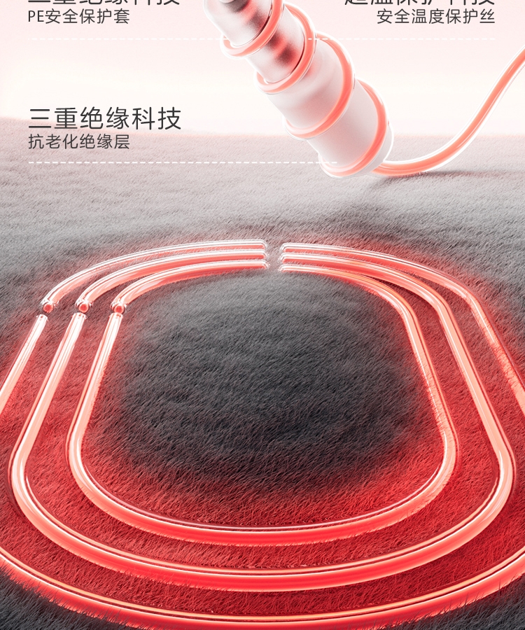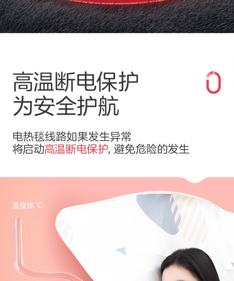 全线路安全保护调温电热毯,多挡调温,遇水遇尿不漏电;双层螺旋杆发热,实现高温断电保护;排潮除螨,四季可用,低能耗,每晚不到一度电