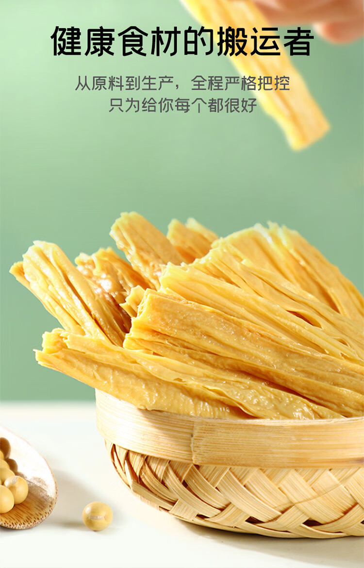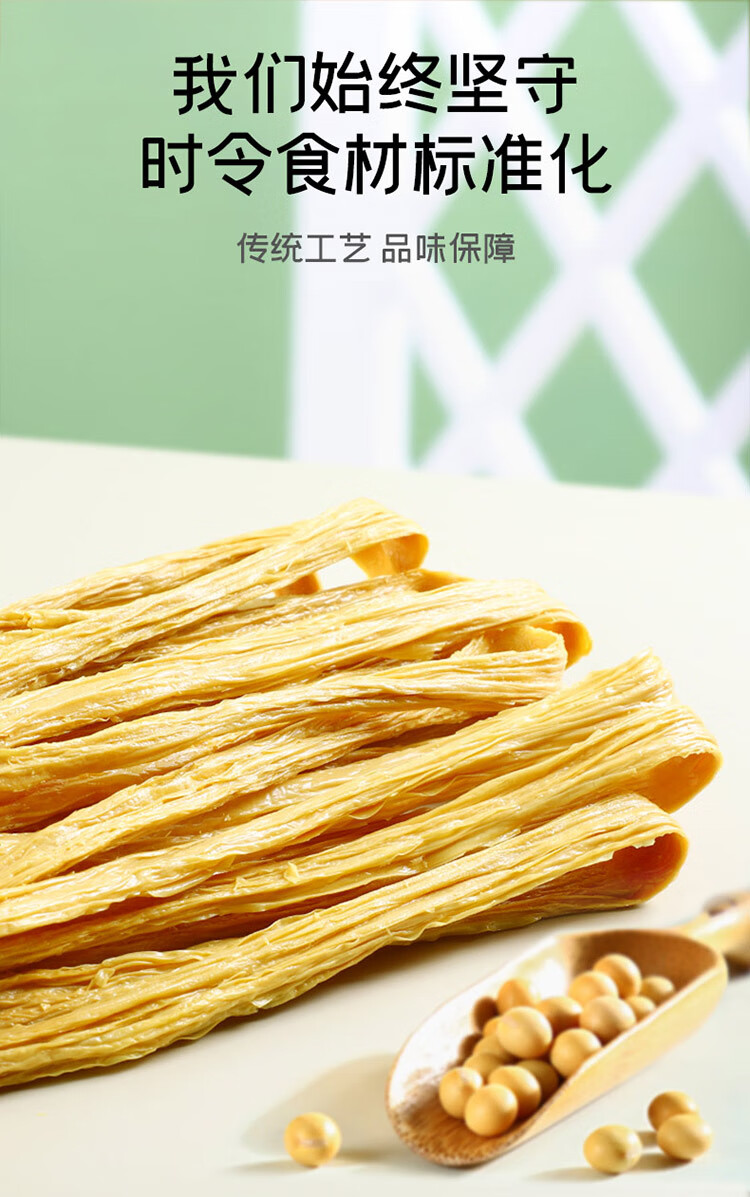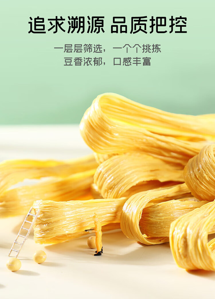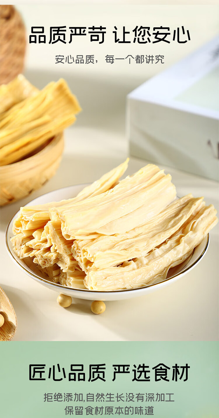 严选原料 品质腐竹 口感劲道;传统工艺 品味保障;严选大黄豆,无添加
