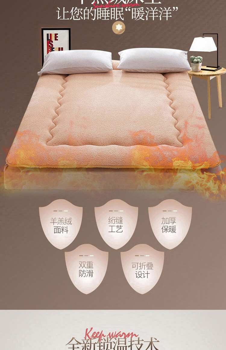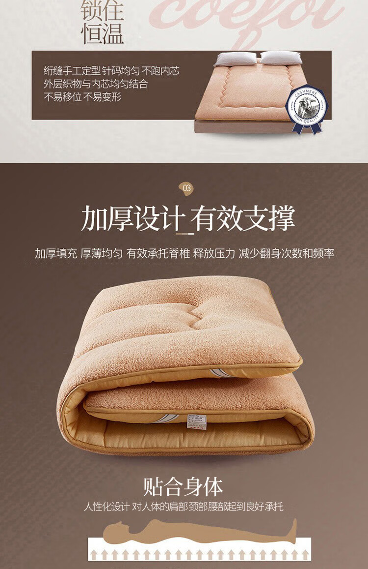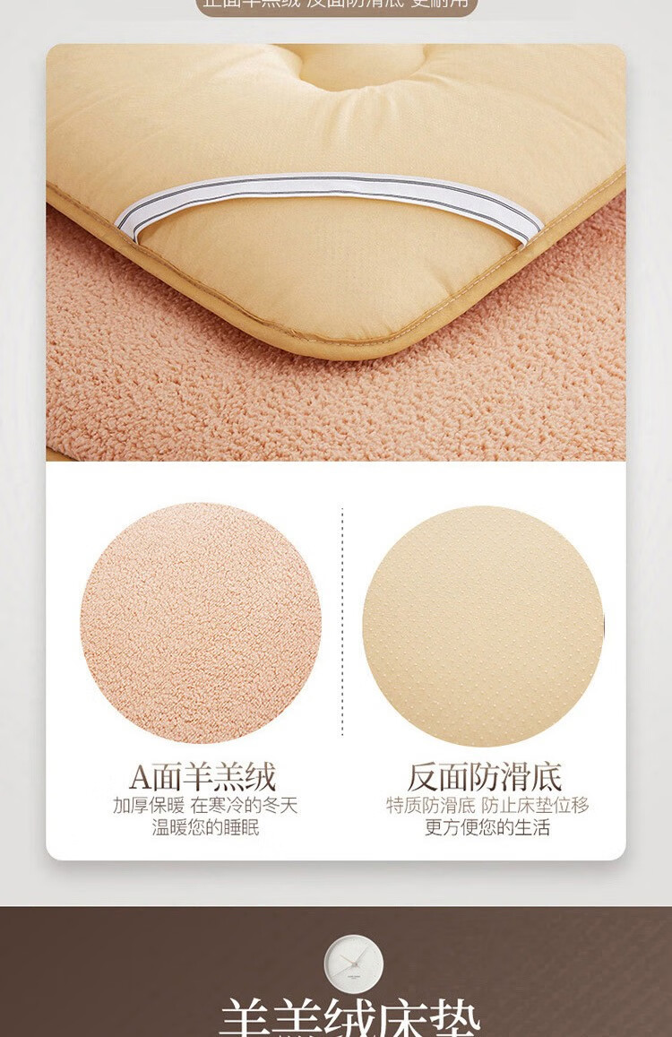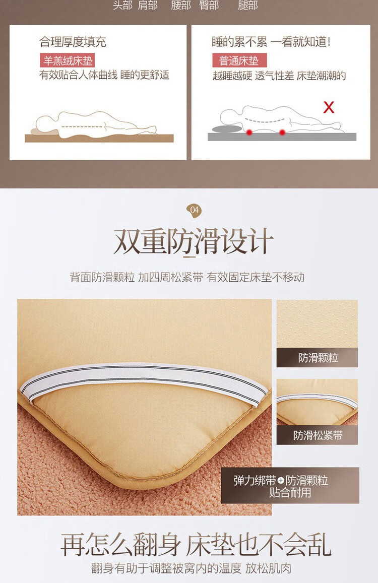 正面羊羔绒、反面防滑底、更耐用。;绒毛紧密细致,层层卷曲,具有柔软性和保暖性。;不易变形,有效定型,外层织物与内芯均匀结合。;.加厚设计,有效支撑。有效承托脊椎,减少翻身次数。;背面防滑颗粒,加四周松紧带,有效固定床垫不移动。