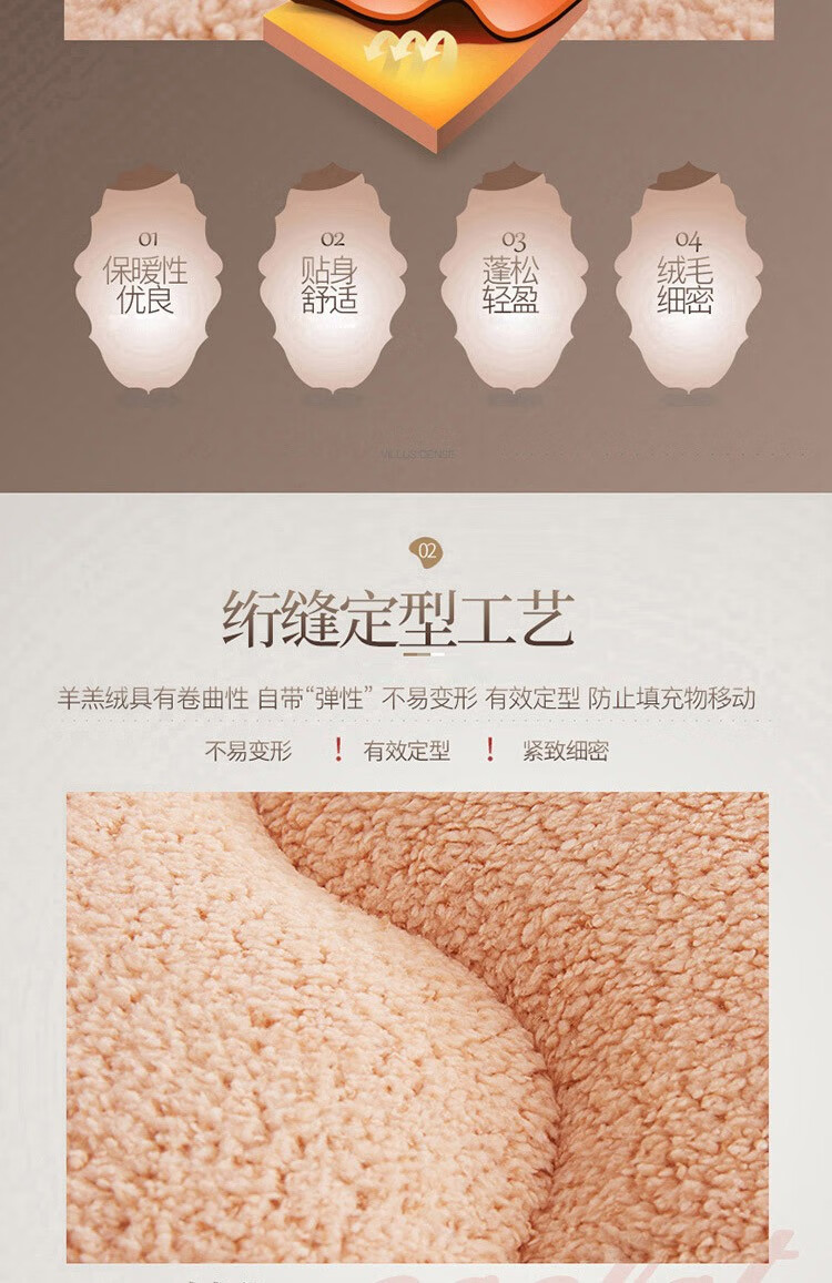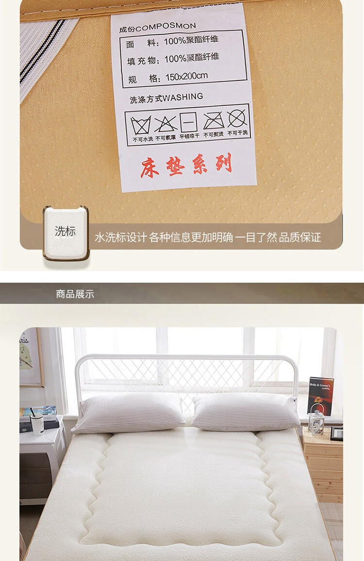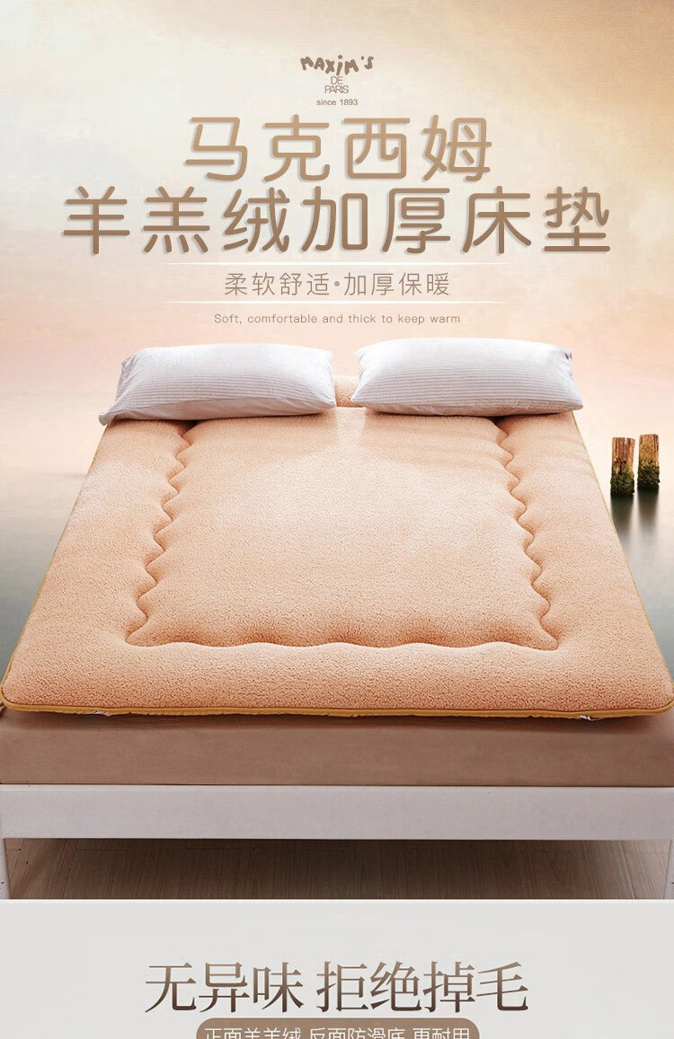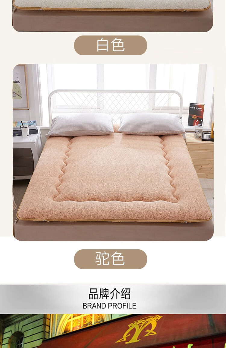 正面羊羔绒、反面防滑底、更耐用。;绒毛紧密细致,层层卷曲,具有柔软性和保暖性。;不易变形,有效定型,外层织物与内芯均匀结合。;.加厚设计,有效支撑。有效承托脊椎,减少翻身次数。;背面防滑颗粒,加四周松紧带,有效固定床垫不移动。