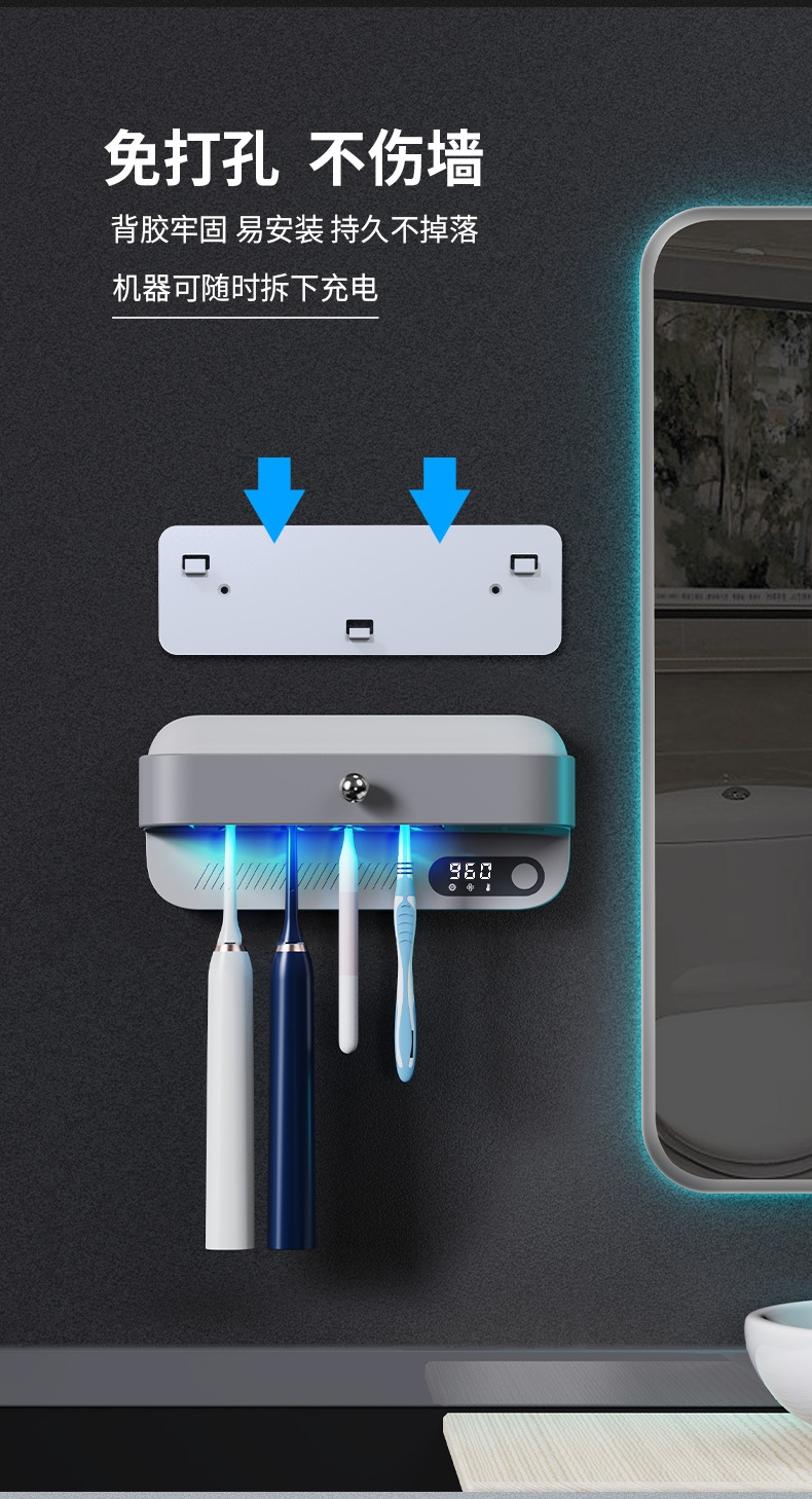 4颗UVC深紫外线灯珠用料扎实,一键启动三模式可调;风干+烘干+定时杀菌,多功能联动,全面守护日常洁净;涡轮强风+恒温烘干,双效快速协同,干爽更彻底;免打孔安装+多方式充电,内置大容量电池随装随用灵活;磁控安全断电,挡板开合自动启停,使用安心无忧