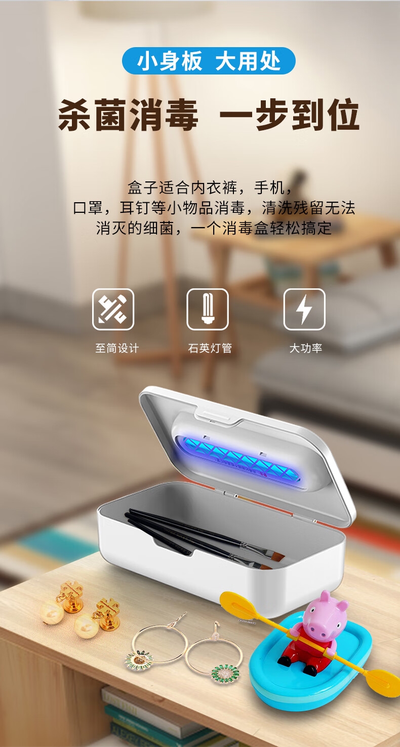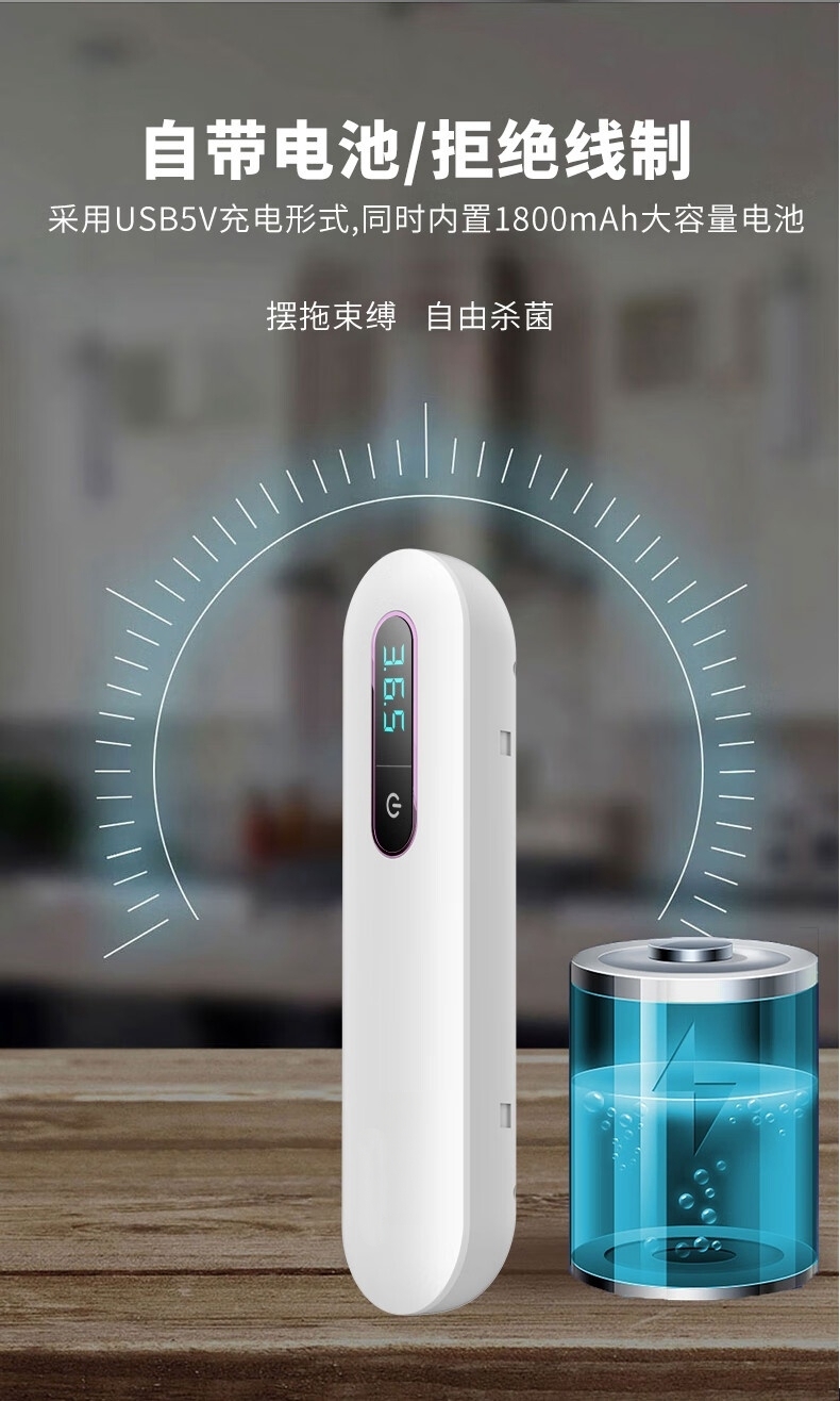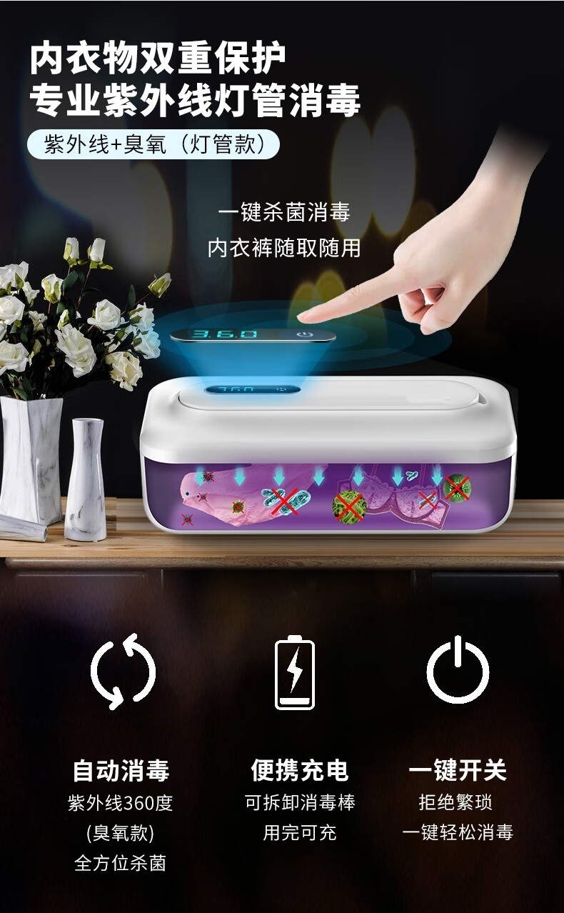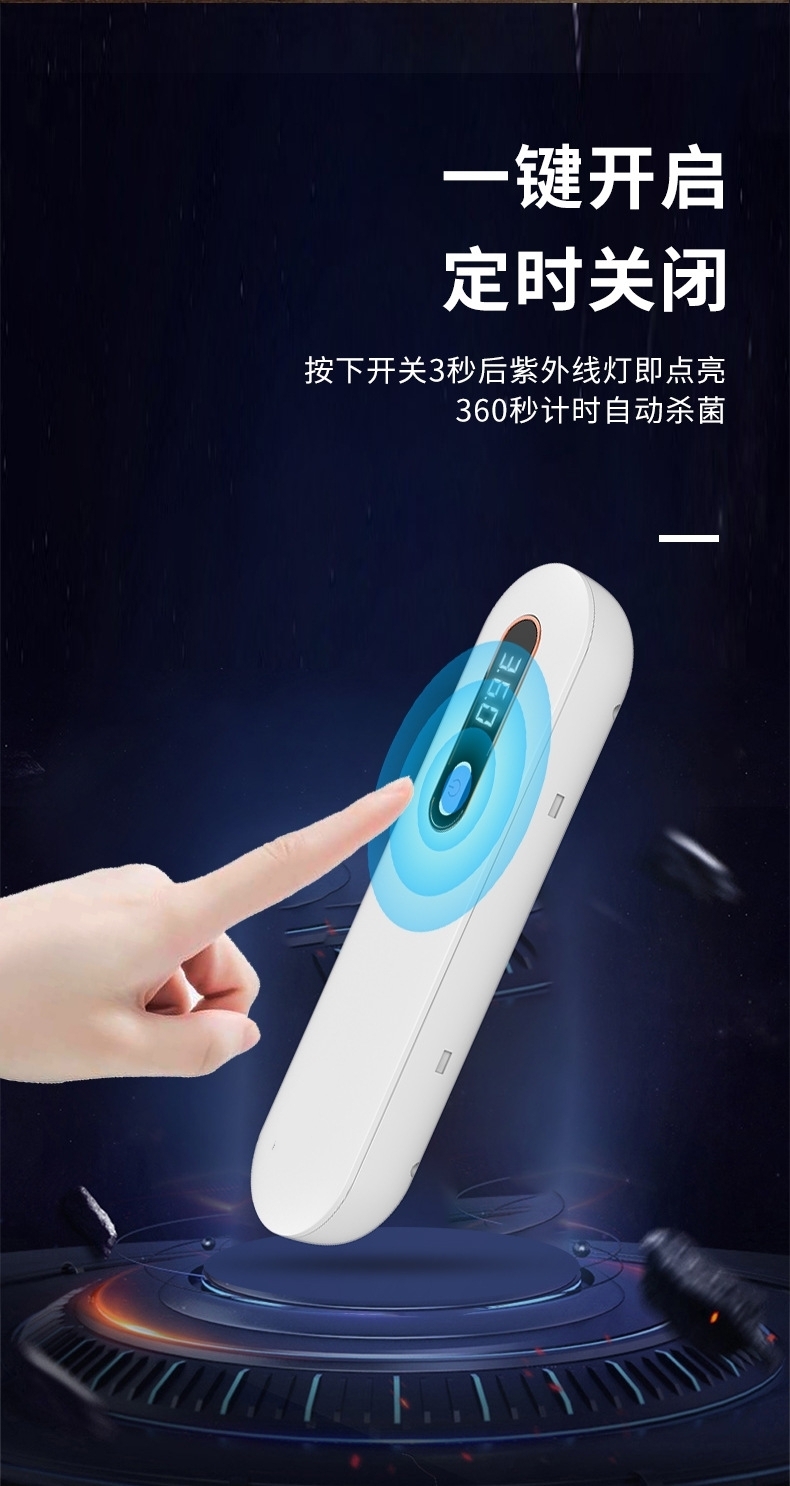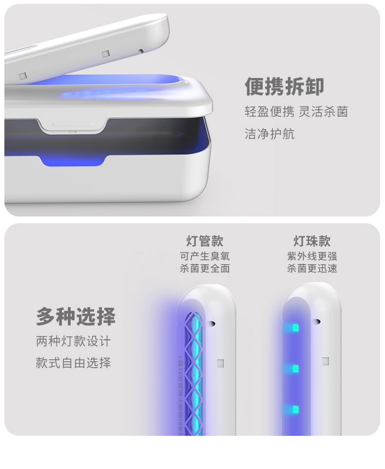 双波段双重杀菌,254nm紫外线+186nm臭氧;一机两用灵活消毒,整机收纳与独立消毒棒两种模式;智能体感安全防护,陀螺仪感应倾斜超30°自动断电;可拆卸消毒管设计,极简外观,操作便捷;支持内衣、数码产品、玩具等日常物品,拓展消杀范围