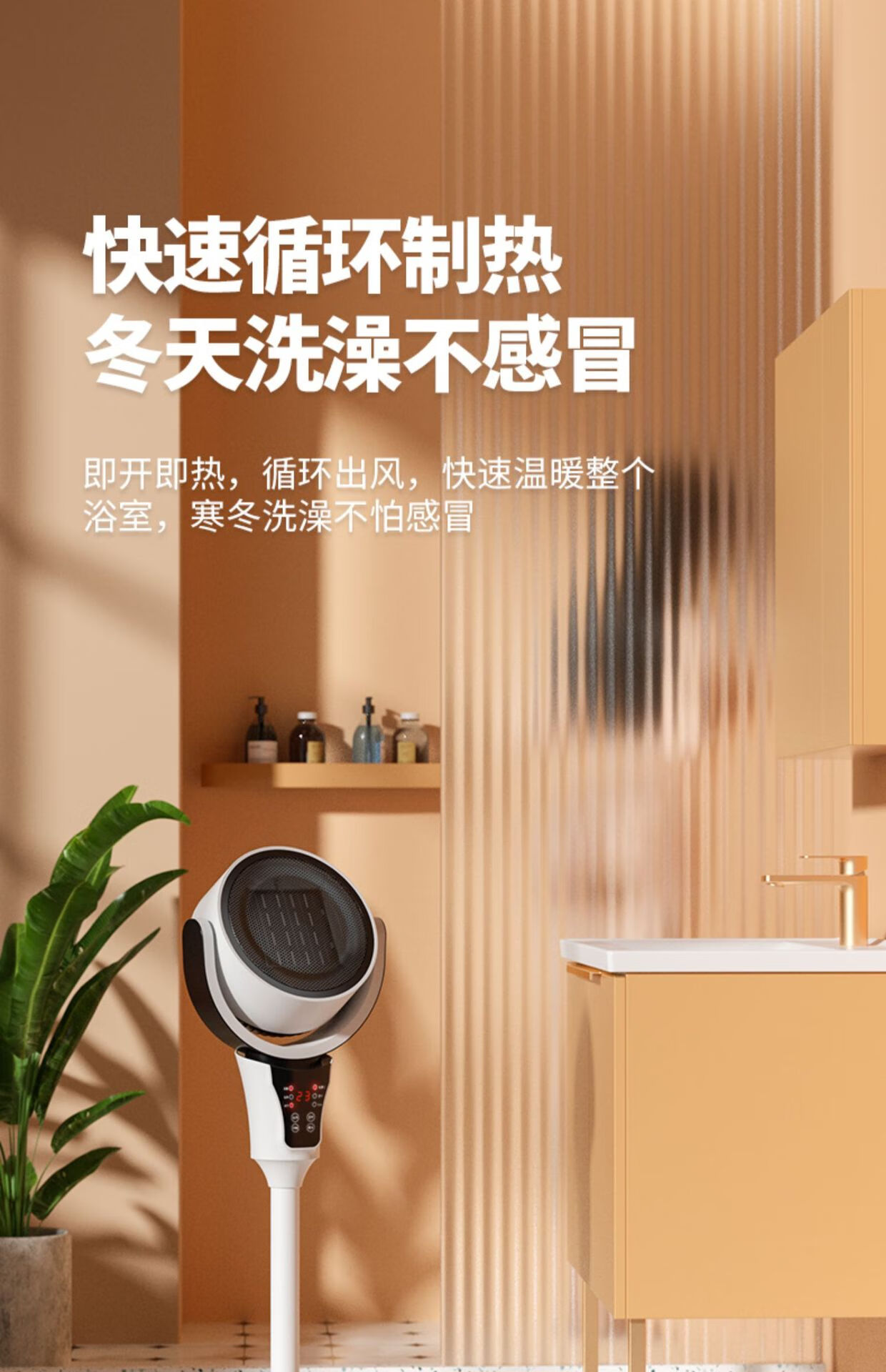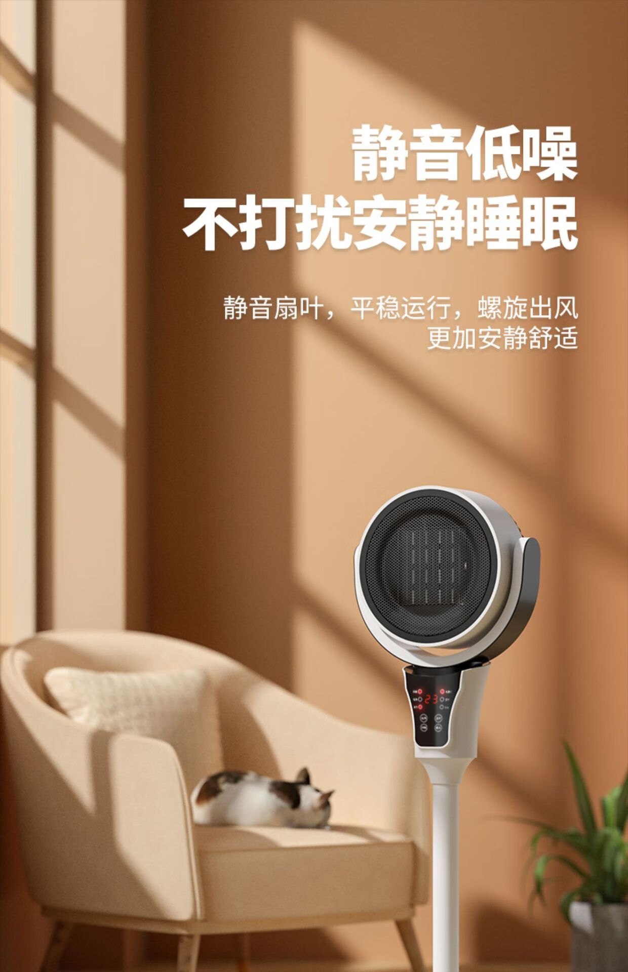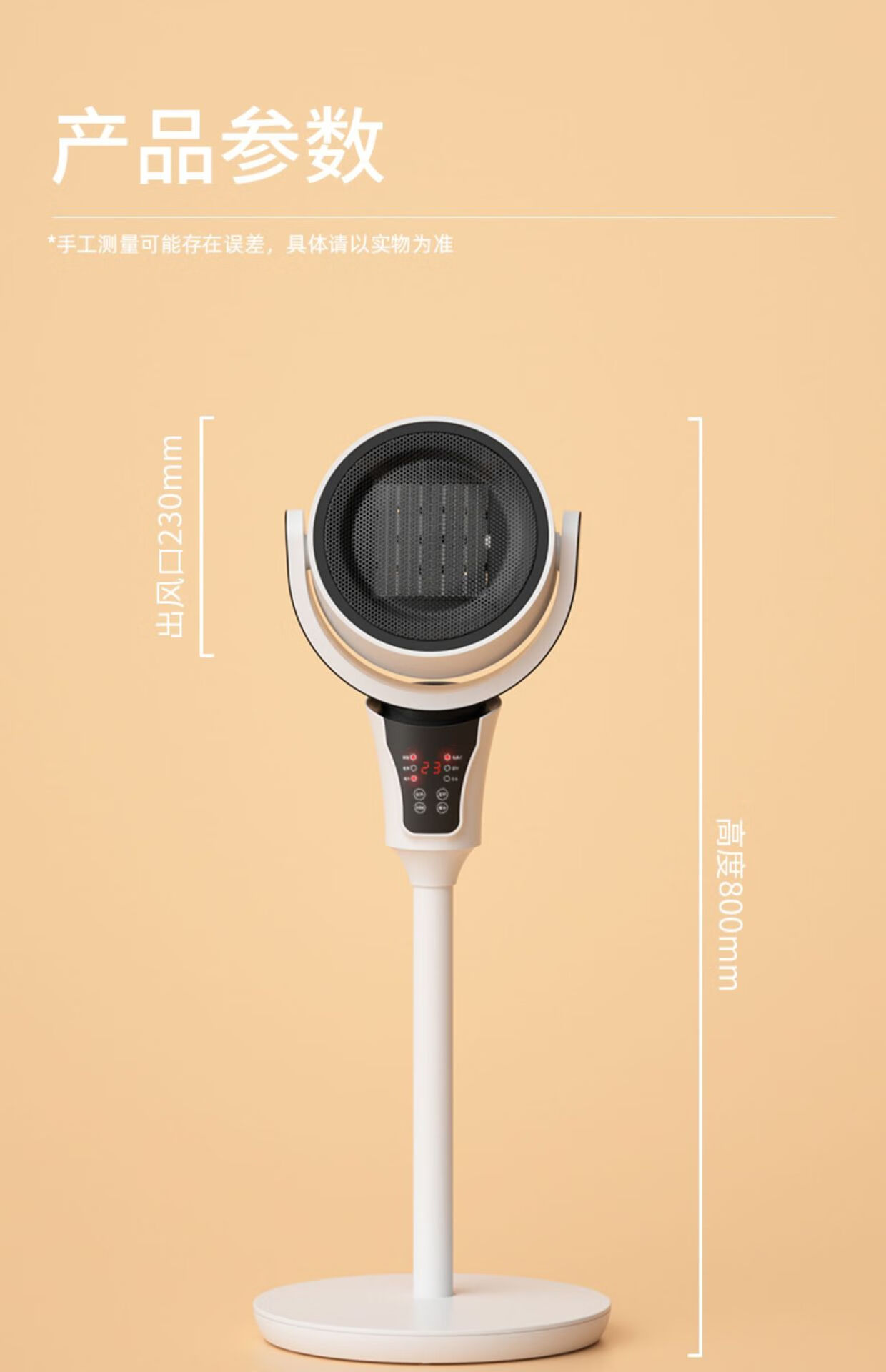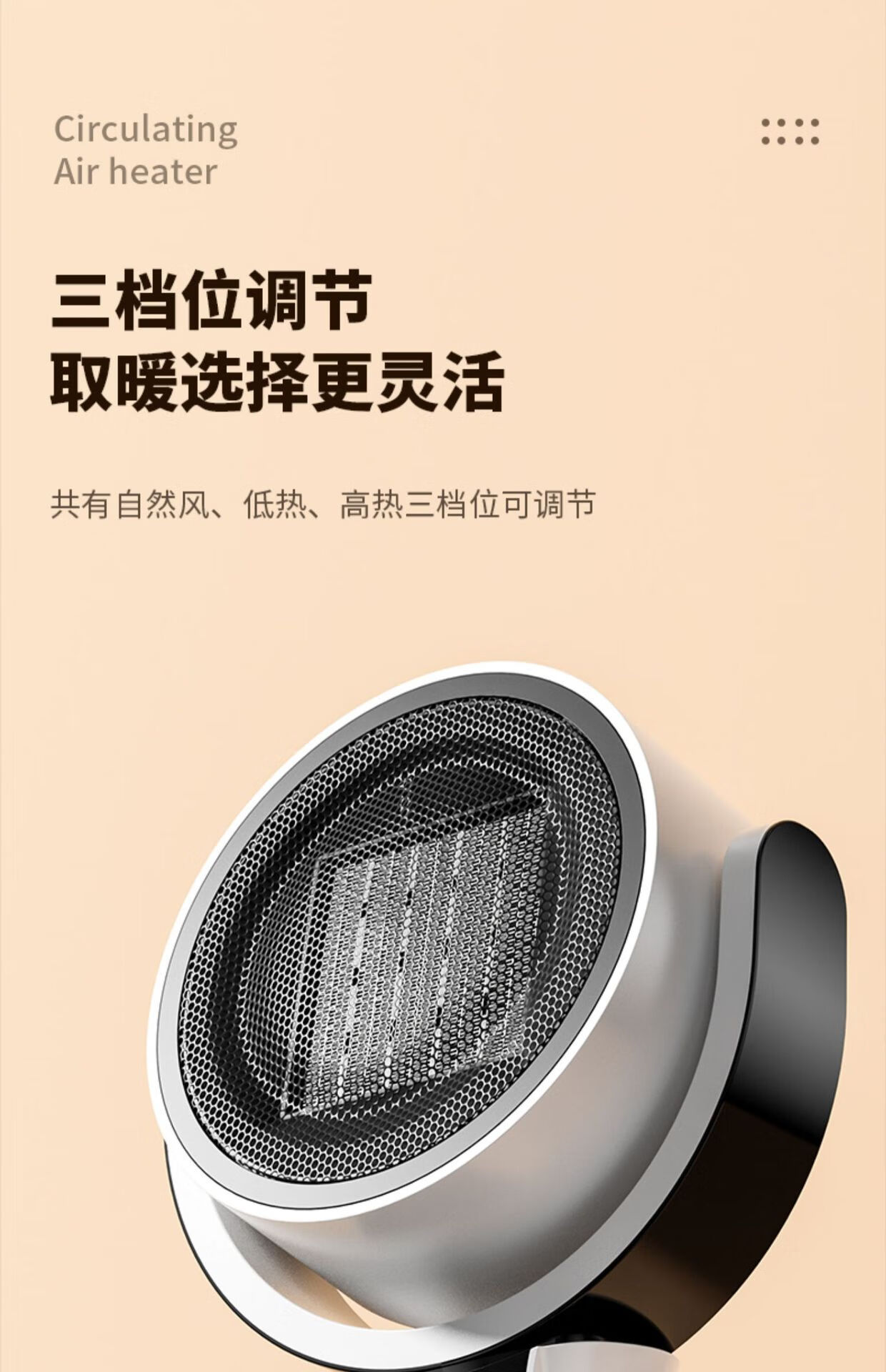广角摇头,冷暖两用,即开即热 ;过热保护,倾倒断电,优质PTC陶瓷加热;居浴两用,母婴优选,皮质手提,金属网罩使用安全;无光安静不打扰,低噪出风尽享温暖,优质电机持续出风