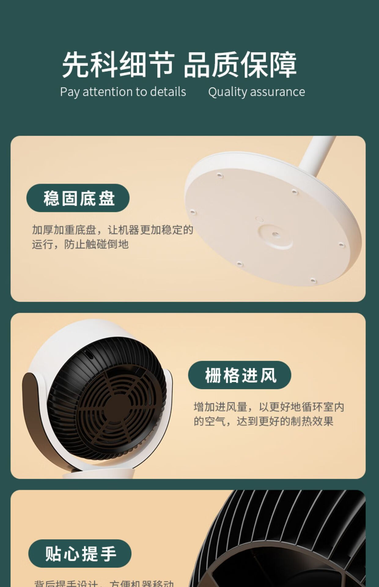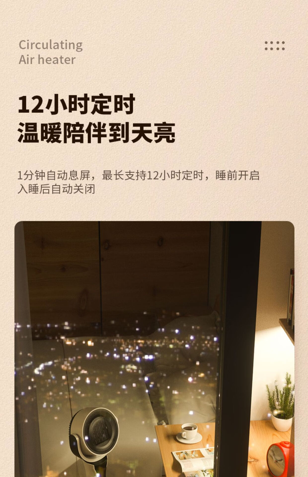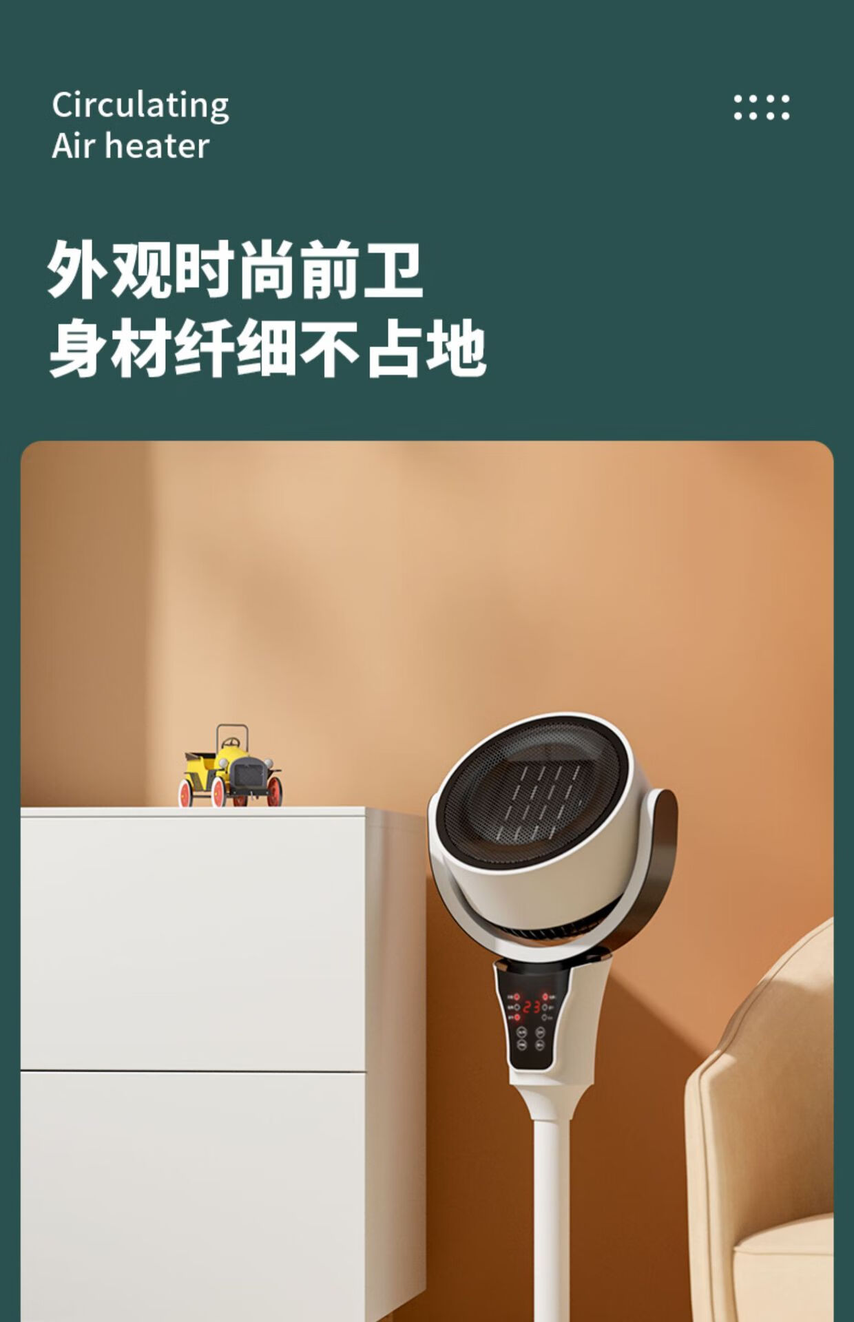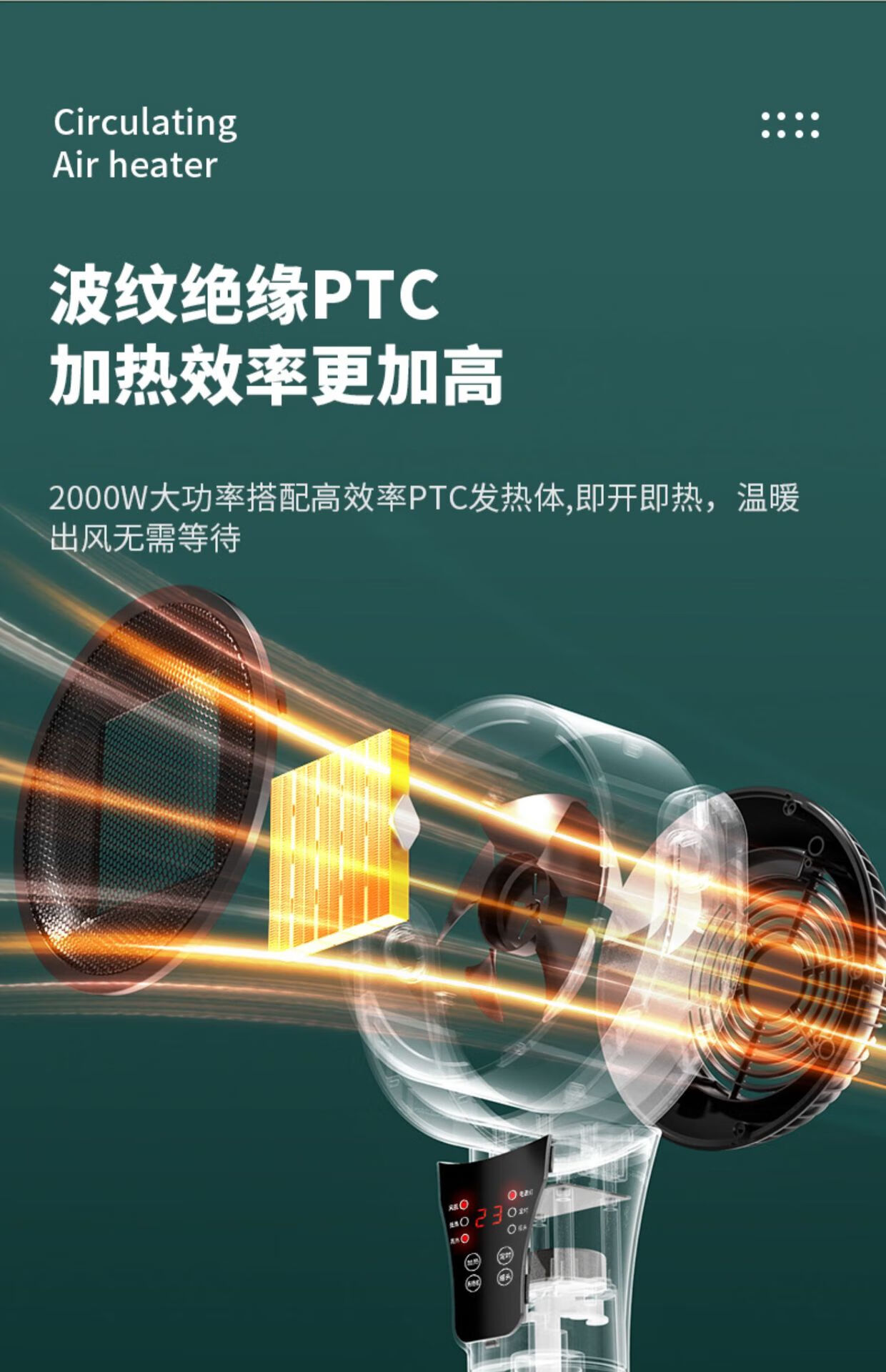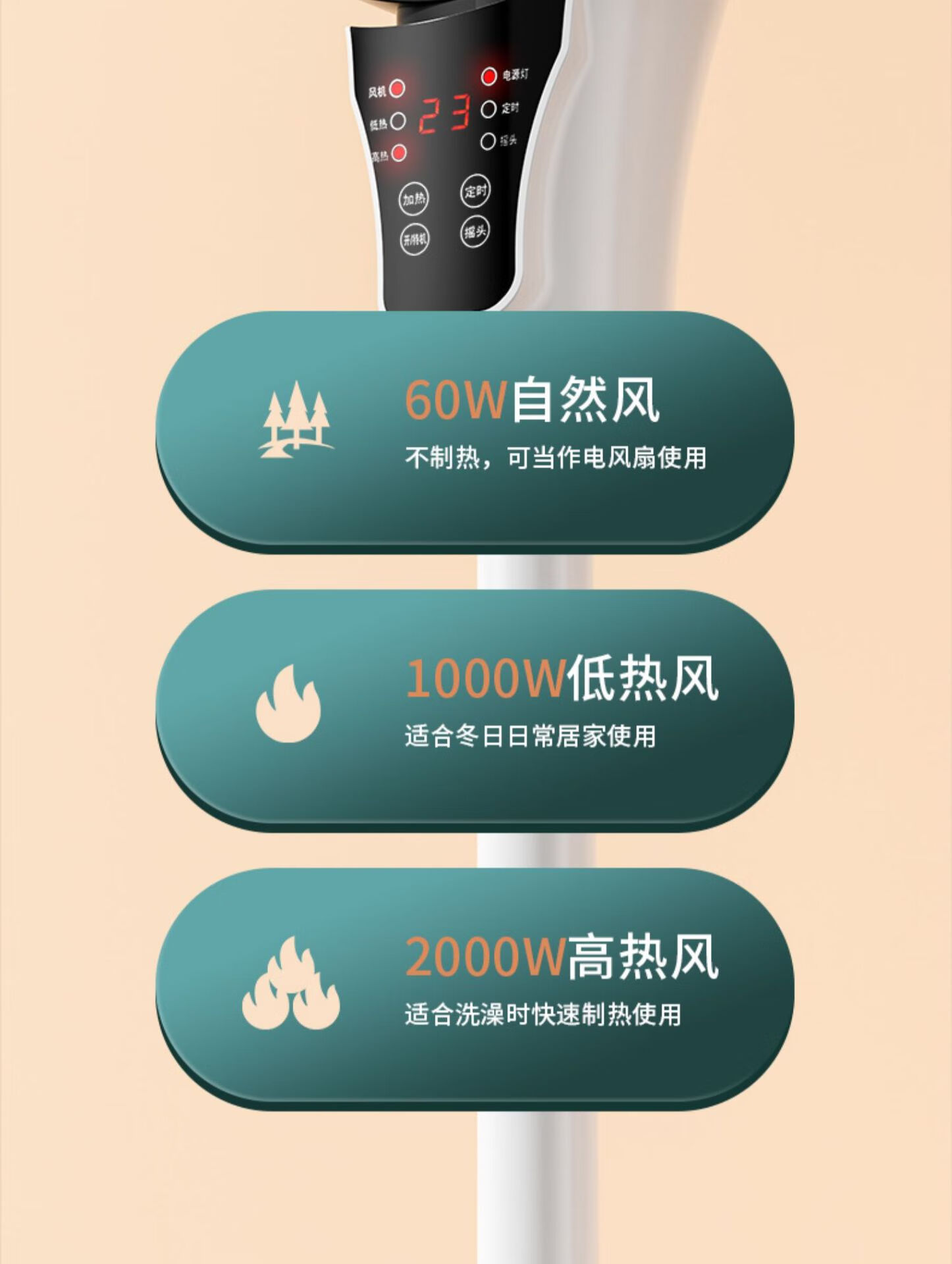 广角摇头,冷暖两用,即开即热 ;过热保护,倾倒断电,优质PTC陶瓷加热;居浴两用,母婴优选,皮质手提,金属网罩使用安全;无光安静不打扰,低噪出风尽享温暖,优质电机持续出风
