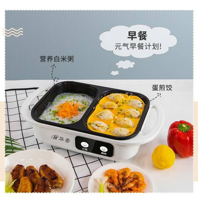 煎/烤/烙/煮/涮/火锅,实现多功能料理;一键开关,独立控温,可单独涮煮、煎烤;双重保护:高温自动跳断,漏电自动断开;食品级不粘涂层内胆,食物不粘底,易清洁;小巧外观易收纳,厨房、宿舍都适用