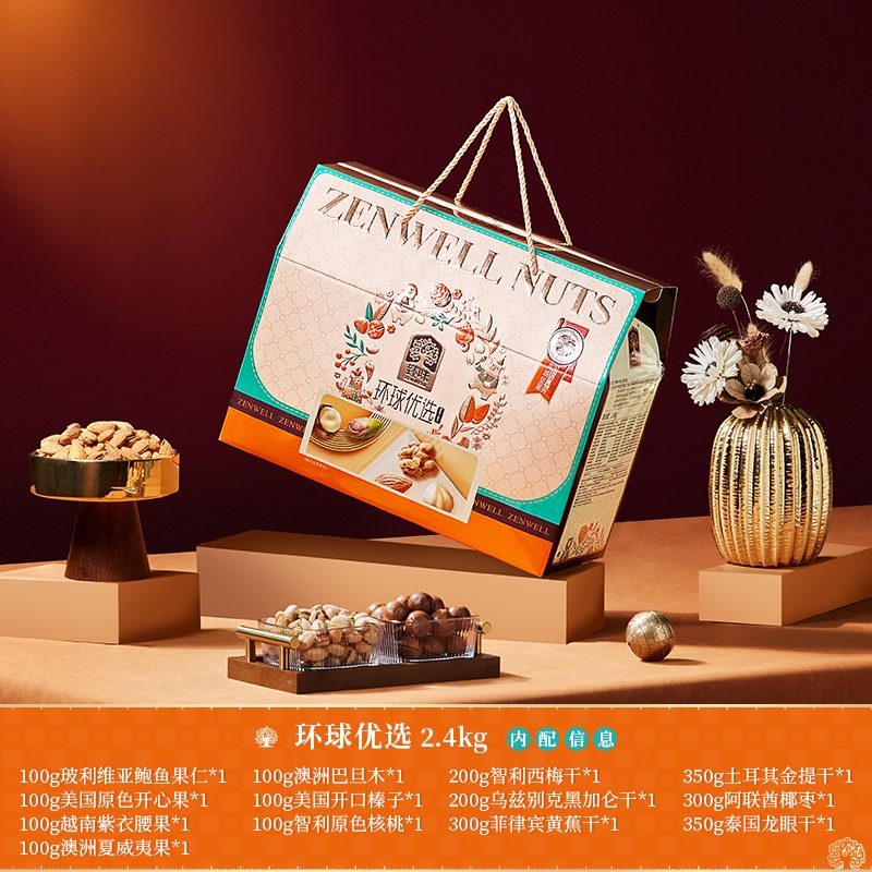 环球优选,超性价比之选;更大空间,更大分量,更显华贵大方,份量感十足质感满;7种坚果,6种果干,份量十足