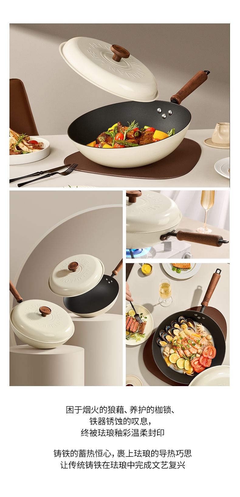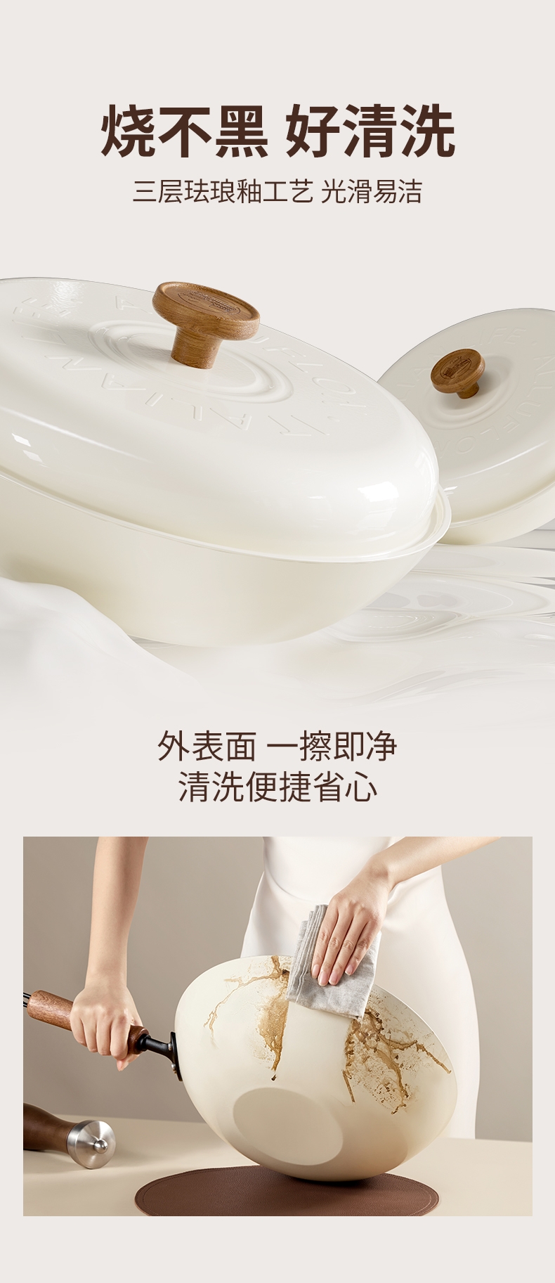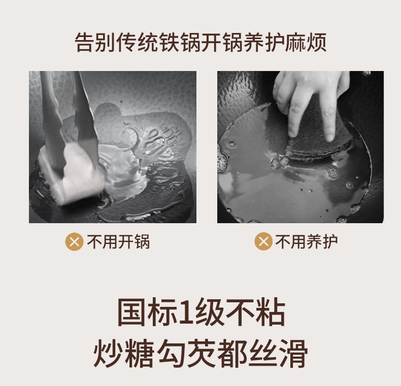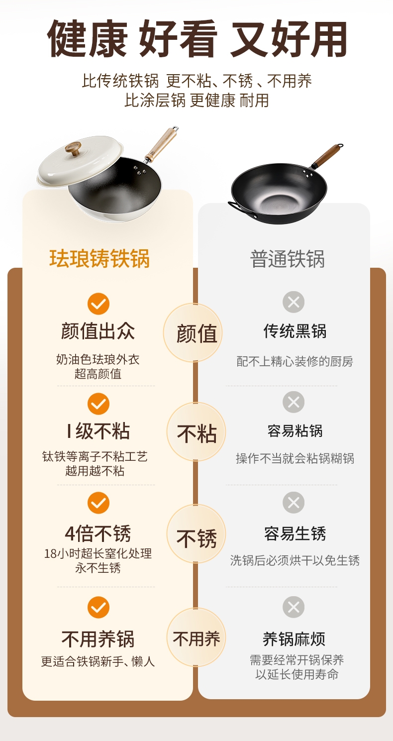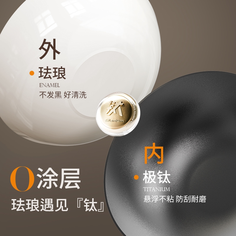 颜值出众,奶油色珐琅外衣;I级不粘,等离子不粘工艺;4倍不锈,18小时超长窒化处理;不用养锅,更适合铁锅新手、懒人
