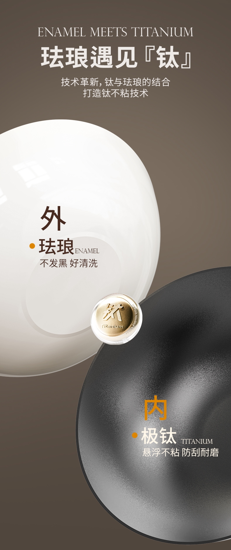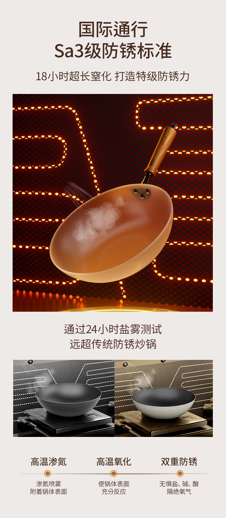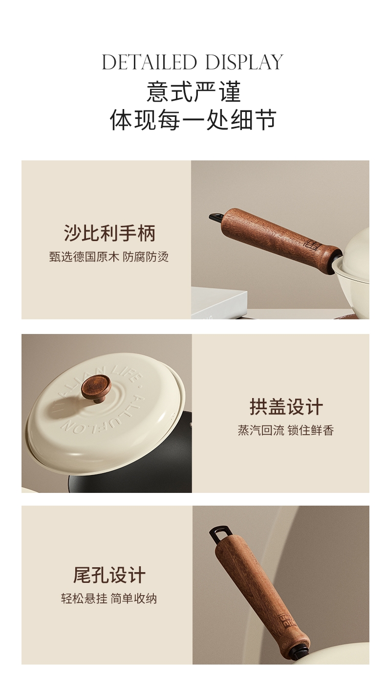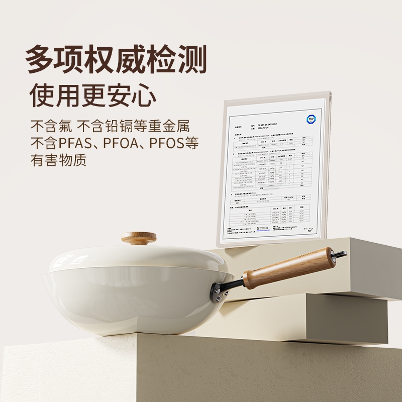 颜值出众,奶油色珐琅外衣;I级不粘,等离子不粘工艺;4倍不锈,18小时超长窒化处理;不用养锅,更适合铁锅新手、懒人
