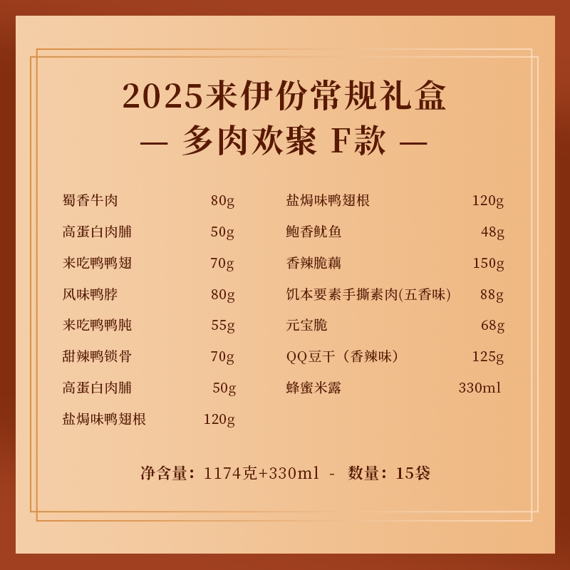 配置清单:·蜀香牛肉80g ·高蛋白肉脯50g ·70g鸭翅 ·80g风味鸭脖 ·55g鸭肫 ·70g甜辣鸭锁骨 ·高蛋白肉脯50g ·盐焗味鸭翅根120g ·盐焗味鸭翅根120g ·鲍香鱿鱼48g ·香辣脆藕150g ·饥本要素手撕素肉(五香味)88g ·元宝脆RY68g ·QQ豆干(香辣味)125g ·蜂蜜米露330ml ·来伊份多肉欢聚礼盒