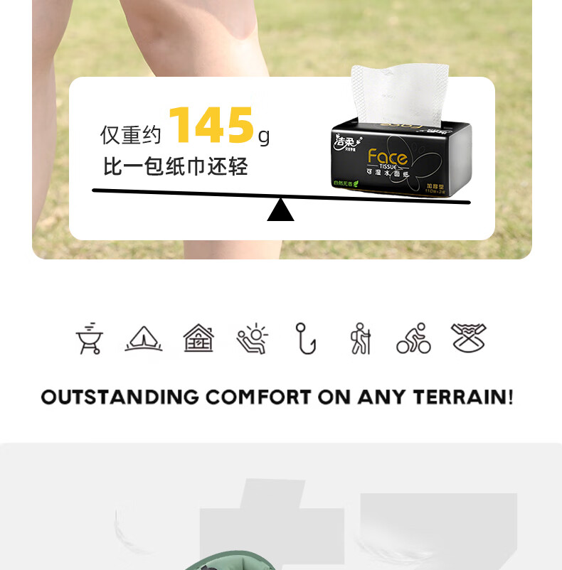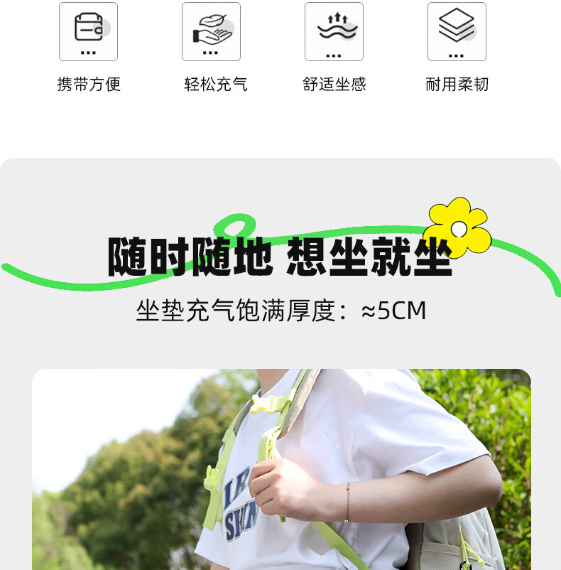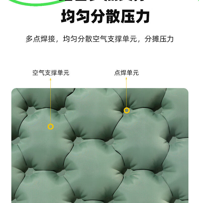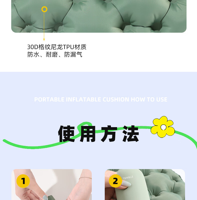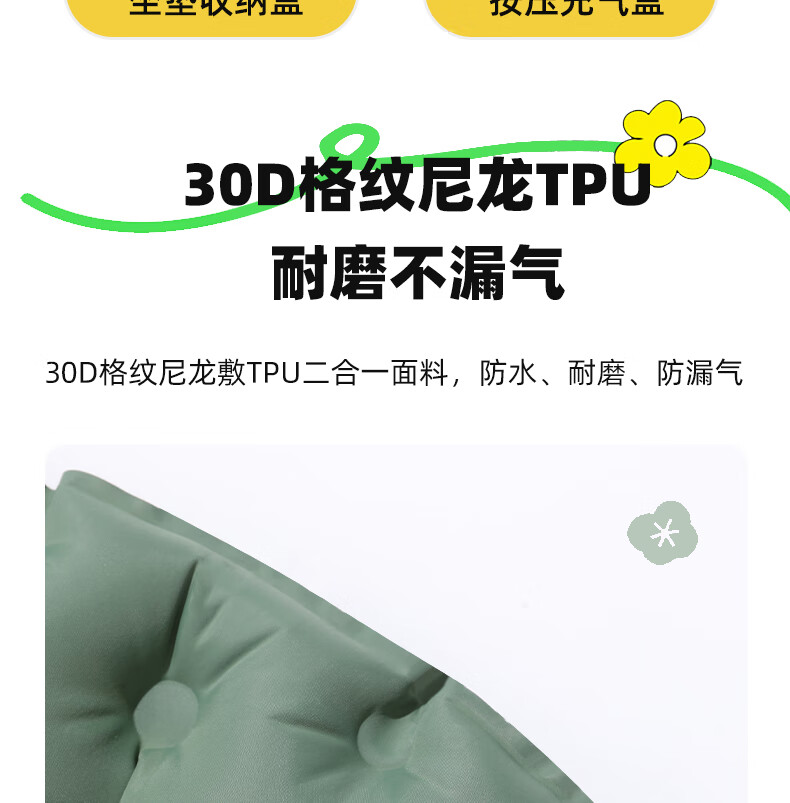 轻盈手感,徒步登山更轻松;小体积易携带背包侧边轻松收纳;不仅能收纳还可以充气;30D格纹龙TPU耐磨不漏气