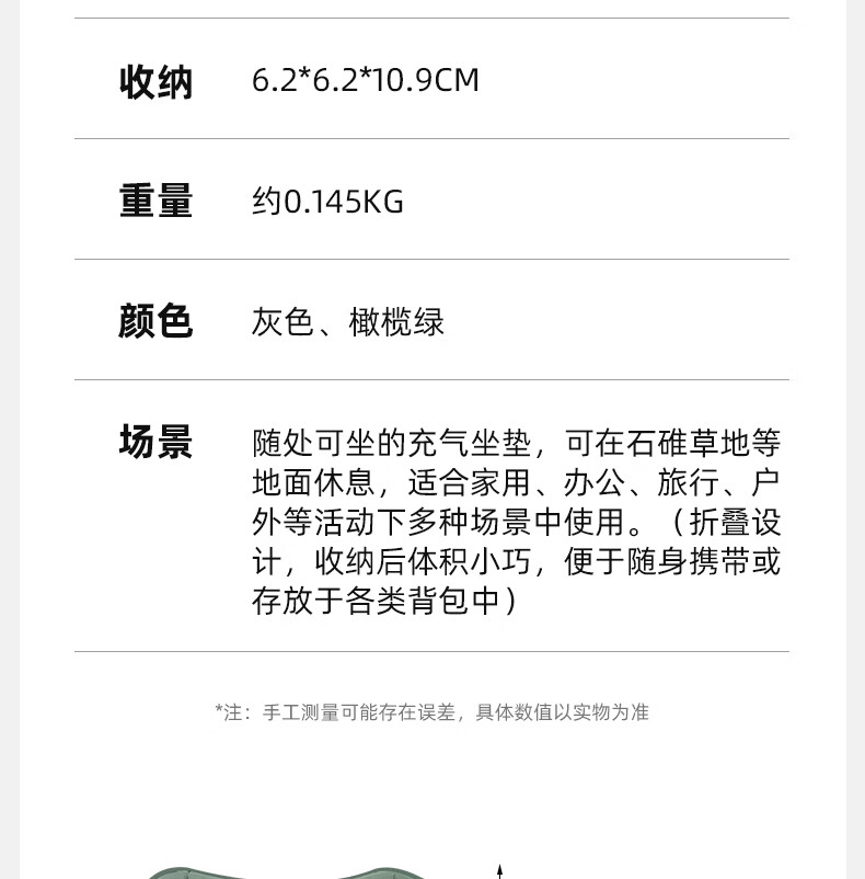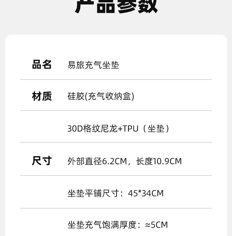 产品尺寸:外部直径6.2cm,长度10.9cm 坐垫平铺尺寸45*34cm 坐垫充气饱满厚度≈5cm