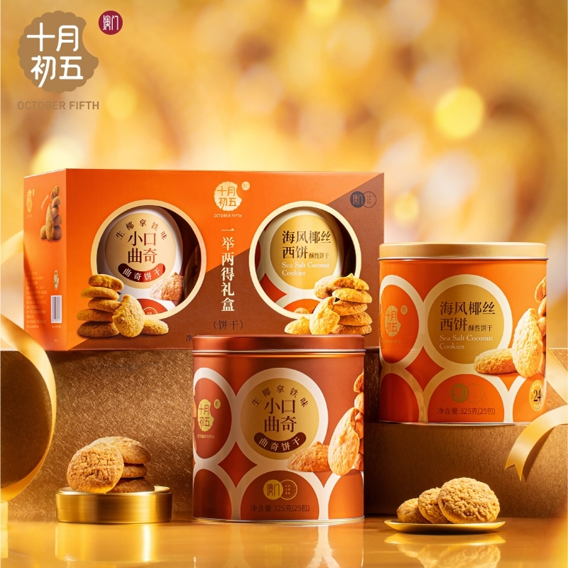 配置清单:1、十月初五325g海风椰丝西饼X1罐 2、十月初五325g小口曲奇(生椰拿铁味)X1罐 卖点:极其适合团购福利组合礼盒