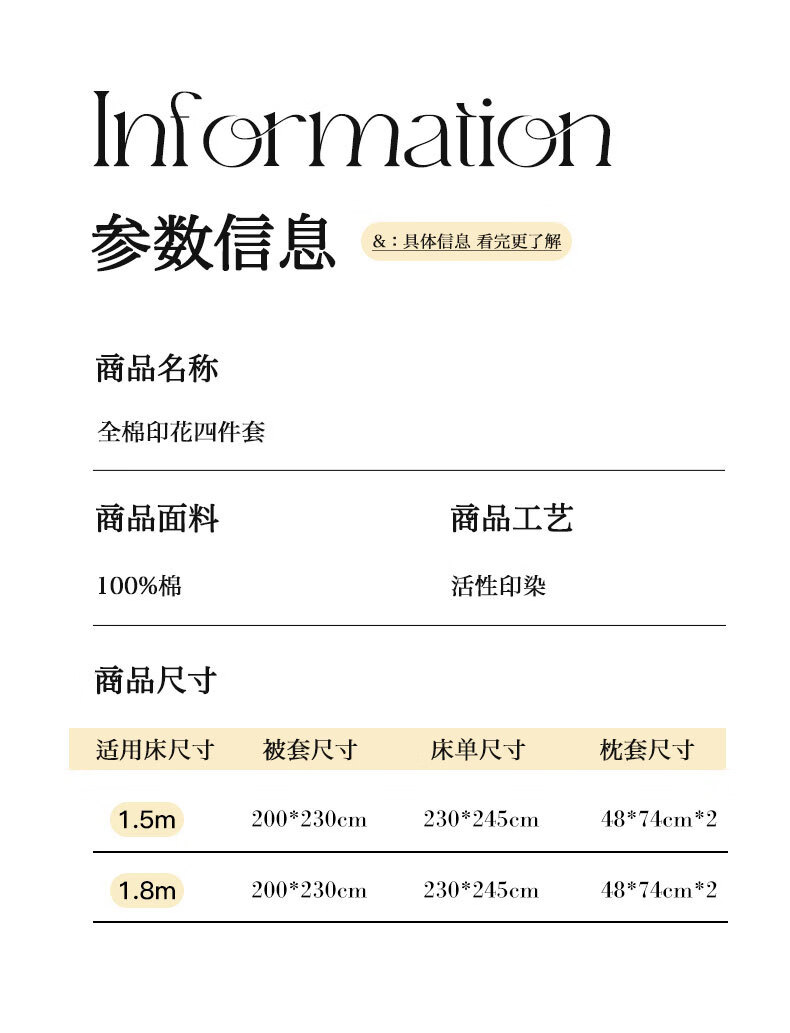 规格:被套:200×230cm 床单:230×250cm 枕套:48×74cm