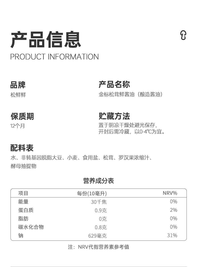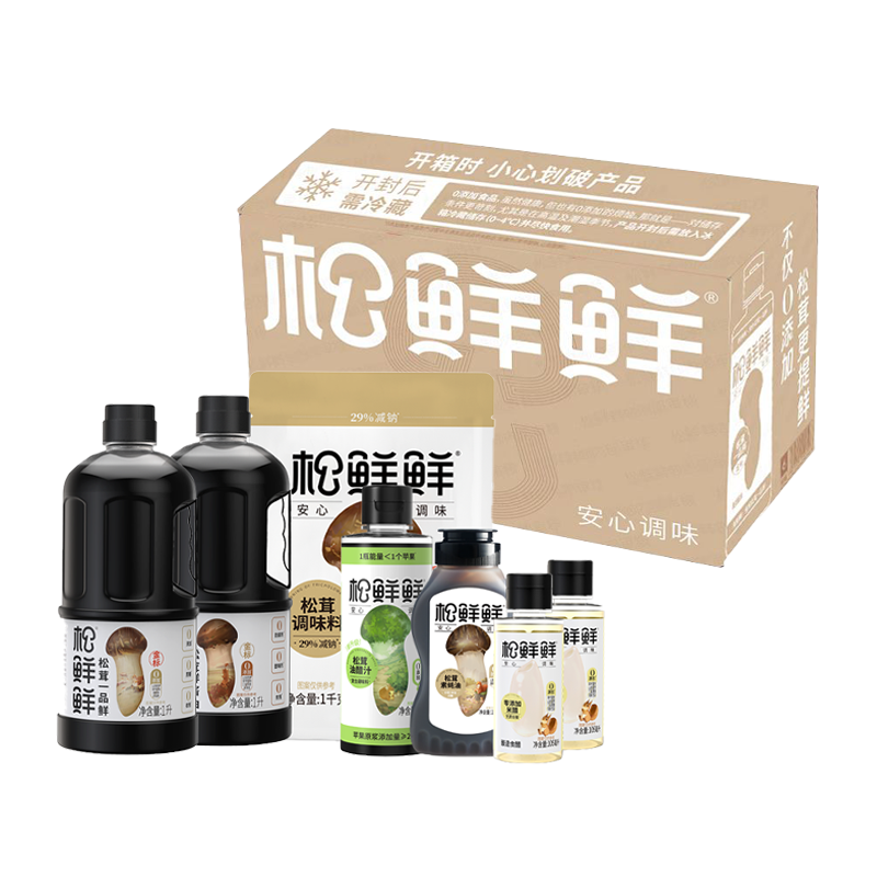 配置清单:1、金标松茸一品鲜1L/瓶*1瓶 2、金标松茸鲜酱油1L瓶*1瓶 3、松茸调味料1Kg*1包 4、松鲜鲜0添加米醋105ml*2瓶 5、松茸油醋汁280g*1瓶 6、金标松茸素蚝油235g*1瓶 注:无礼盒,快递纸箱装。