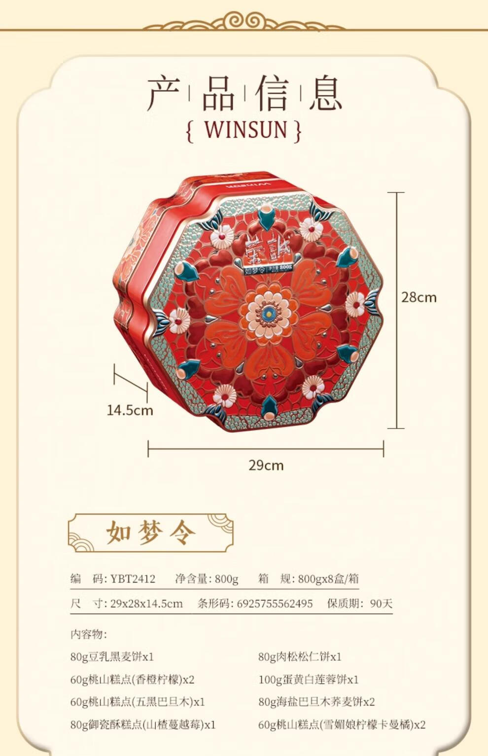 配置:80g御瓷酥糕点(山楂蔓越莓)x1 60g桃山糕点(雪媚娘柠檬卡曼橘)x2 60g桃山糕点(香橙柠檬)x2 60g桃山糕点(五黑巴旦木)x1 100g蛋黄白莲蓉饼x1 80g肉松松仁饼x1 80g豆乳黑麦饼x1 80g海盐巴旦木荞麦饼x2