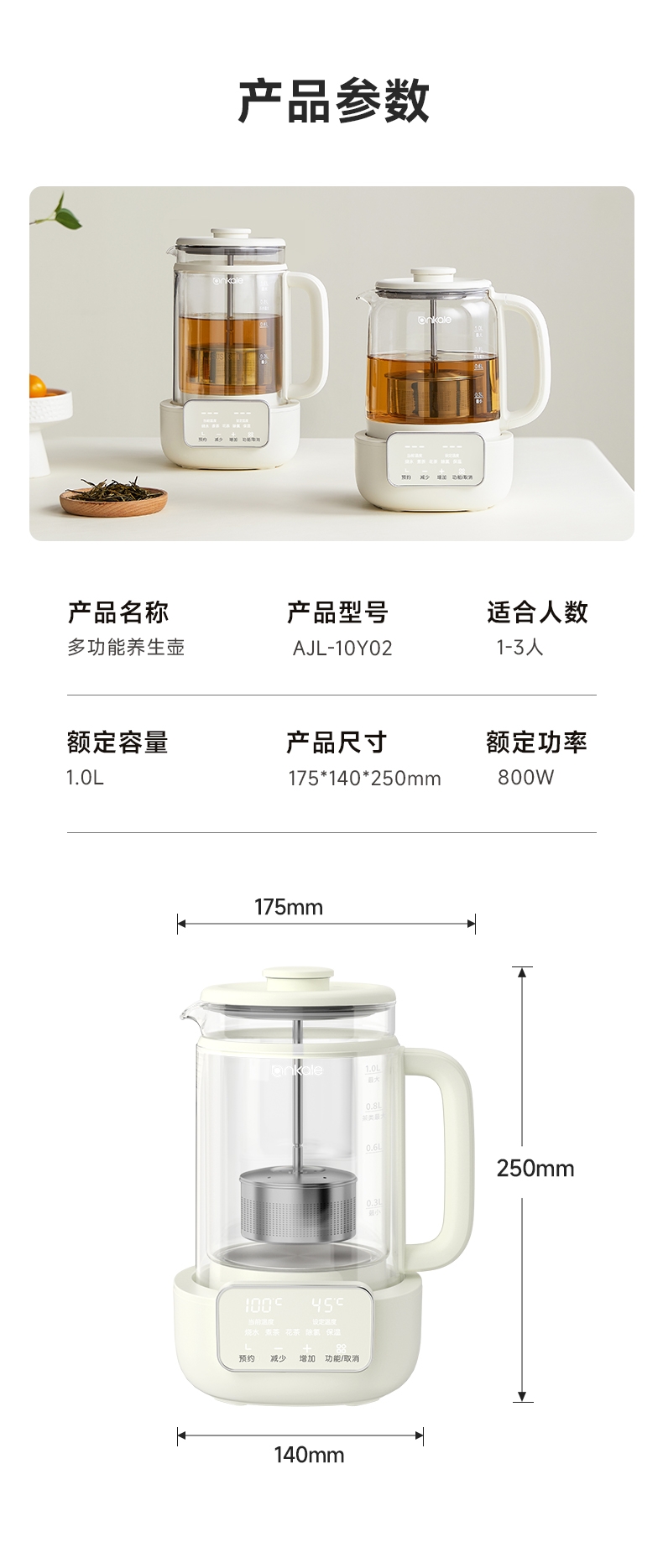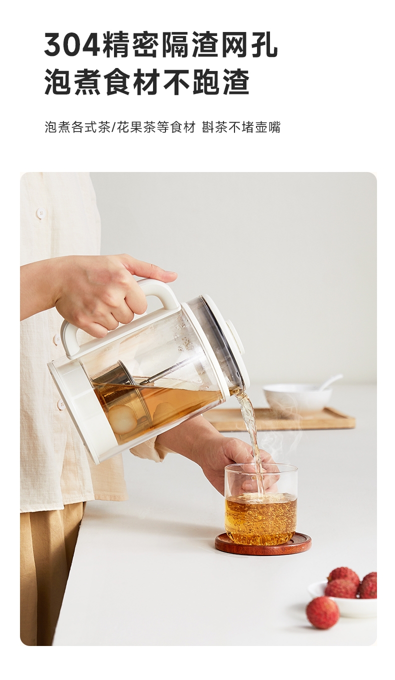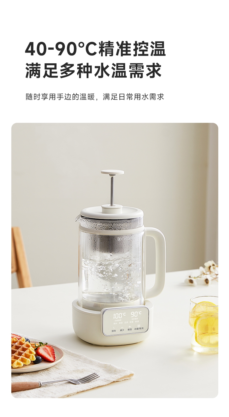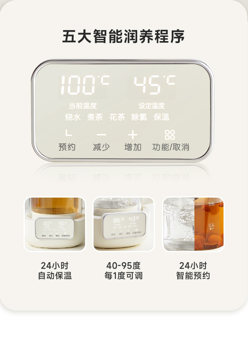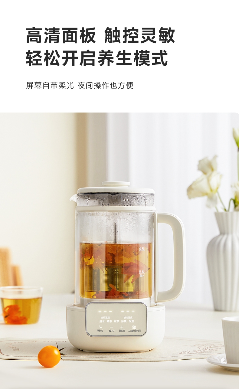 烧水、煮茶、花茶、除氯、保温,预约功能;1L黄金容量,适合容量不浪费;外观简洁、美观;喷钛油,材质安全健康;带茶漏、茶漏拆卸方便可上下移动使用方便