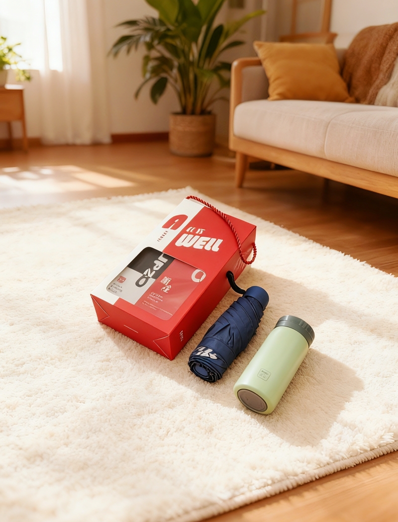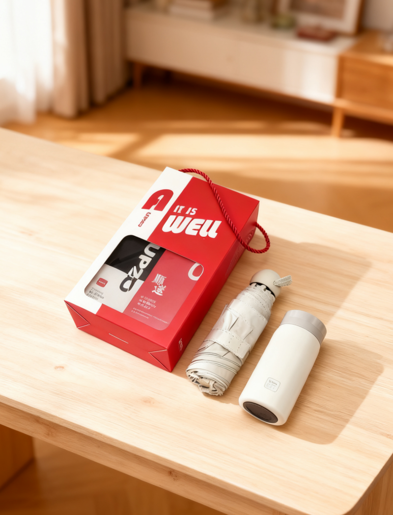 小确幸主题杯 设计融入祝福语 杯体撞色搭配 ;晴雨两用伞 90直径 6骨 色彩靓丽 ;手提盒设计 顺遂主题融入 优质伴手礼