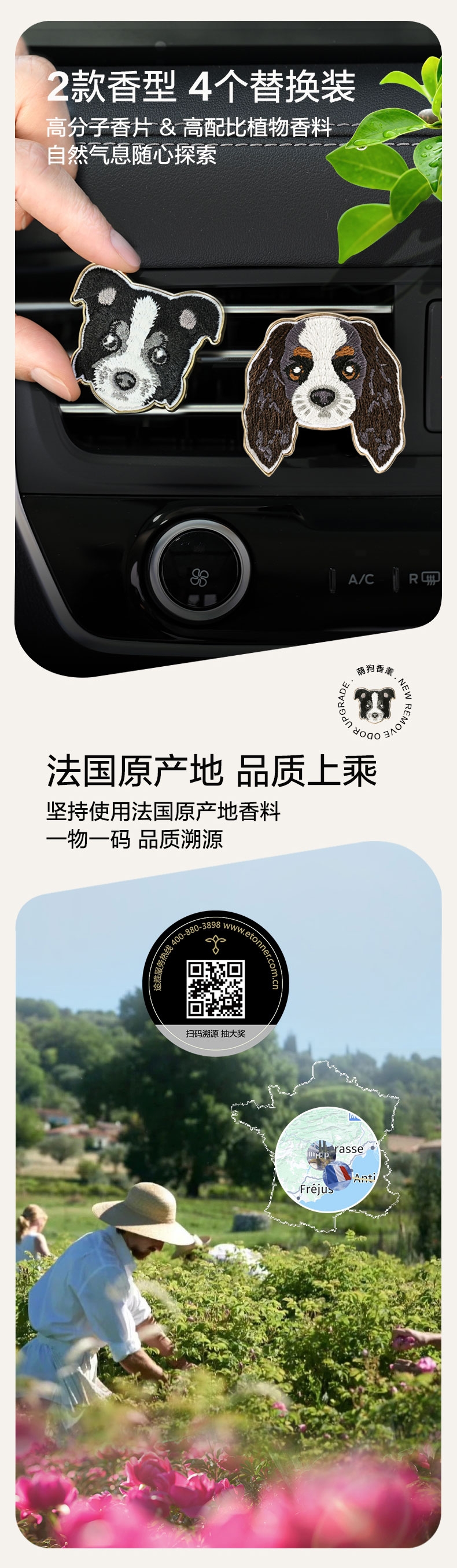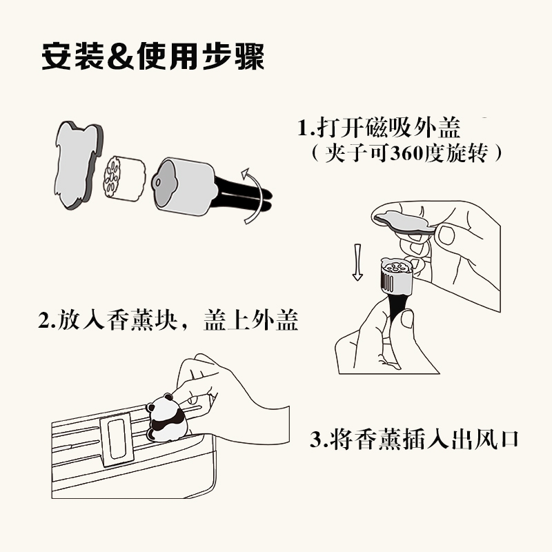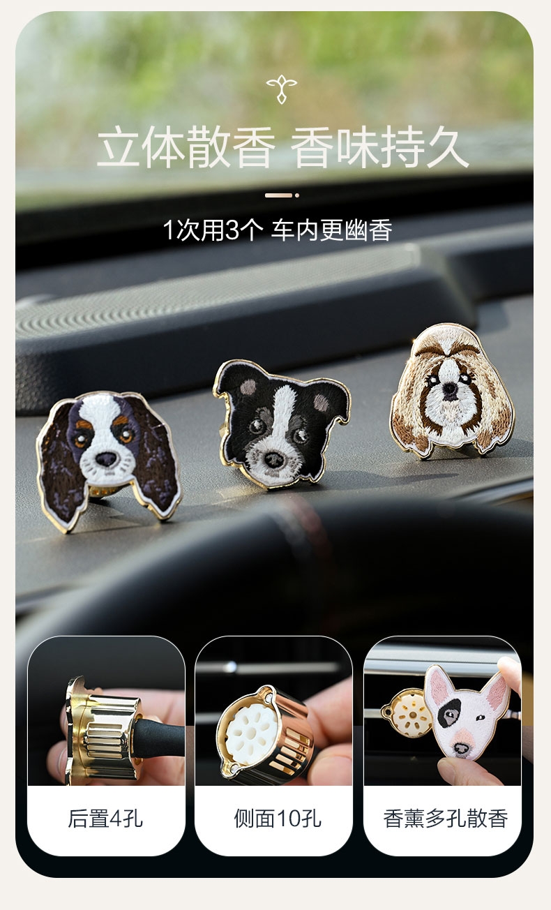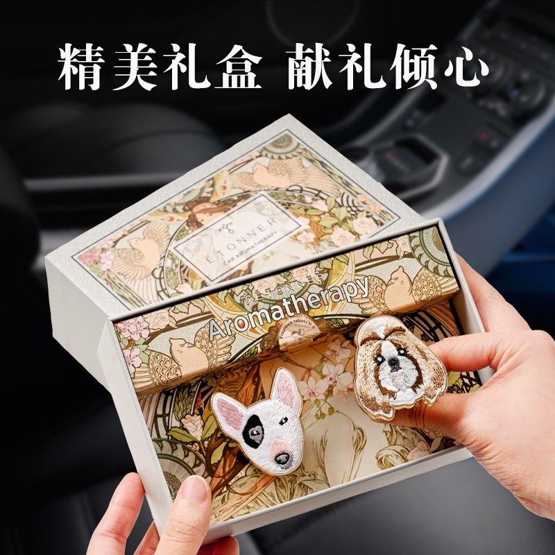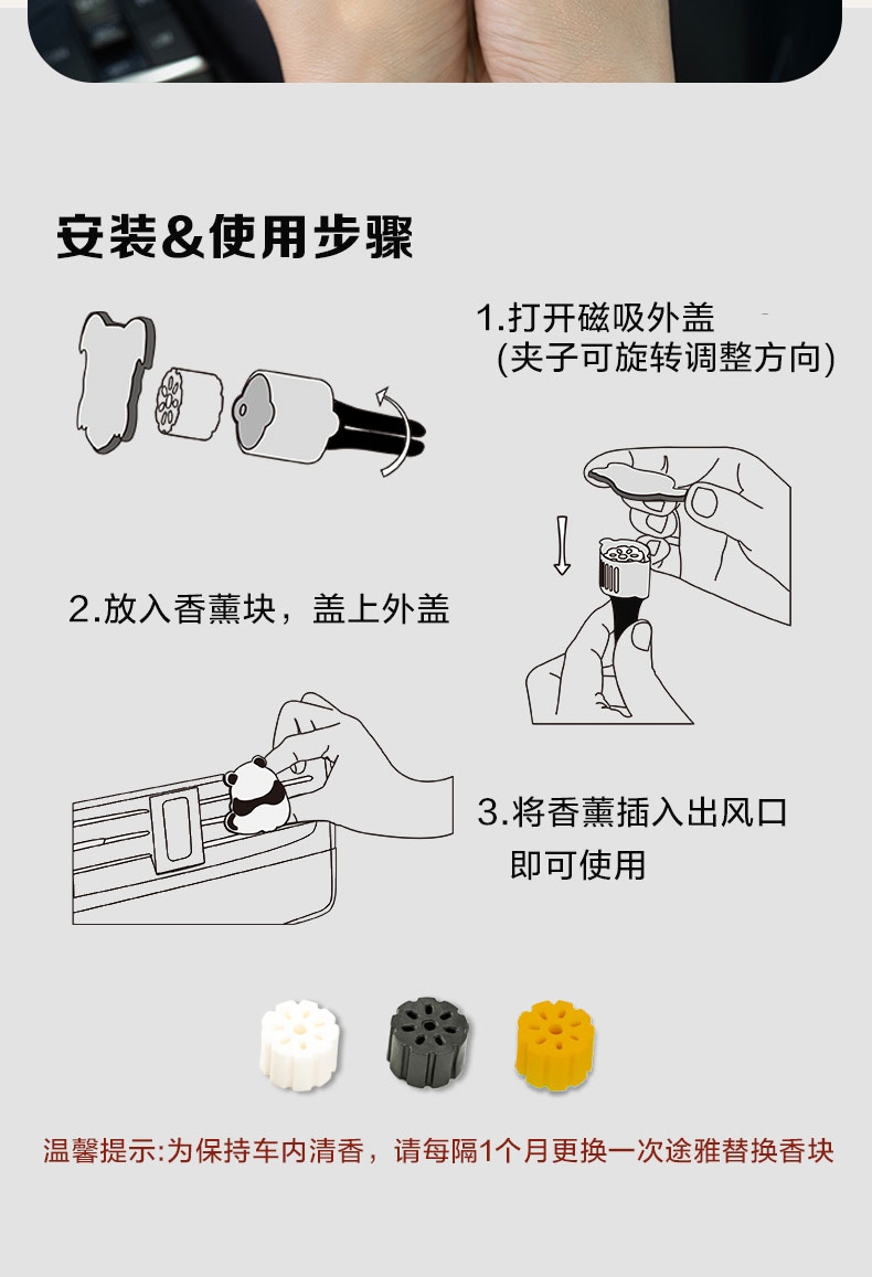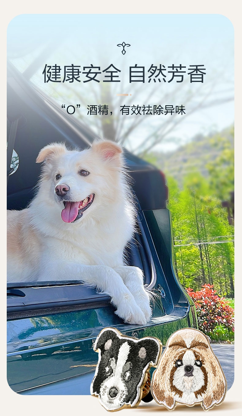 配置清单:锌合金材质,高精刺绣图案,包装内含高分子固体香块:,使用2-3个月