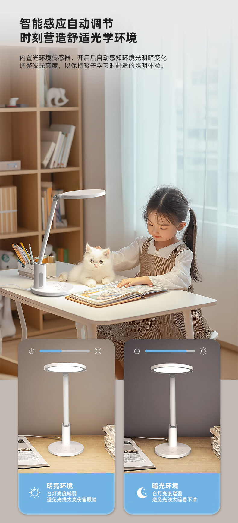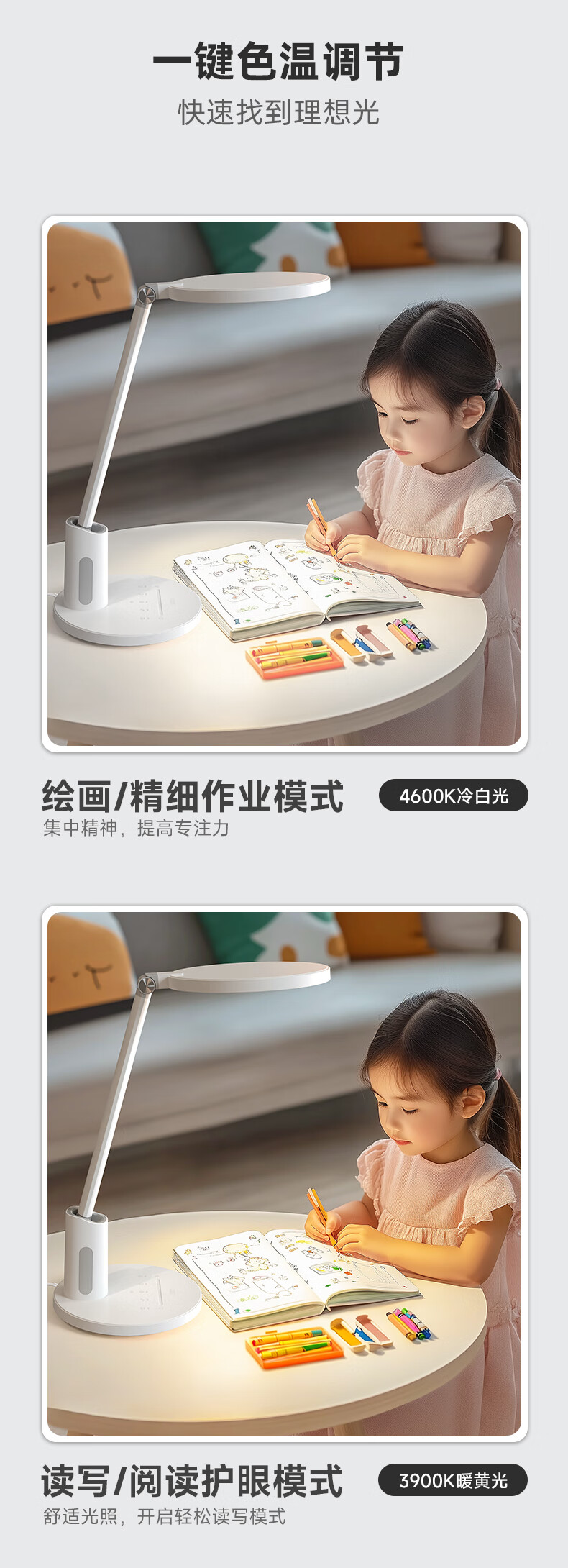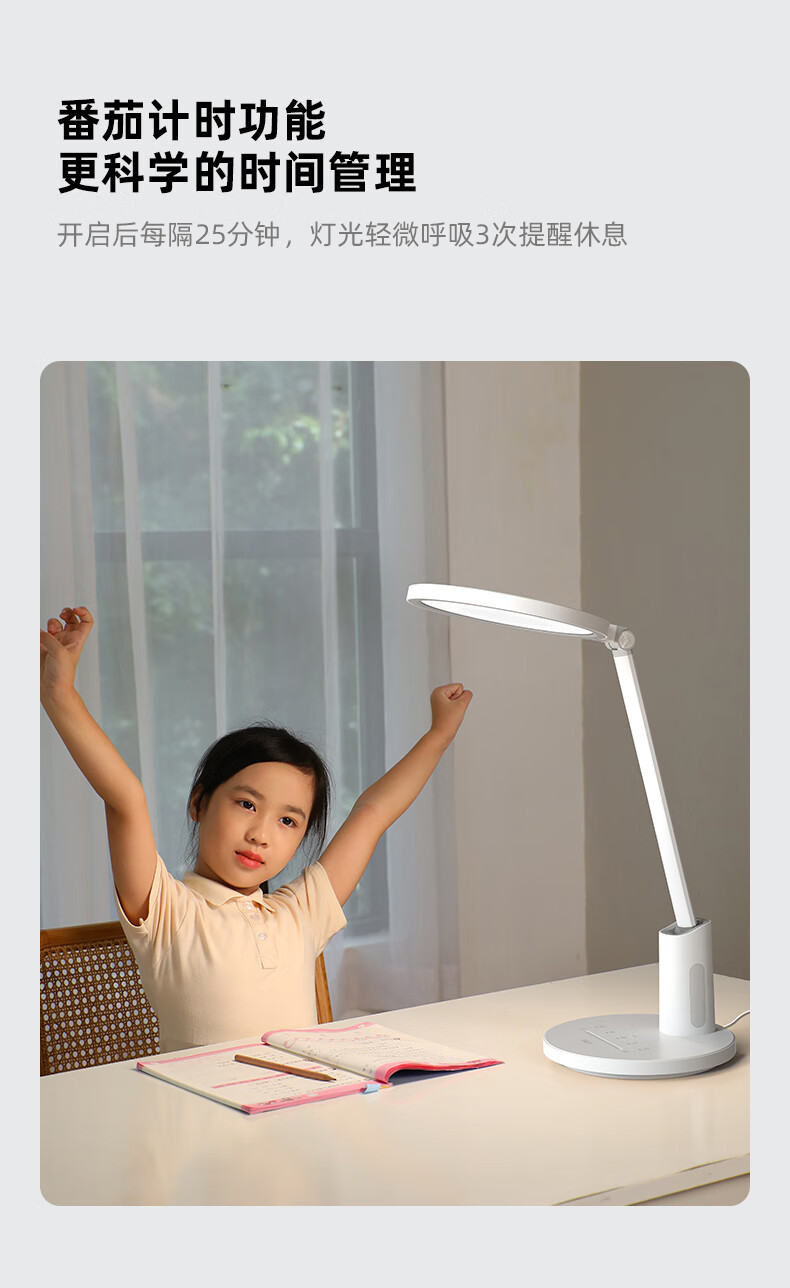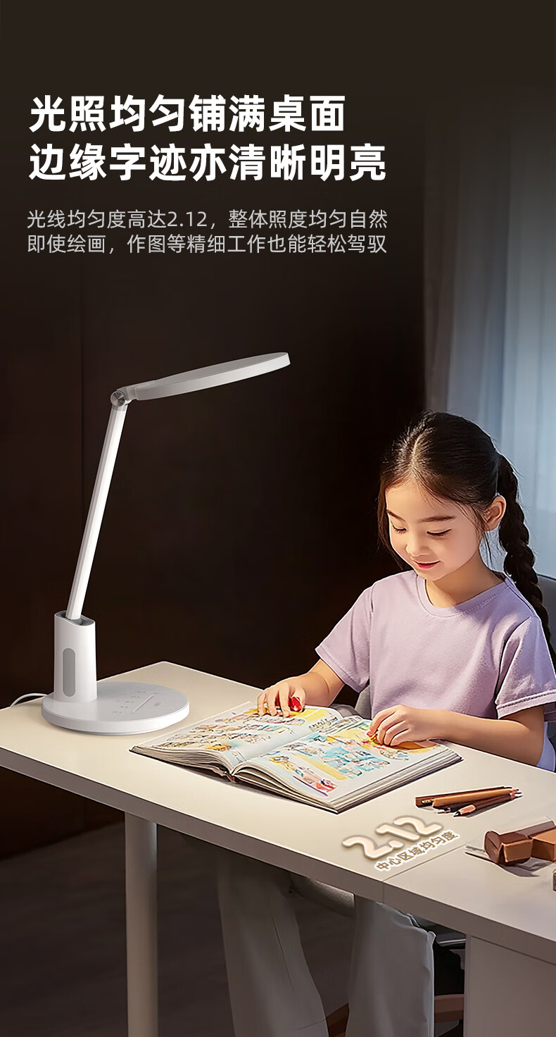 近96颗好视力高定灯珠 智能感光记忆感应周边环境光;两档色温调节读写与绘画模式轻松切换;清华博士团队联合研发