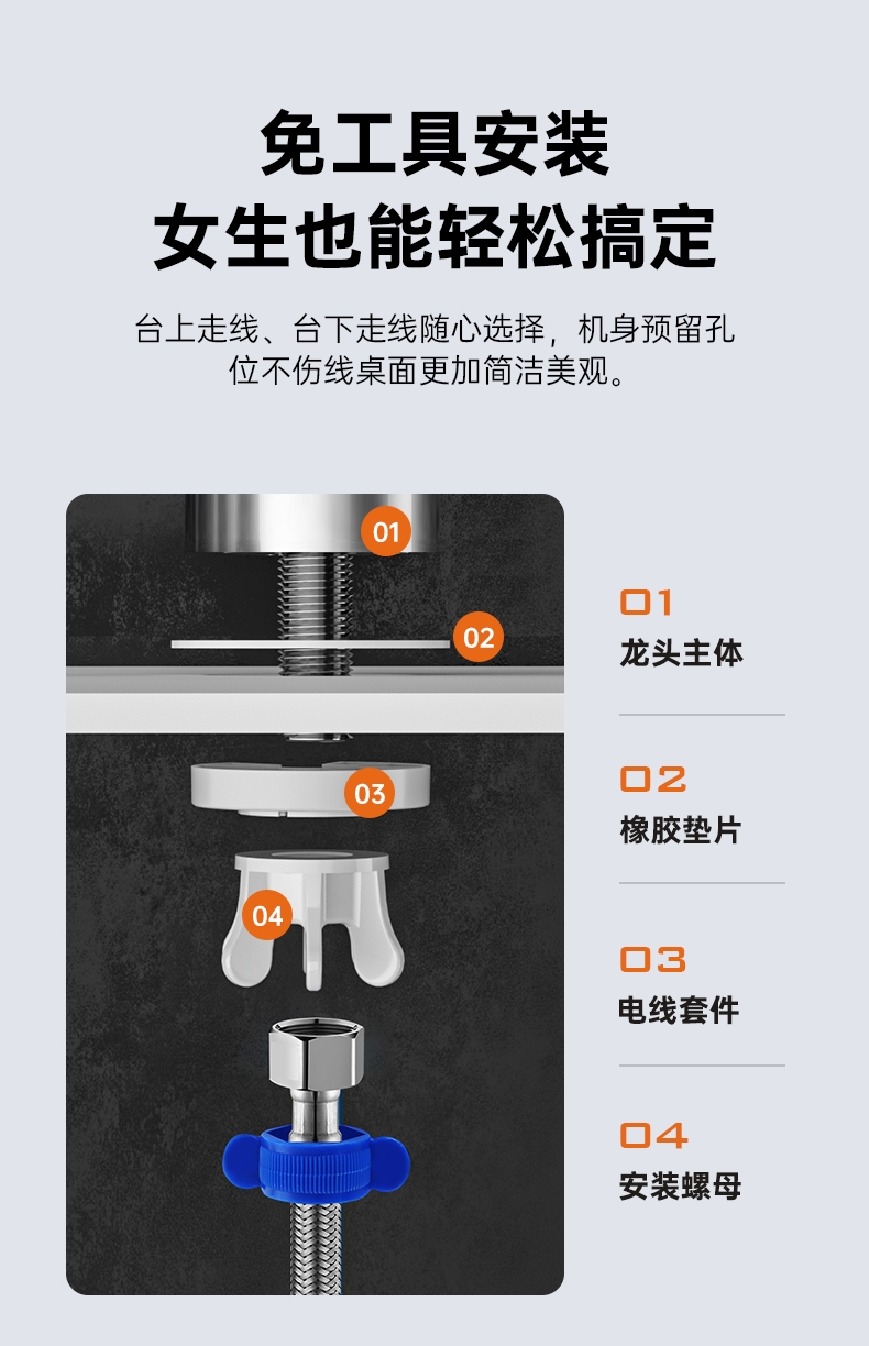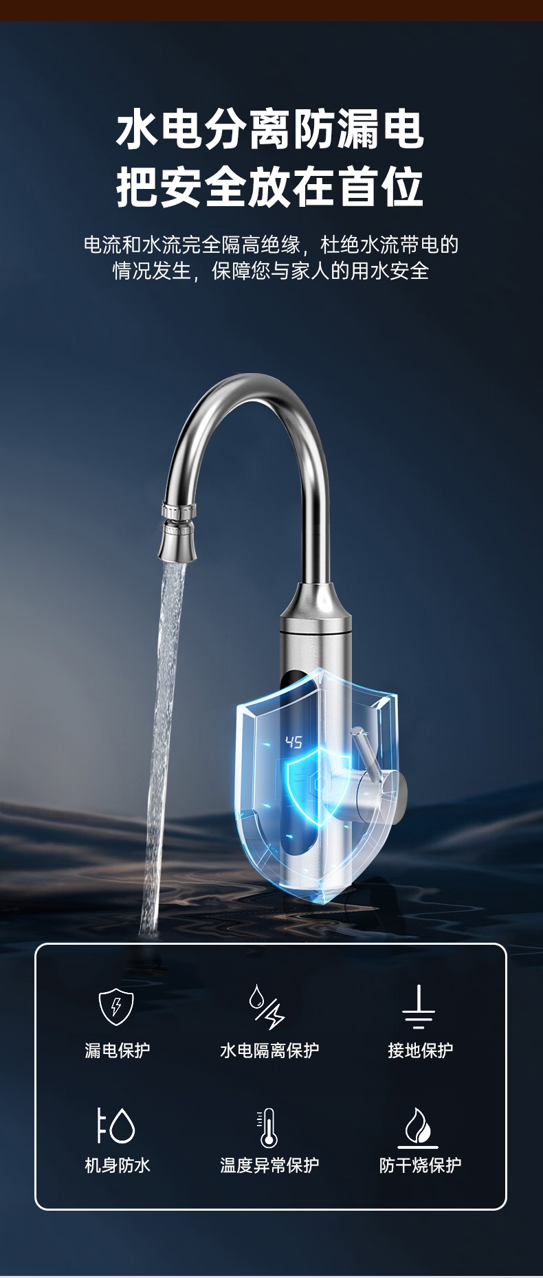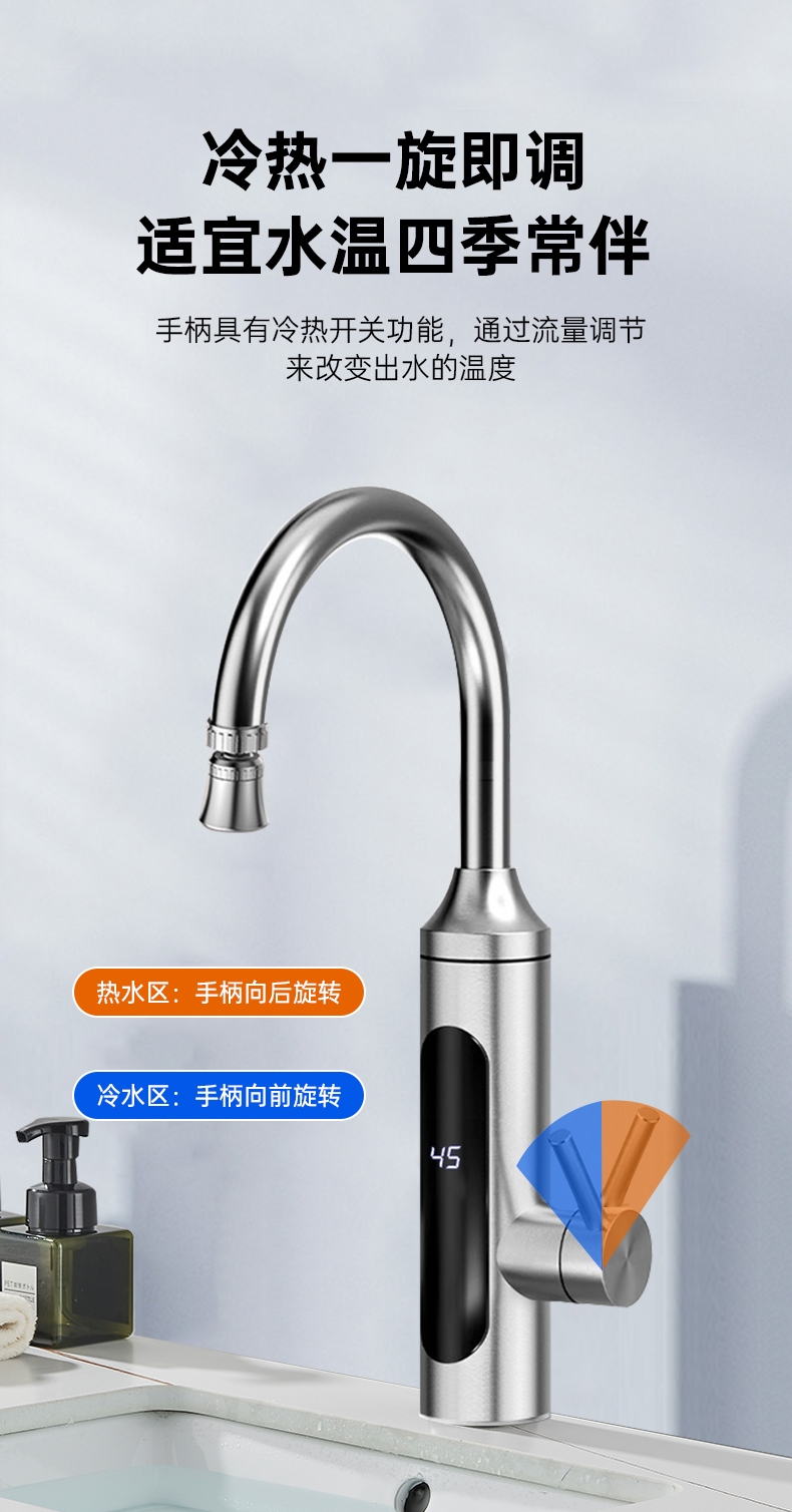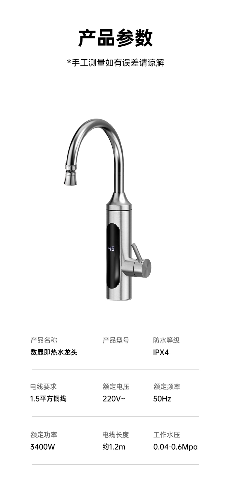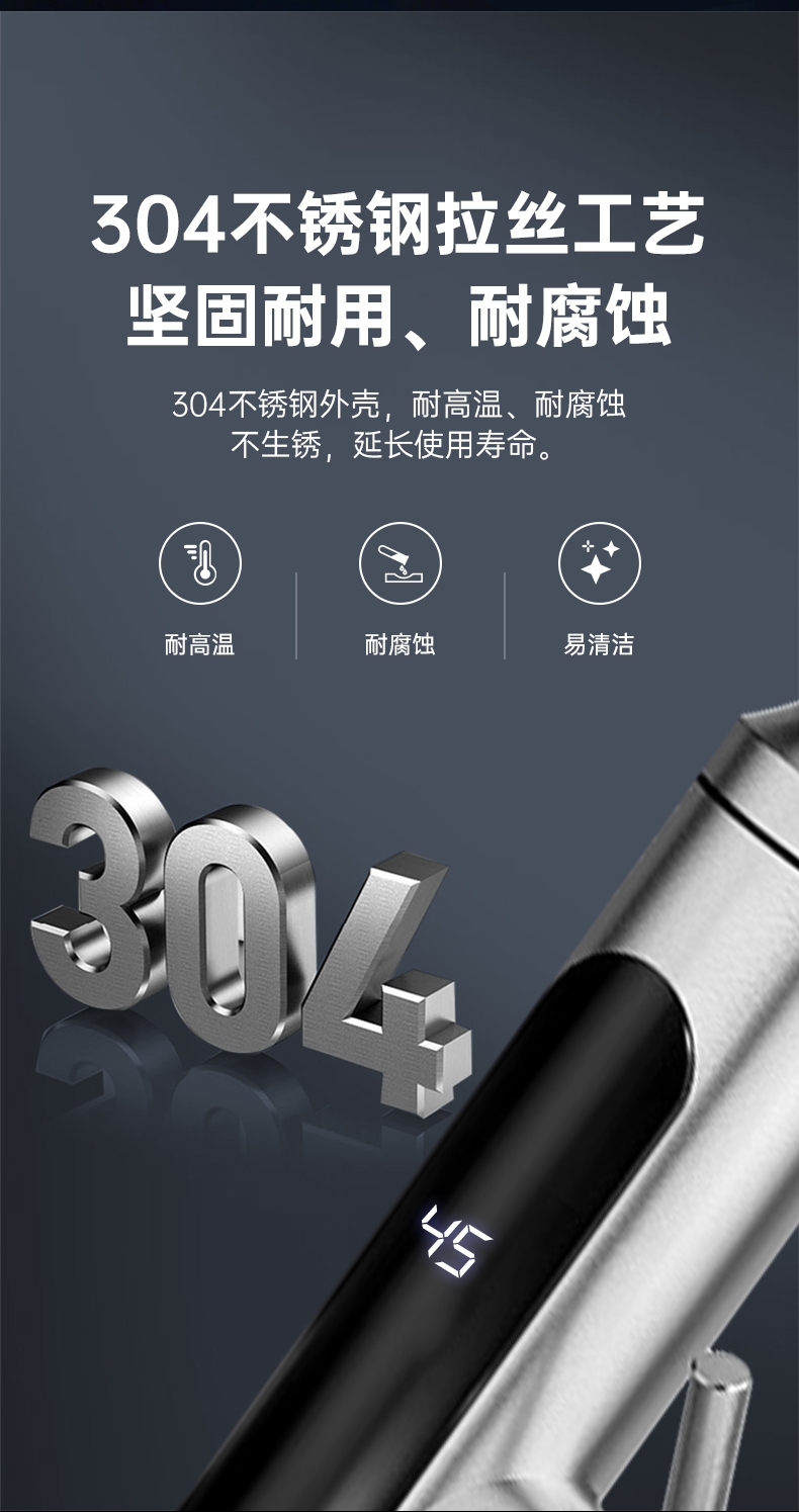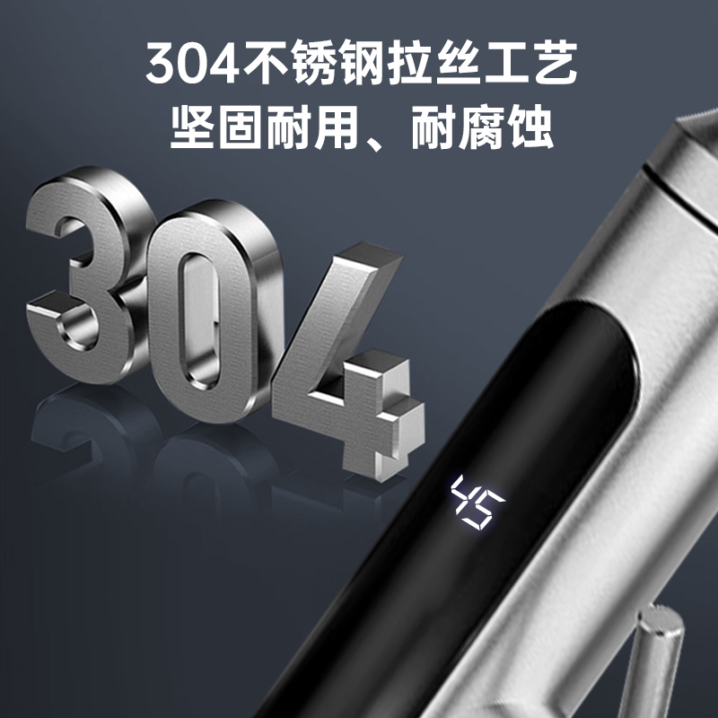 304不锈钢拉丝工艺 坚固耐用、耐腐蚀;安全漏保智能数显;360°旋转弯管告别日常清洗死角