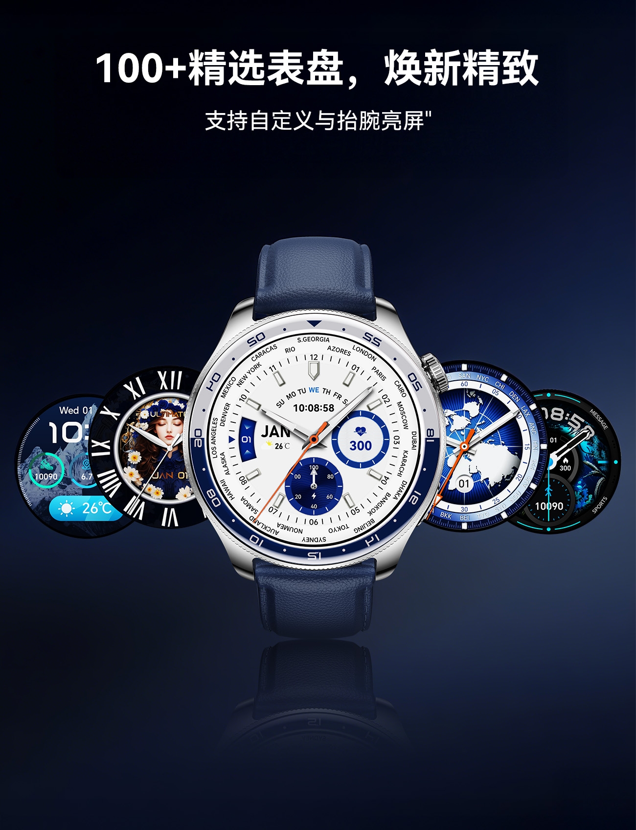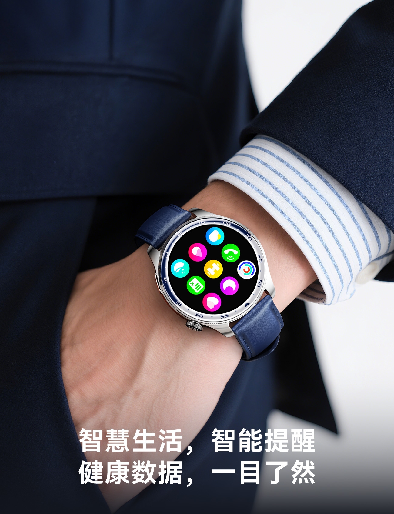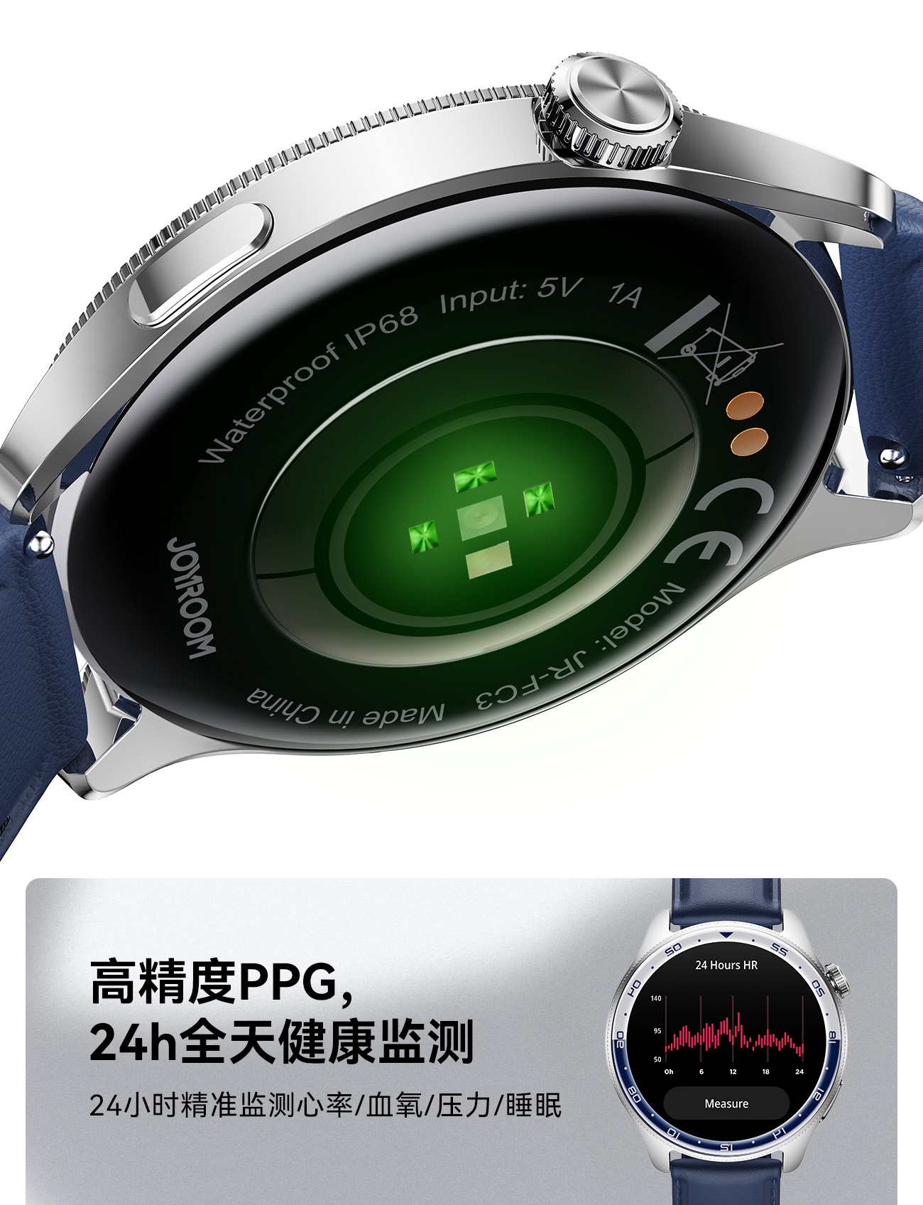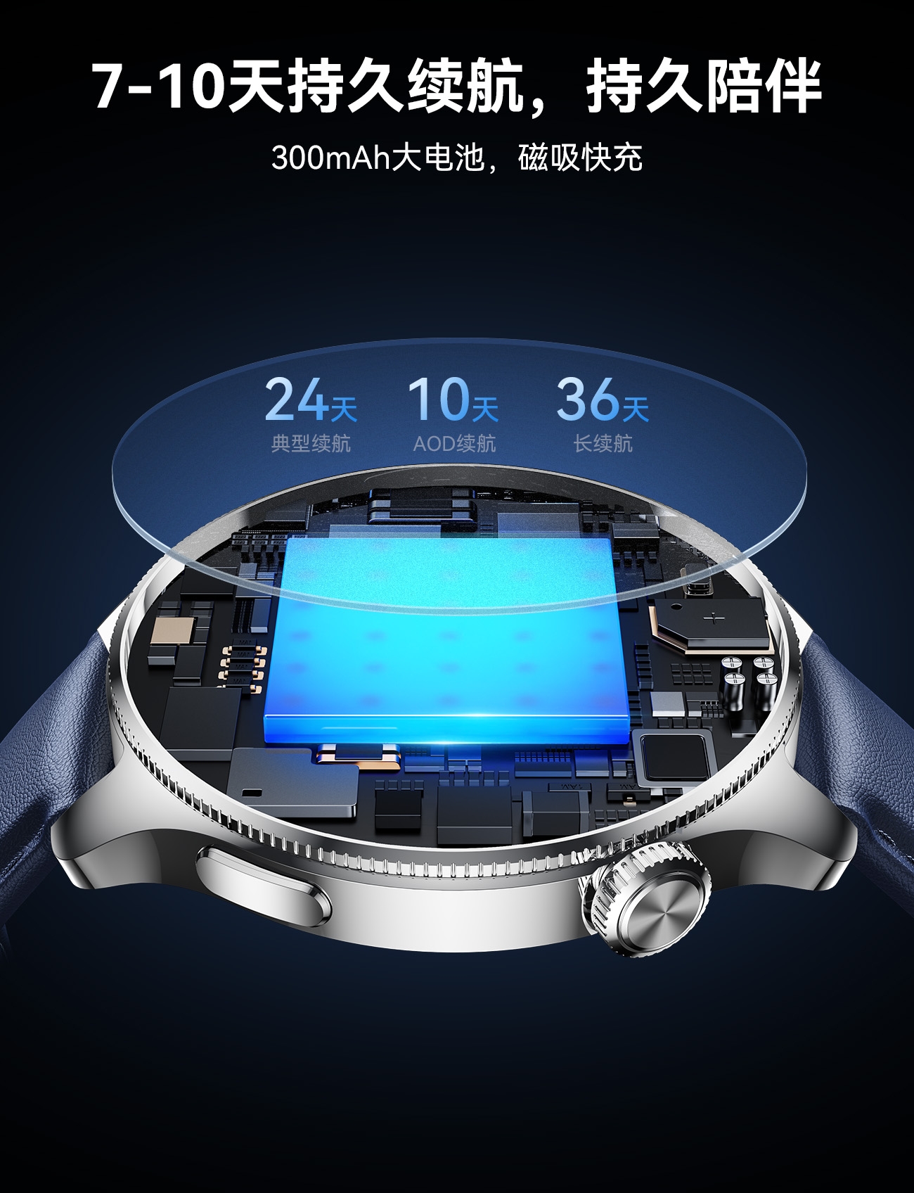 经典圆表设计,2.5D玻璃镜面,智能表冠交互;7-10天持久续航,持久陪伴;高精度PPG,24h全天健康监测、24小时精准监测