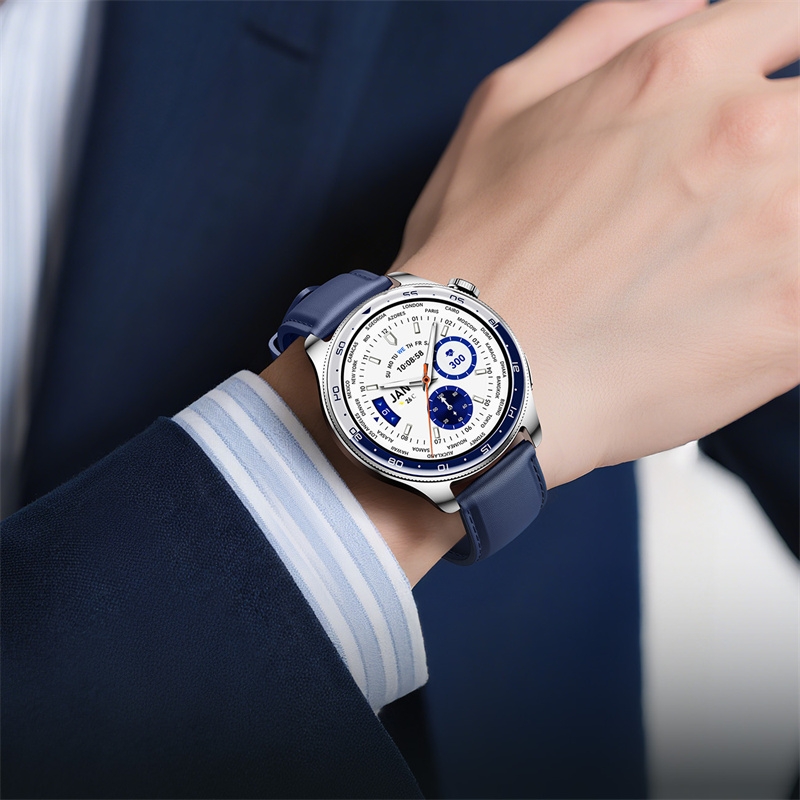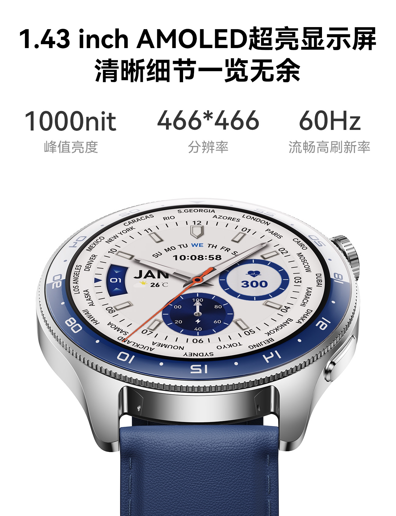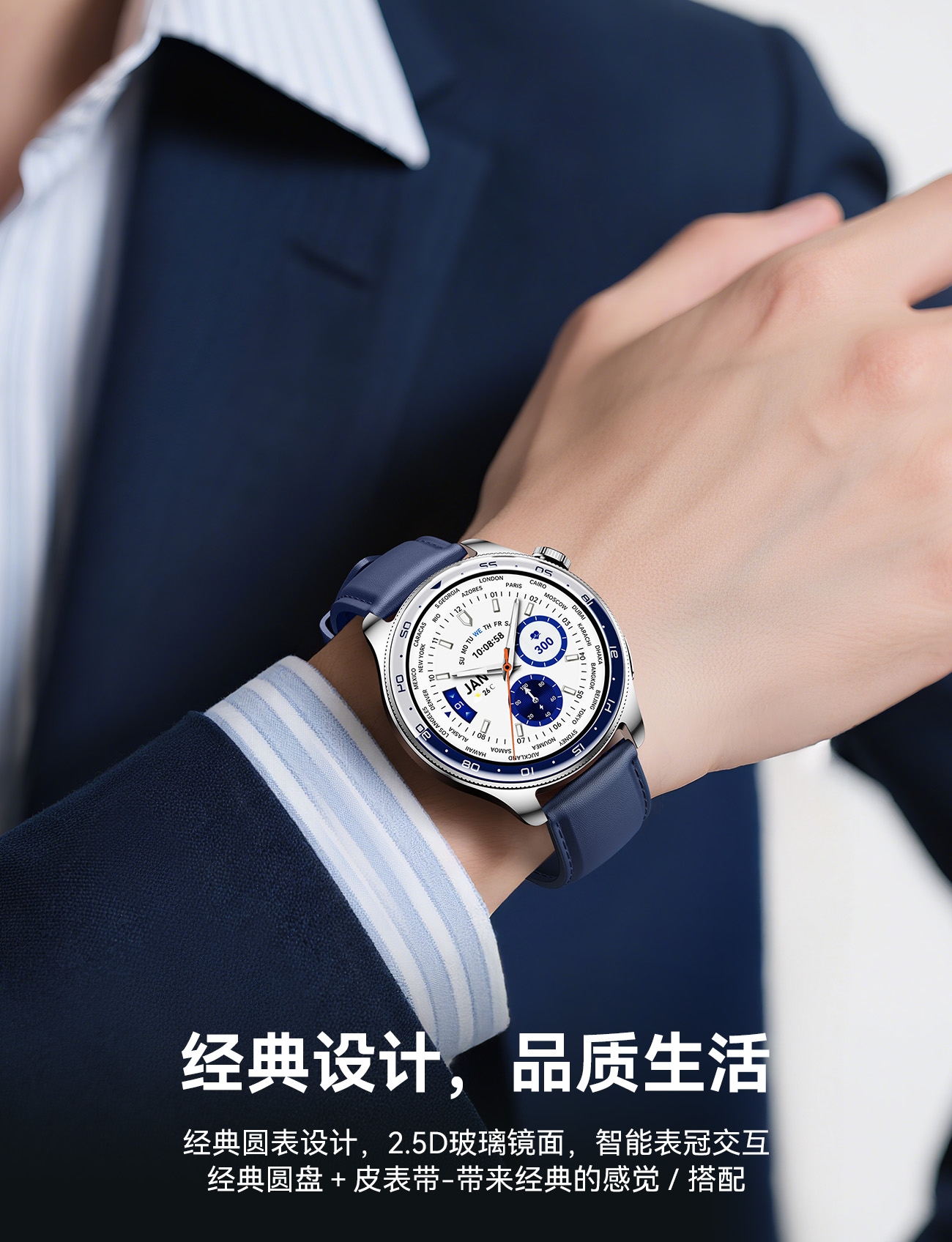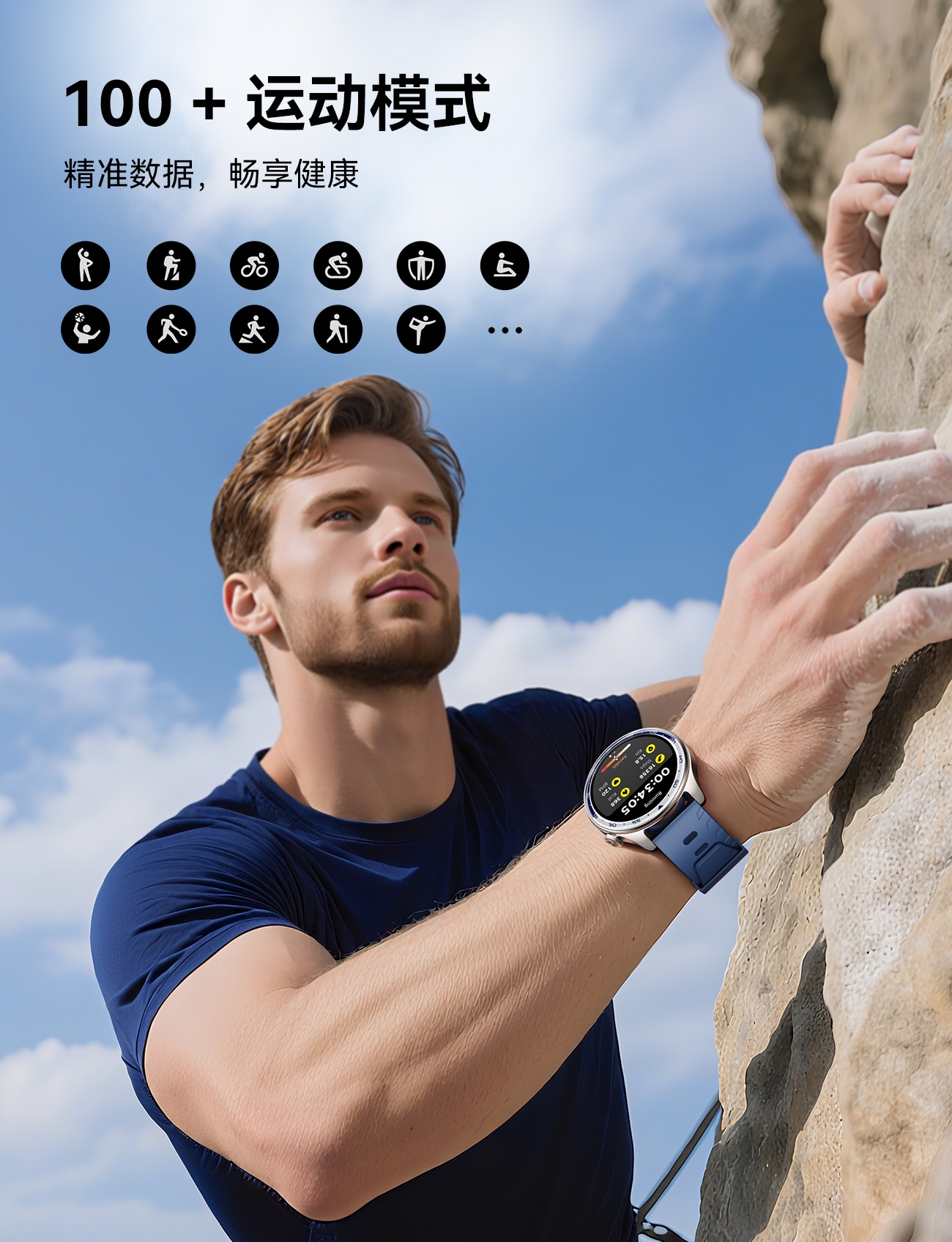 经典圆表设计,2.5D玻璃镜面,智能表冠交互;7-10天持久续航,持久陪伴;高精度PPG,24h全天健康监测、24小时精准监测