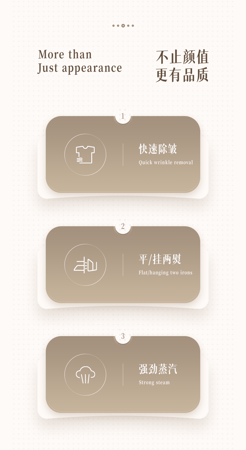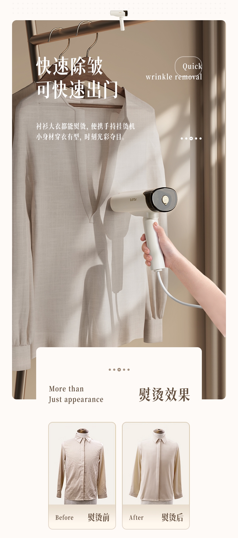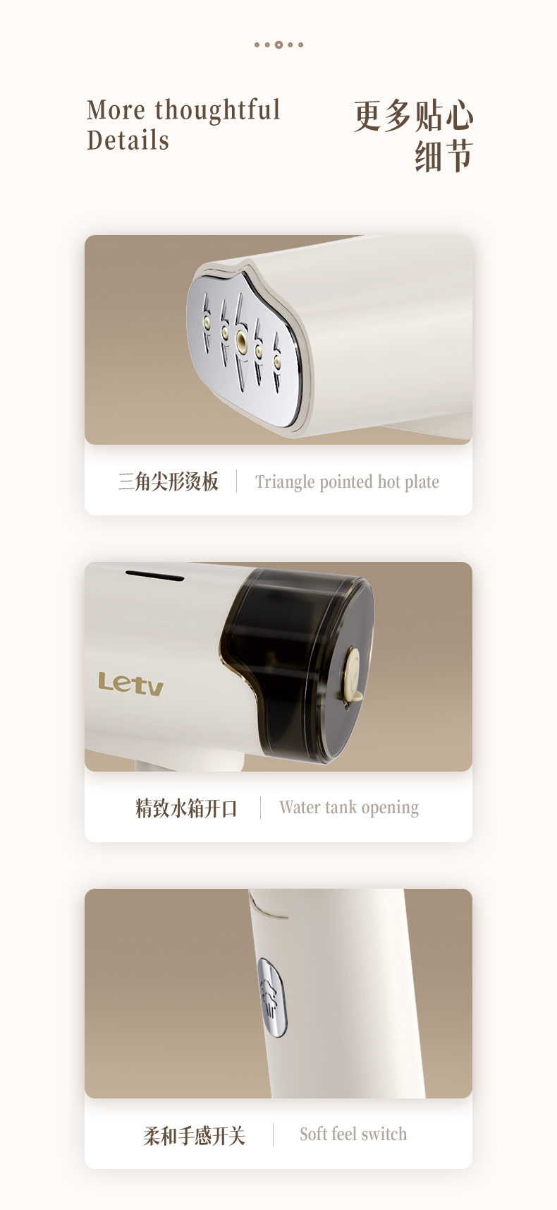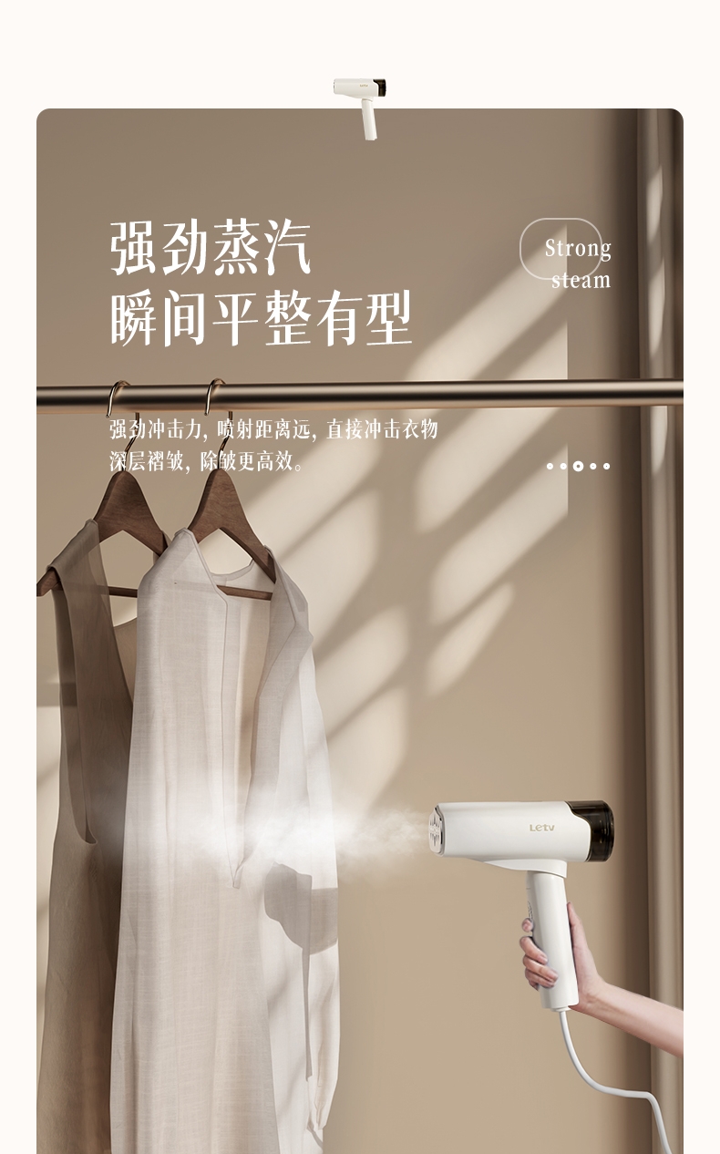 可90°折叠收纳、挂熨平熨灵活除皱;1200W大功率,轻松软化纤维抚平衣服上的皱褶;不挑面料、170ml水箱