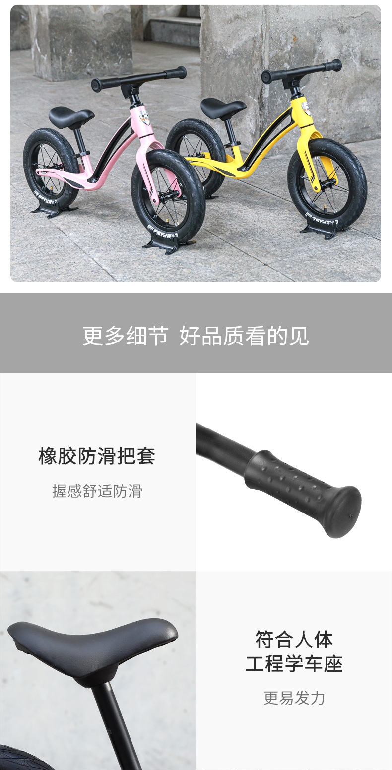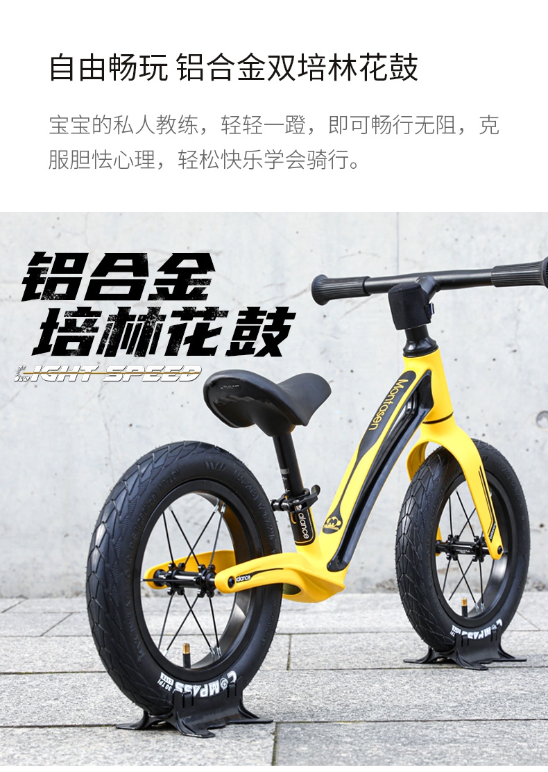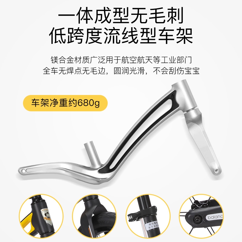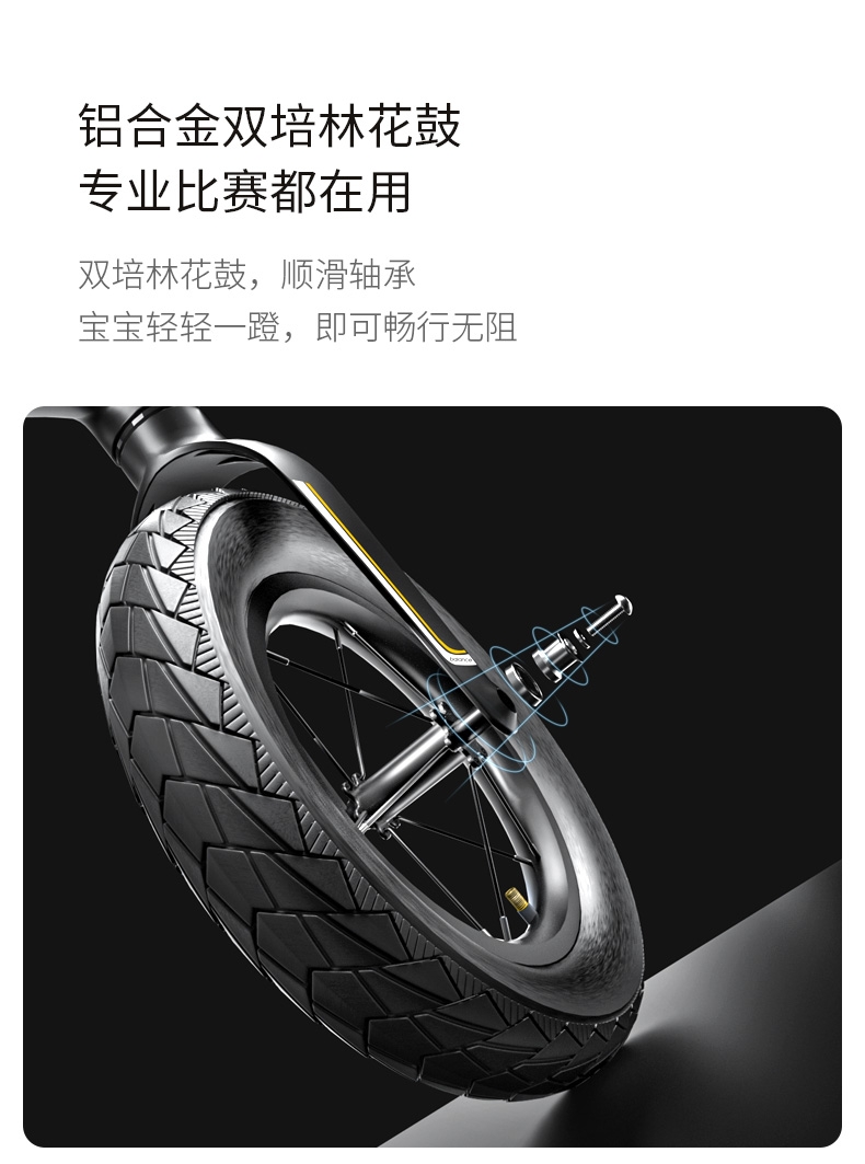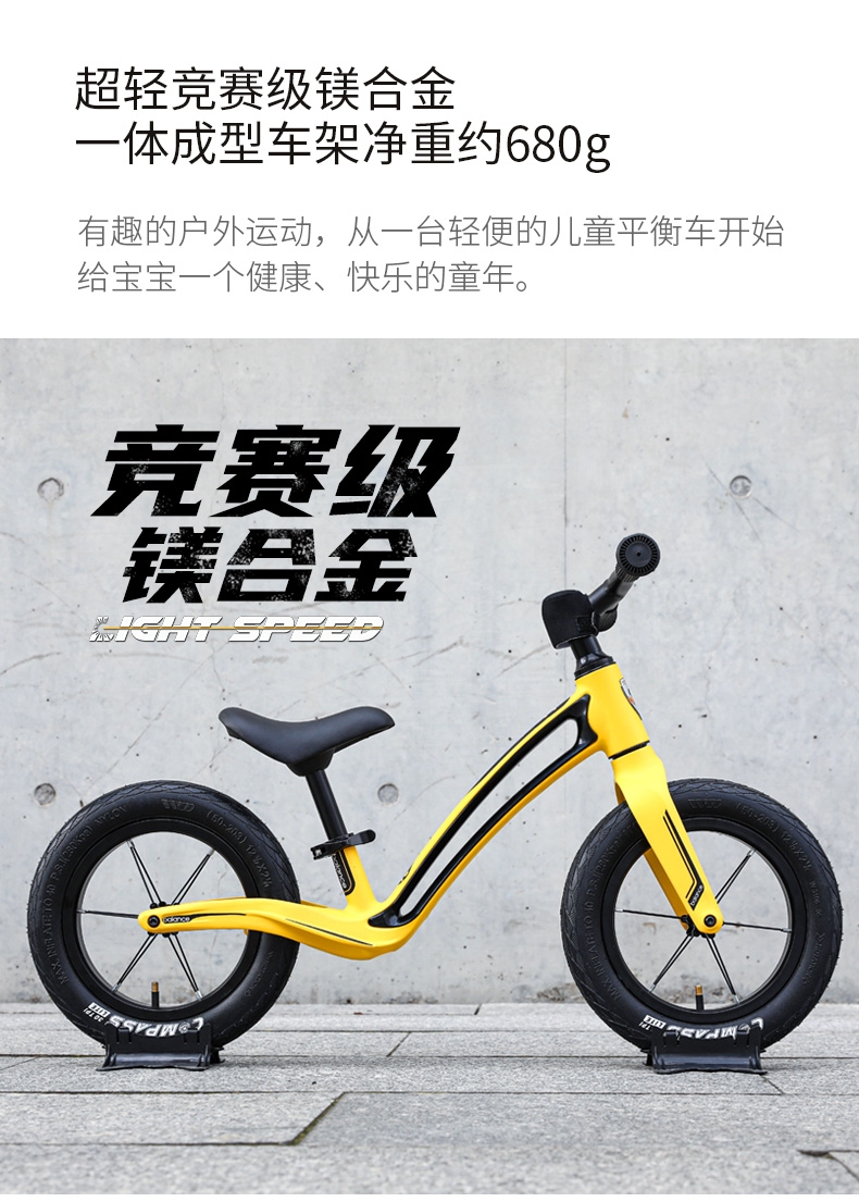 超轻竞速胎,铝合金培林花鼓,镁合金一体车架;低跨度流线型车架,上下车更简单;竞赛级轻量化镁合金儿童滑步车