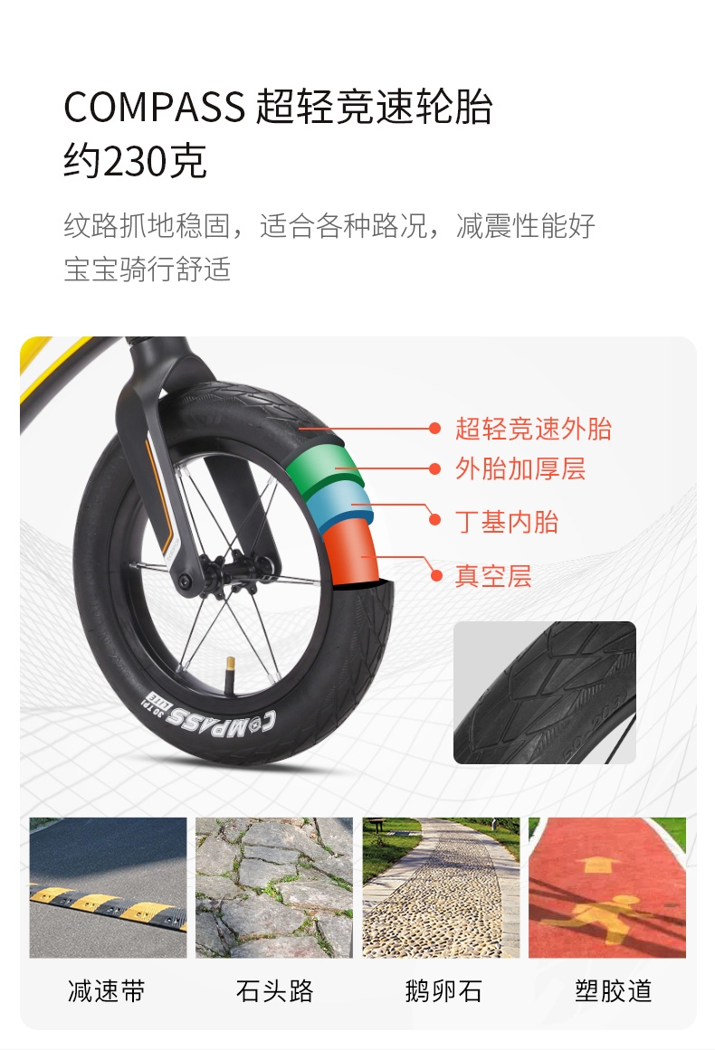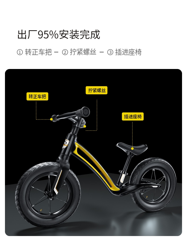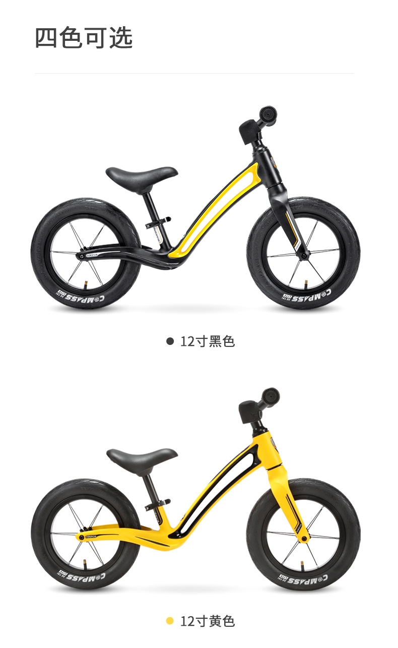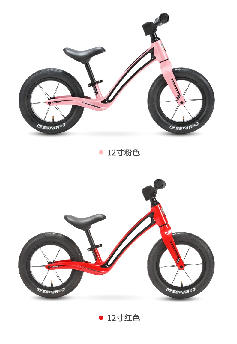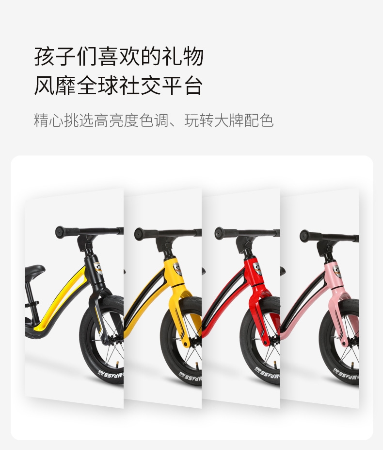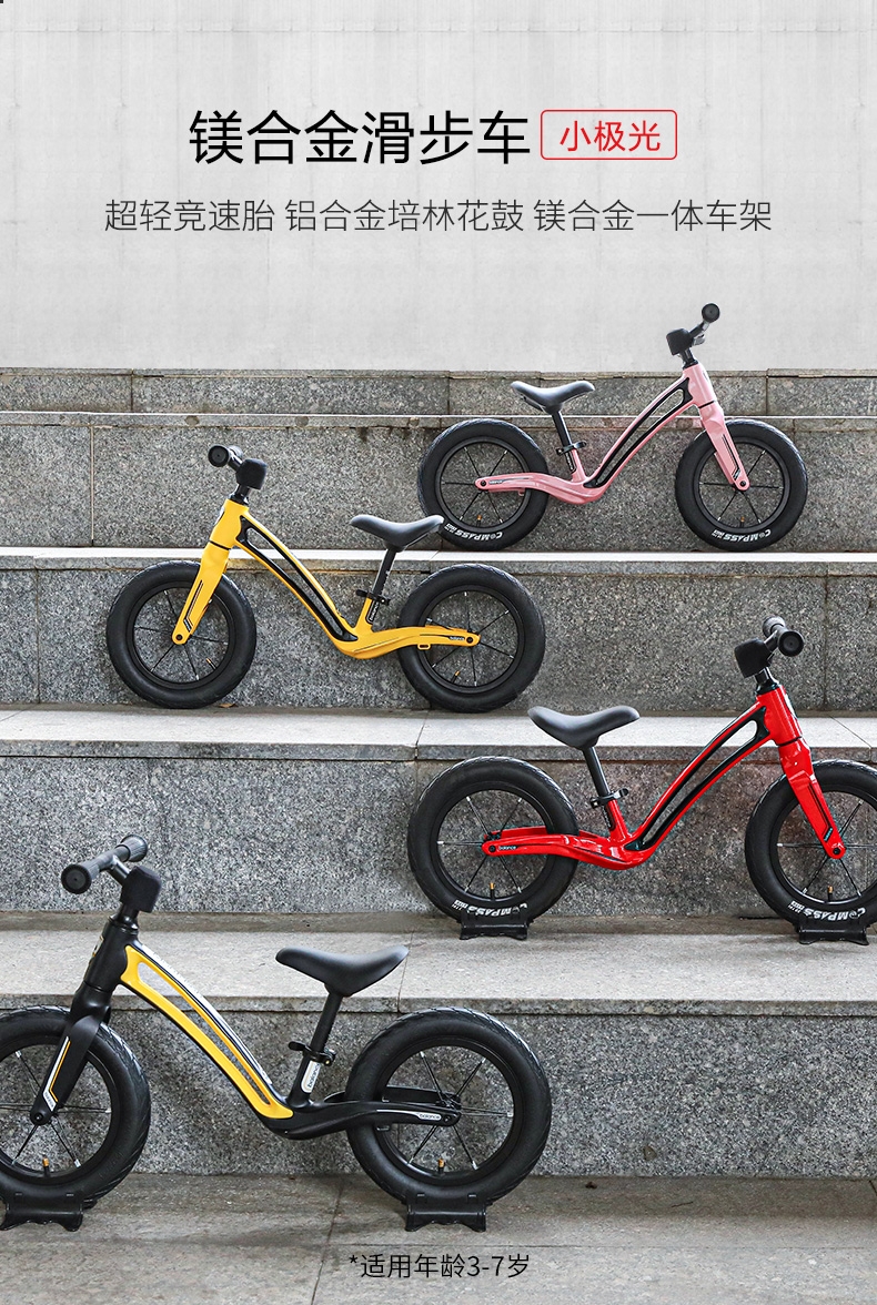 超轻竞速胎,铝合金培林花鼓,镁合金一体车架;低跨度流线型车架,上下车更简单;竞赛级轻量化镁合金儿童滑步车