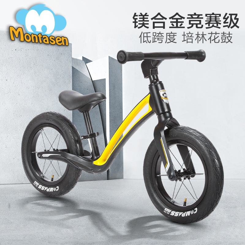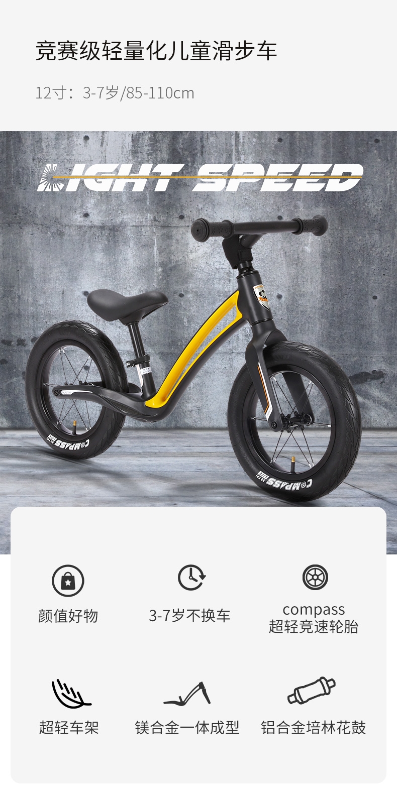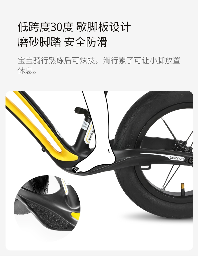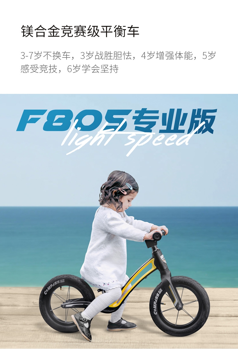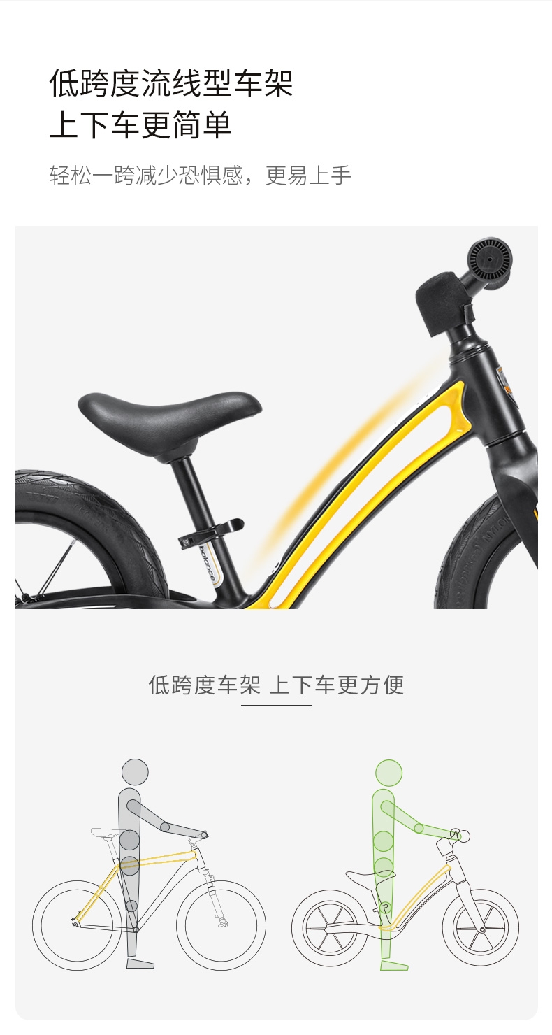 超轻竞速胎,铝合金培林花鼓,镁合金一体车架;低跨度流线型车架,上下车更简单;竞赛级轻量化镁合金儿童滑步车