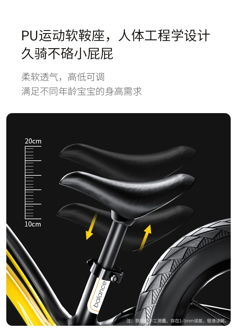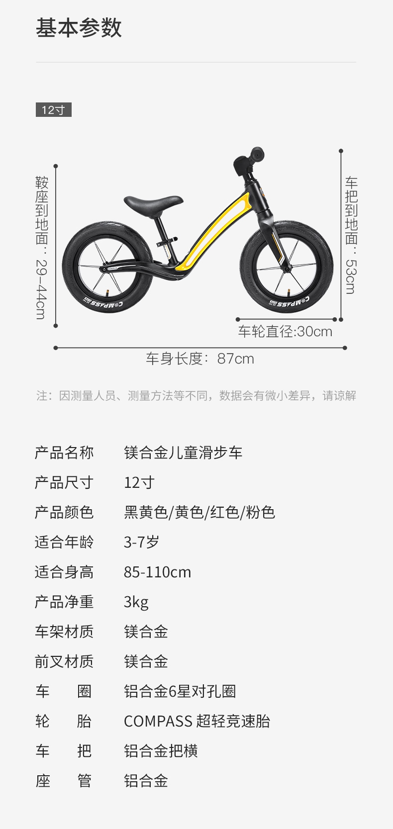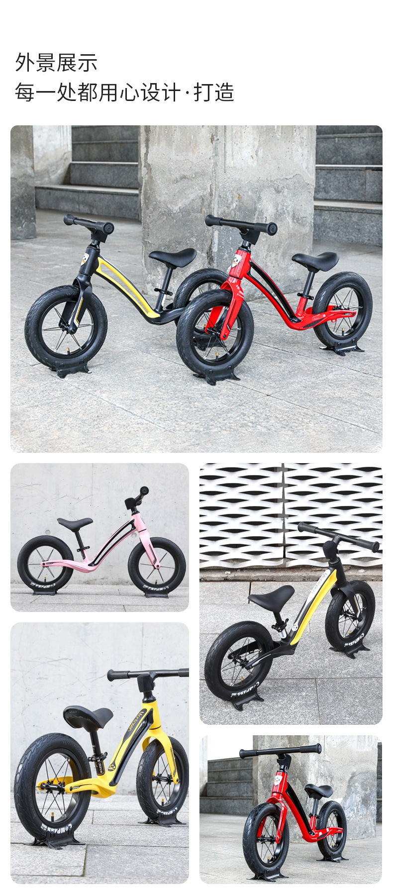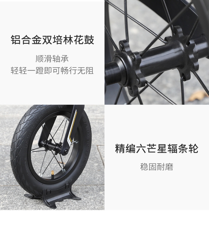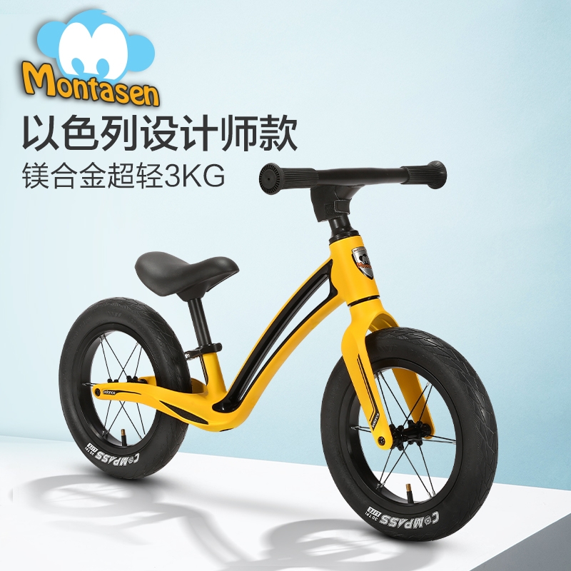 超轻竞速胎,铝合金培林花鼓,镁合金一体车架;低跨度流线型车架,上下车更简单;竞赛级轻量化镁合金儿童滑步车