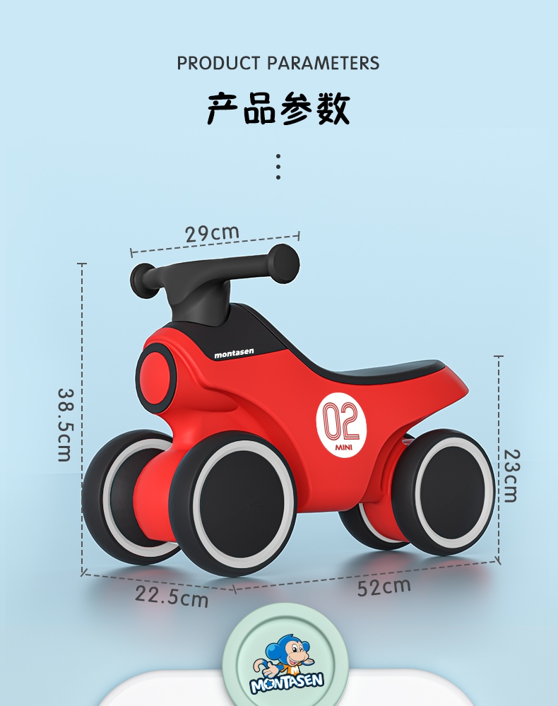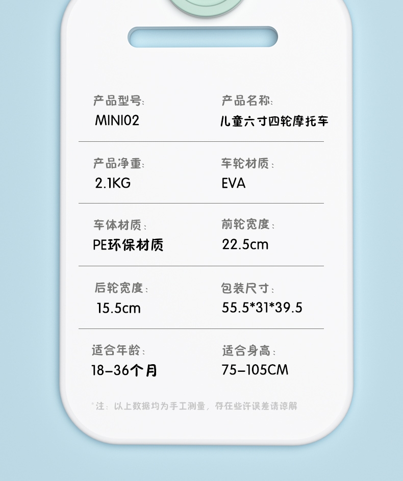 一体全封闭车身,整车净重仅3.8KG;新手宝宝不怕摔,小车20°限位转弯设计防侧翻;环保PE吹塑车身,整车无毛刺,宝宝可以放心玩