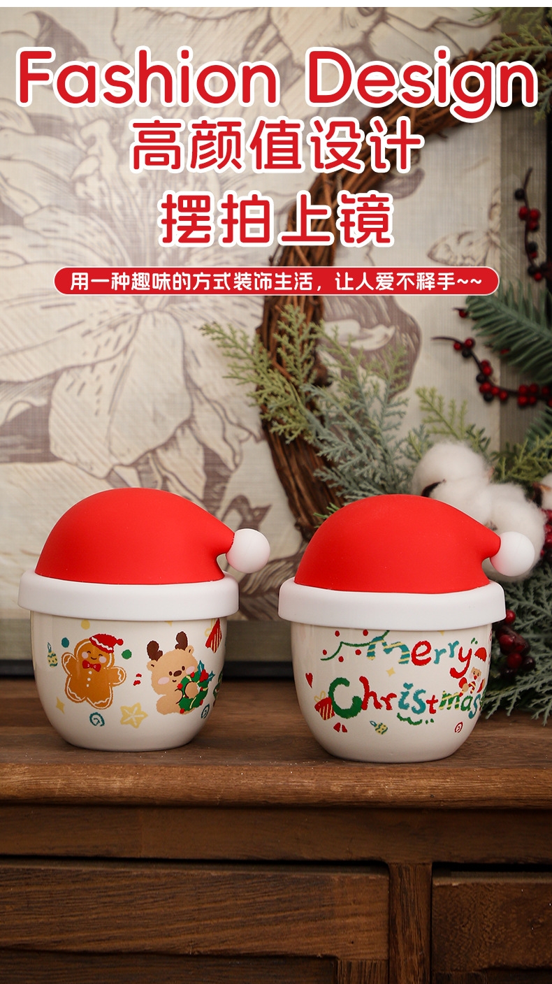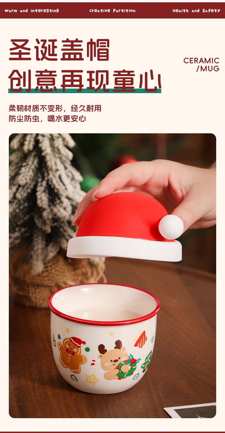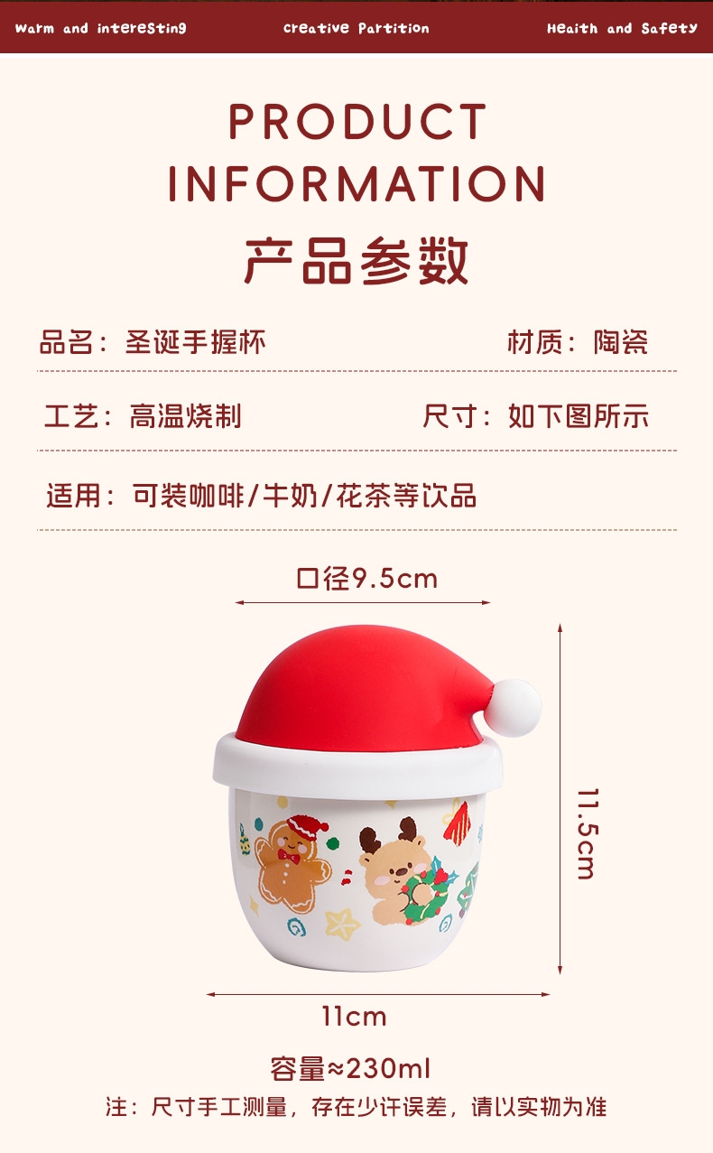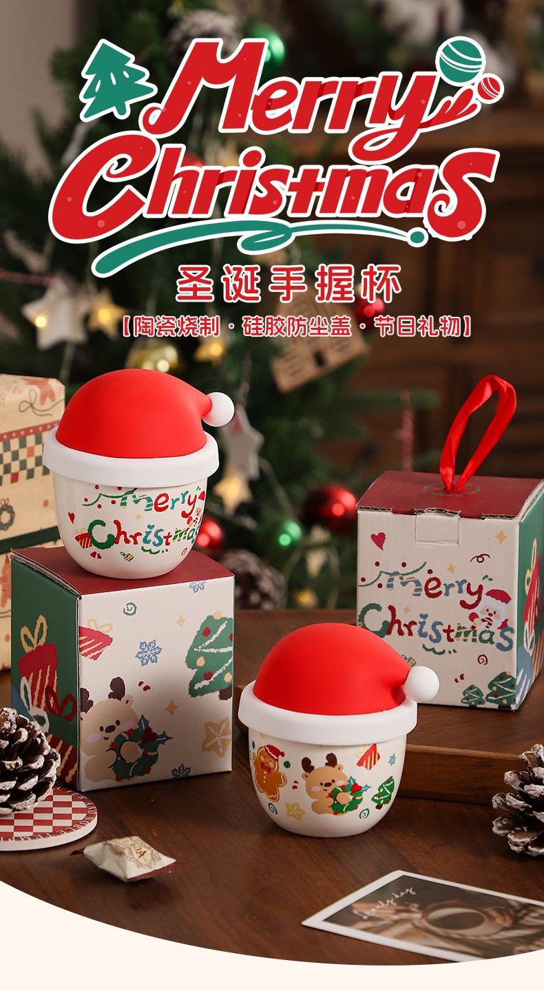 圣诞节日主题手握杯;陶瓷烧制、硅胶防尘盖;含盖,专属彩盒